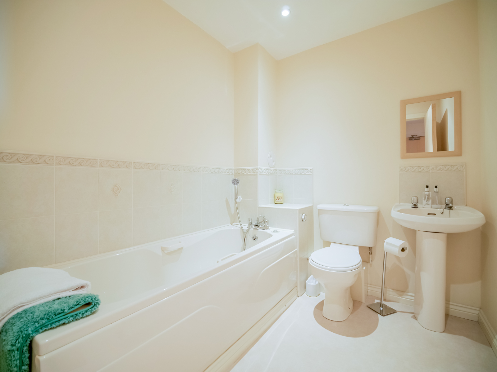The kitchen is well-appointed with a range of upper and lower wall-mounted units, an integrated oven, gas hob, and extractor fan. There's also space for a freestanding fridge-freezer and washing machine, providing flexibility for modern living. The primary bedroom is generously sized, featuring a built-in wardrobe and an en-suite shower room, complete with a wash hand basin, WC, and shower. The second bedroom, also a spacious double, is currently being used as a single but offers ample space and comes with a built-in wardrobe and additional cupboard for storage. The main bathroom is a well-designed space, featuring a wash hand basin, WC, and a bath with an overhead shower, ideal for relaxing or quick, convenient use.