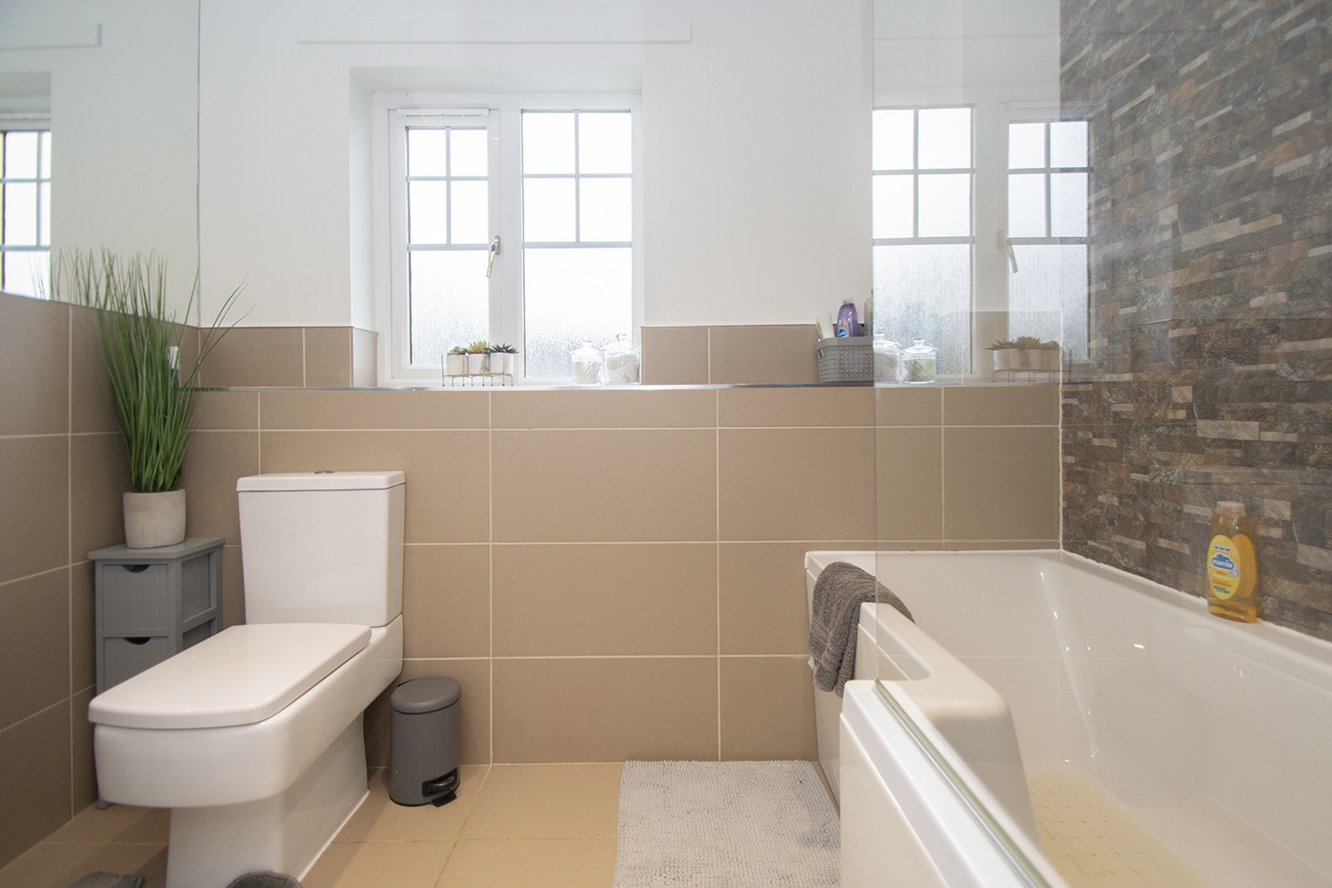 Modern two piece suite with tiles floor and walls.