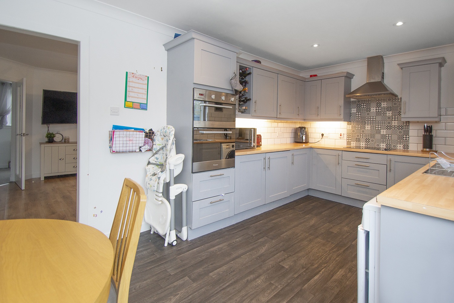 Well fitted modern kitchen with ample base and wall units. Stainless steel sink. Plumbing for washing machine and dishwasher. Integrated hob, hood and double oven. Integrated fridge freezer. Tiling above work surfaces. Quality vinyl flooring. Large storage cupboard. Recessed spotlights. Ample power points. Radiator.