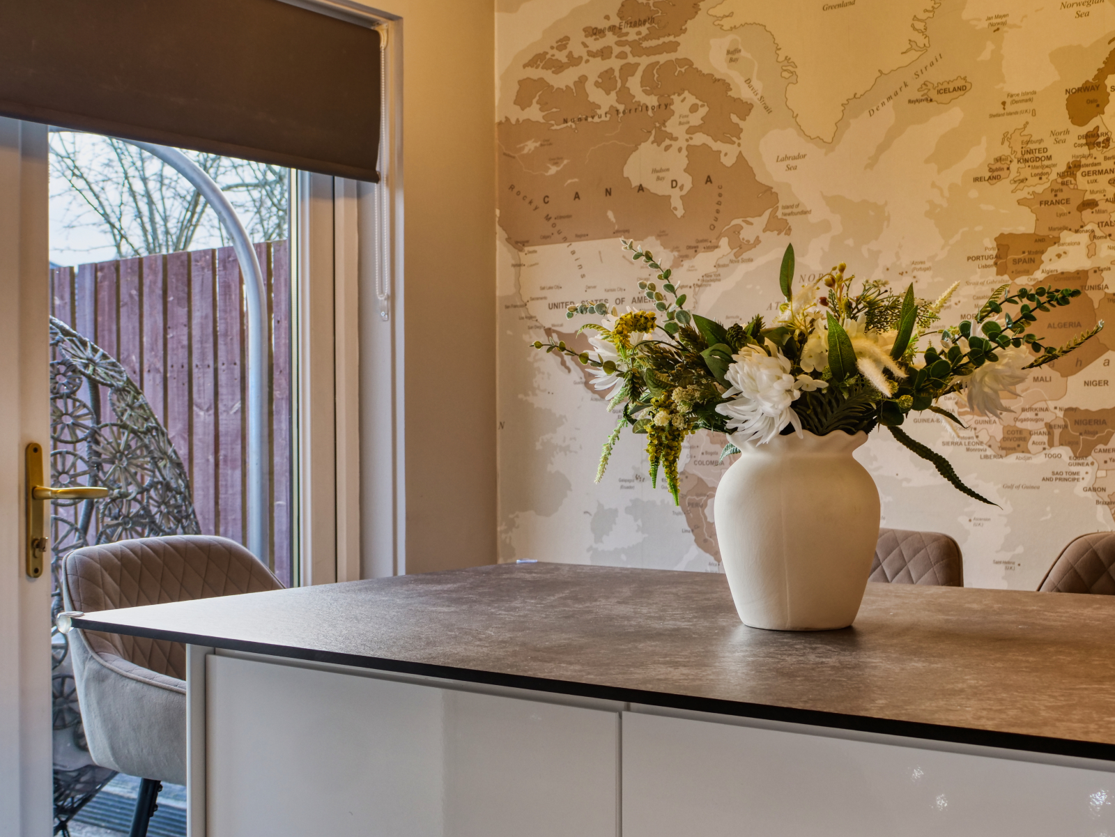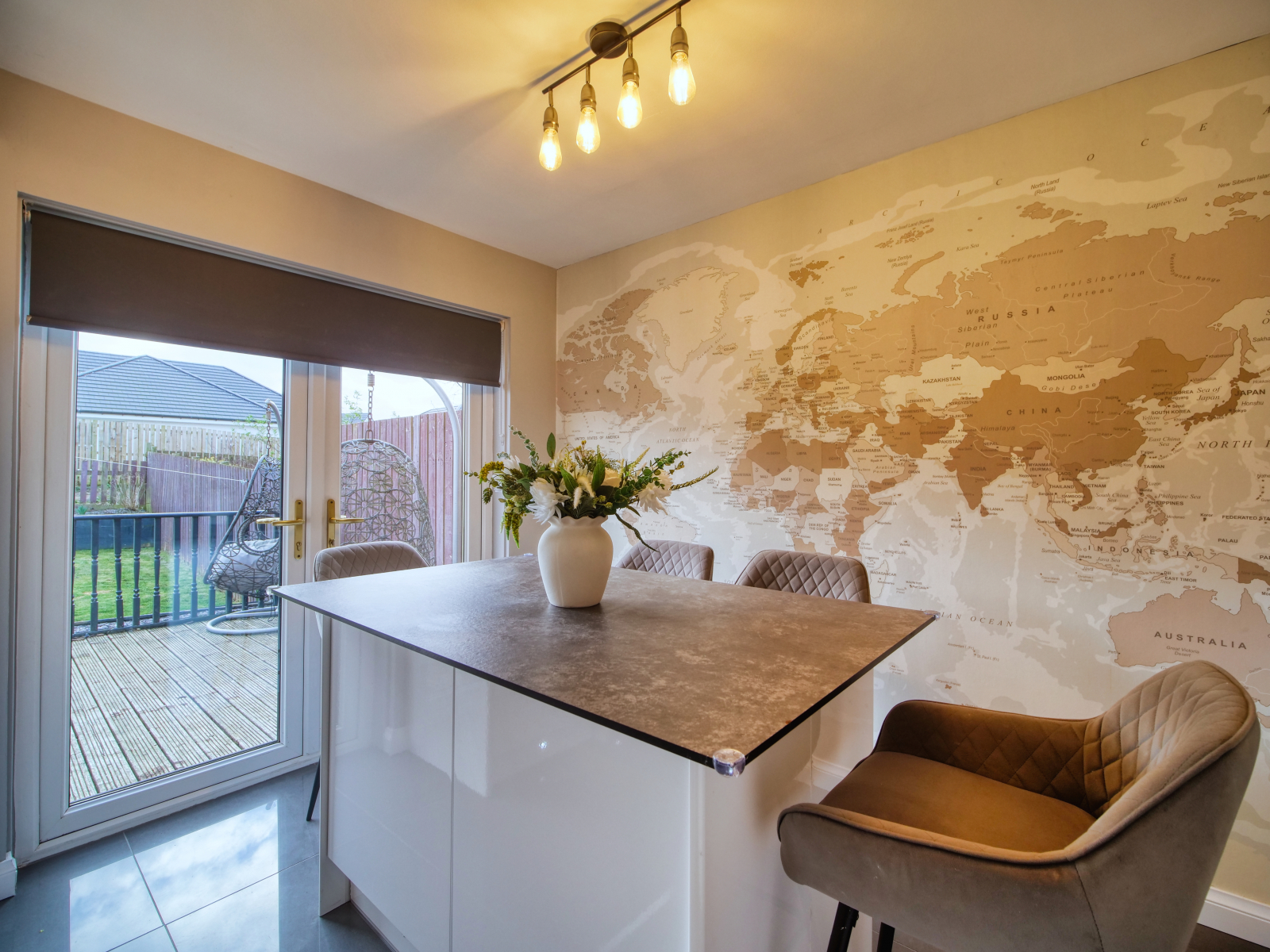- Contemporary fitted kitchen with island dining area