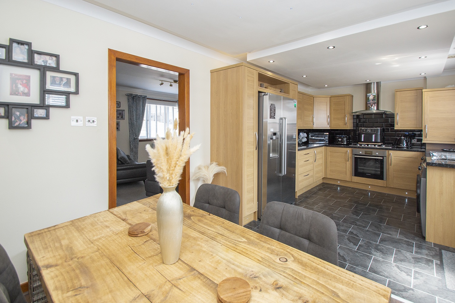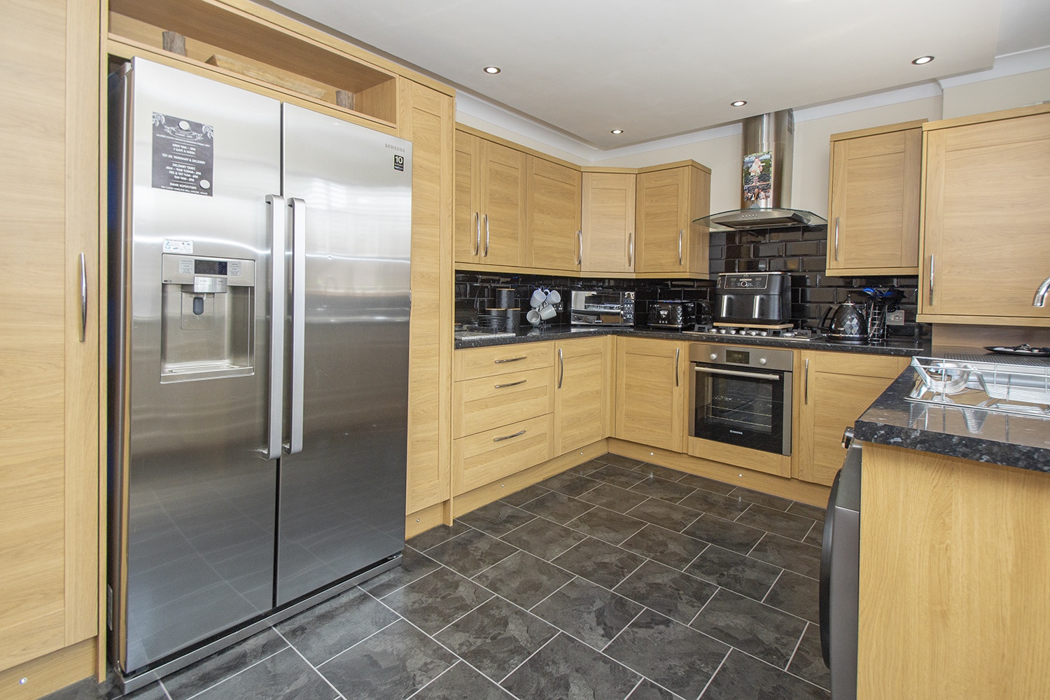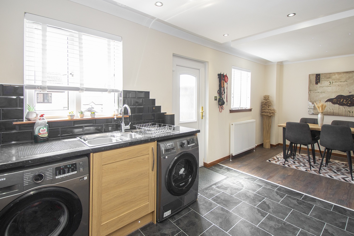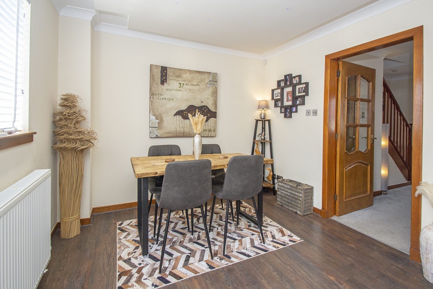 The accommodation is formed over two levels, with the lower level comprising entrance vestibule leading to the well-proportioned front facing lounge, which in turn gives access to the open plan dining kitchen. The kitchen houses an ample range of base and wall units with complementary worktops and tiled splash-back areas, integrated gas hob, electric oven and extractor hood, twin rear facing windows which allow an abundance of natural light to flow through. The upper-level accommodation is accessed from the staircase in the lounge and houses the three bedrooms, with the two larger bedrooms having built-in wardrobes with sliding mirrored doors. Four-piece family bathroom comprising wc, wash hand basin, bath and corner shower cubicle.