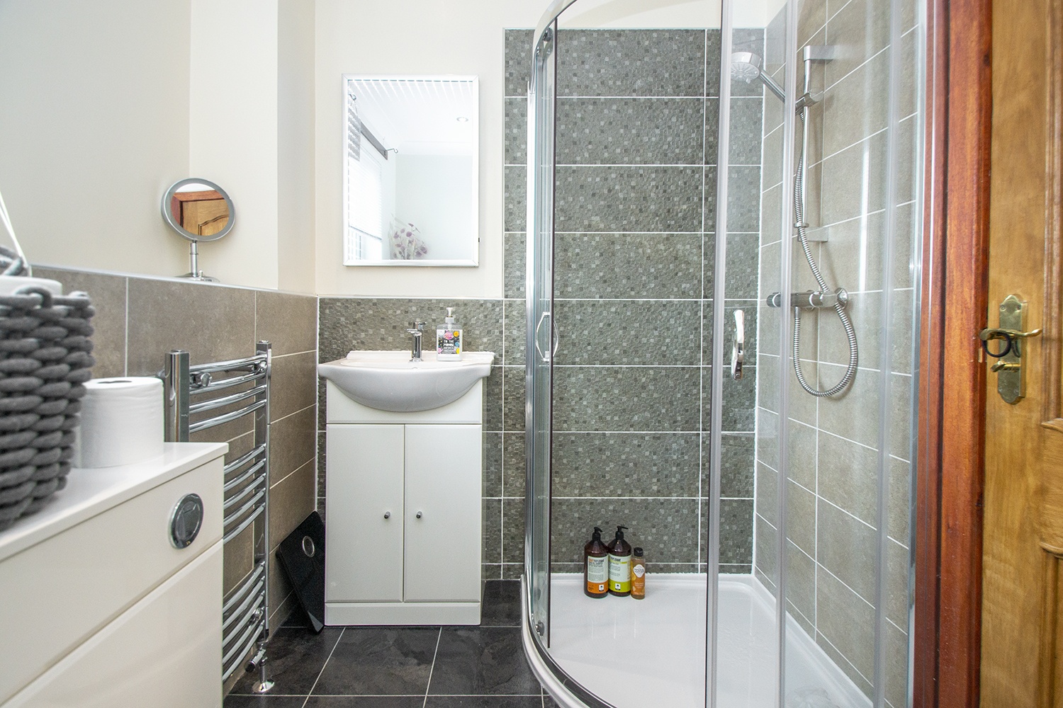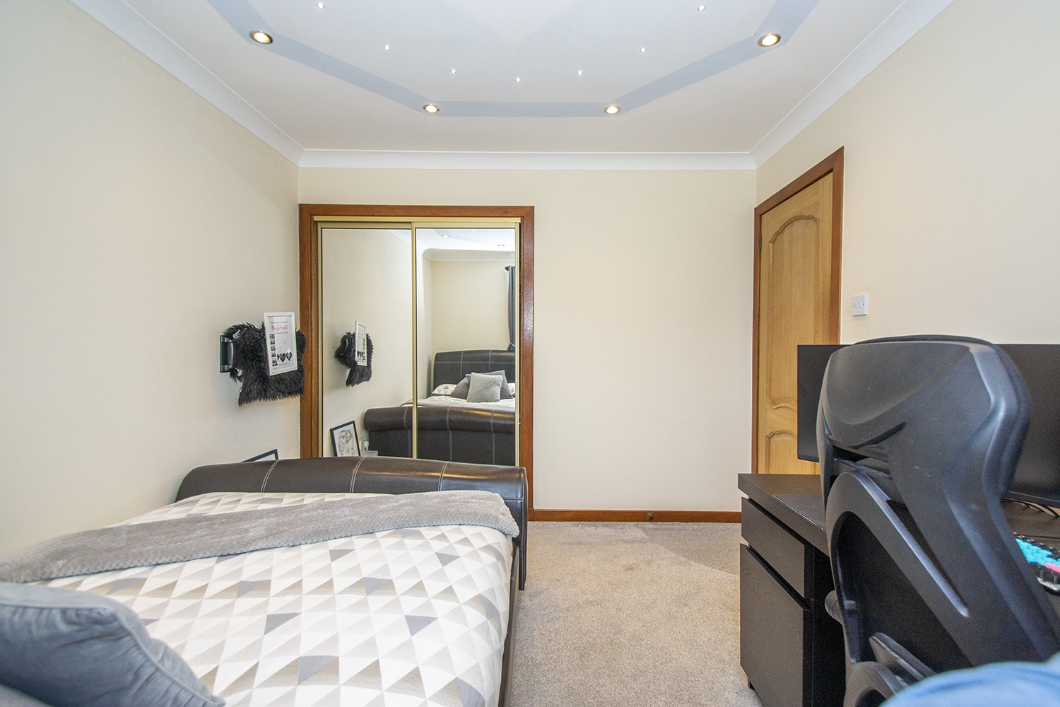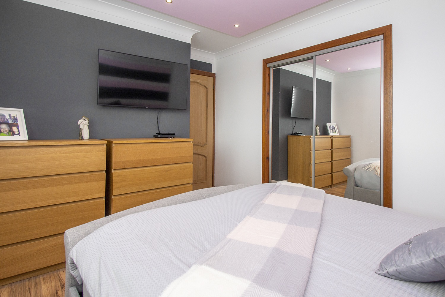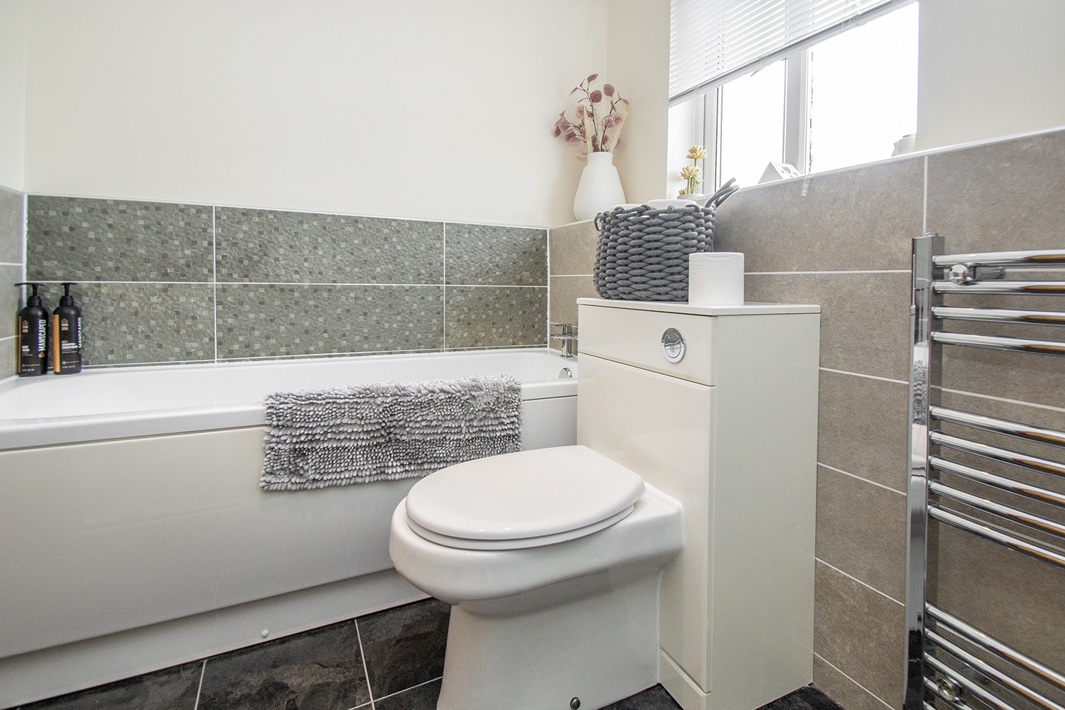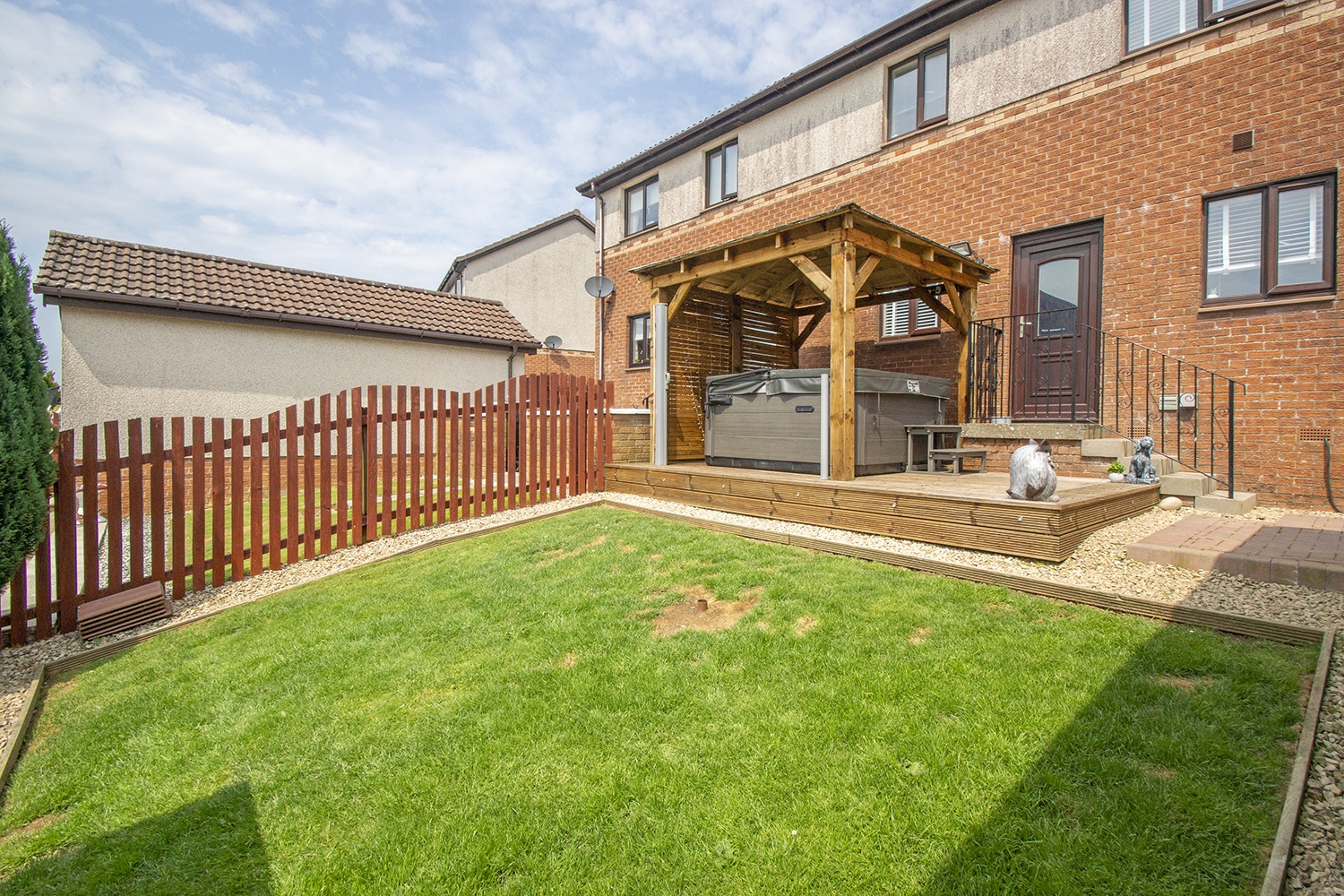 The accommodation is formed over two levels, with the lower level comprising entrance vestibule leading to the well-proportioned front facing lounge, which in turn gives access to the open plan dining kitchen. The kitchen houses an ample range of base and wall units with complementary worktops and tiled splash-back areas, integrated gas hob, electric oven and extractor hood, twin rear facing windows which allow an abundance of natural light to flow through. The upper-level accommodation is accessed from the staircase in the lounge and houses the three bedrooms, with the two larger bedrooms having built-in wardrobes with sliding mirrored doors. Four-piece family bathroom comprising wc, wash hand basin, bath and corner shower cubicle.
