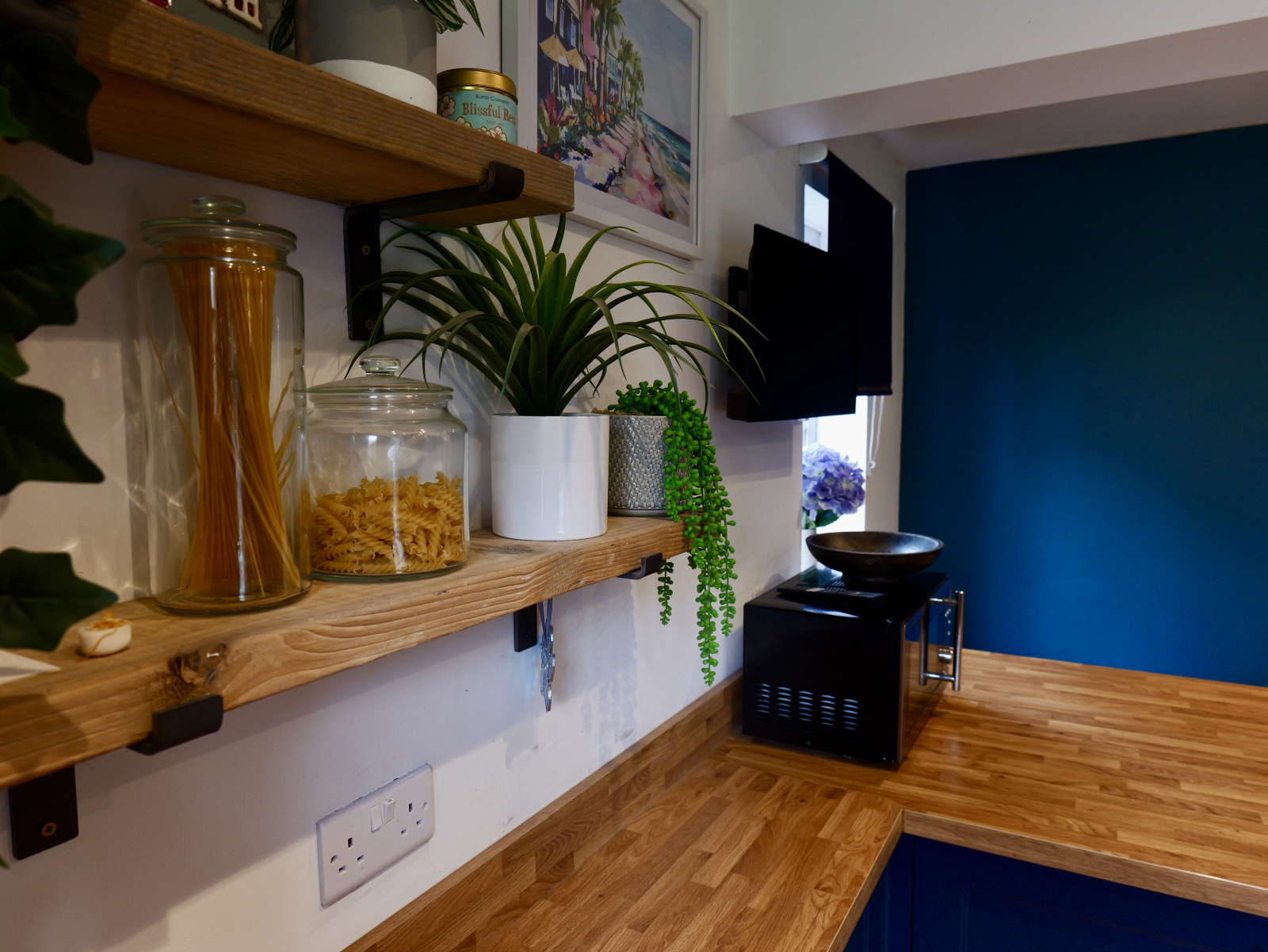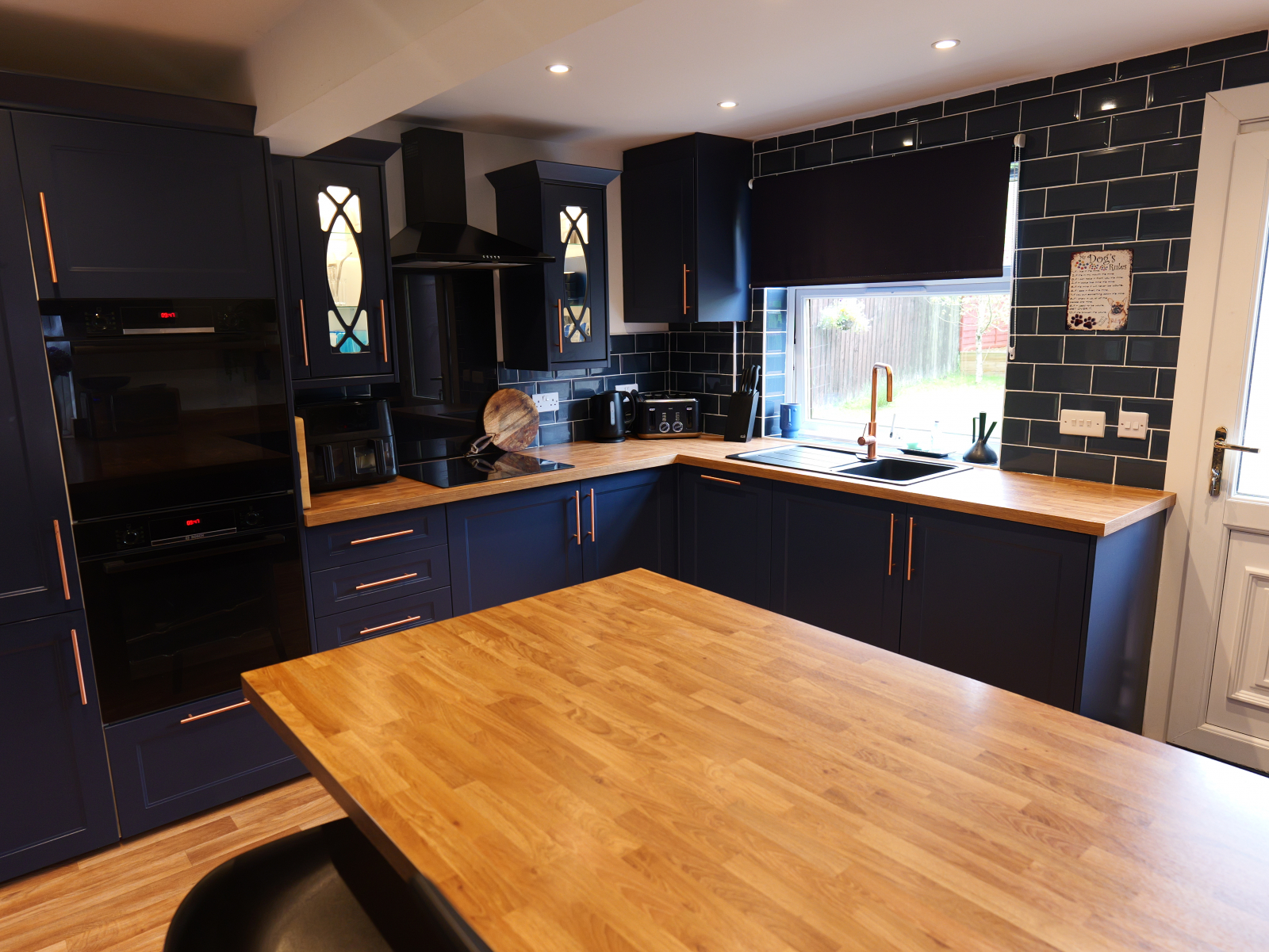 - Modern fitted kitchen with ample base and wall units, complementary worktops, and integrated appliances