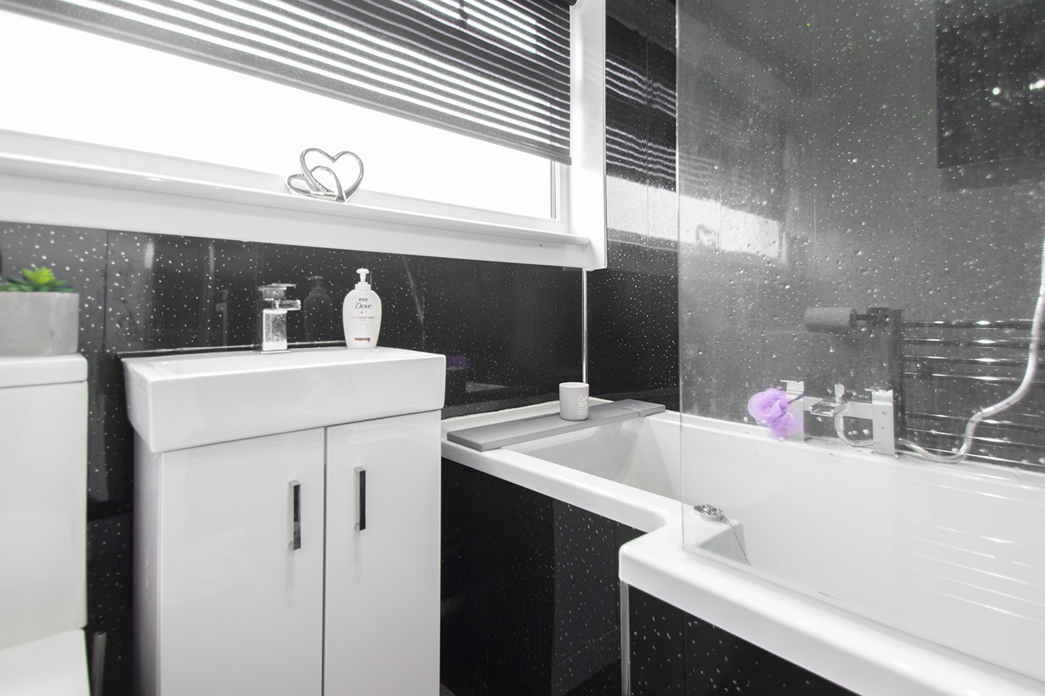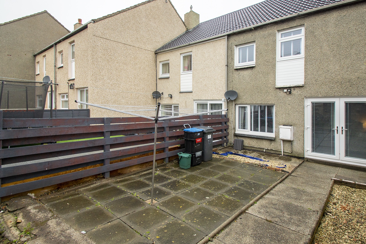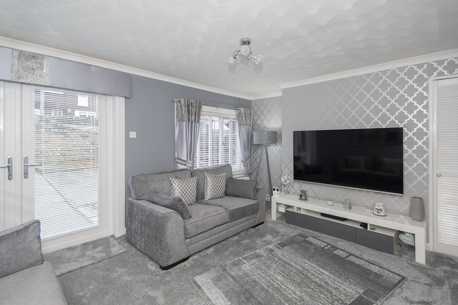 The accommodation is formed over two levels comprising entrance hallway leading to a bright and spacious lounge with modern décor and French doors opening to the rear garden, which allows an abundance of natural light to flow through. The kitchen houses an ample range of base and wall units with complementary worktops, breakfasting area, integrated hob and oven. Plumbing for washing machine. Staircase to upper level giving access to two good sized bedrooms, one with fitted wardrobes. There is also a modern family bathroom comprising of ‘P’ shaped bath with over the bath shower, W.C and wash hand basin.