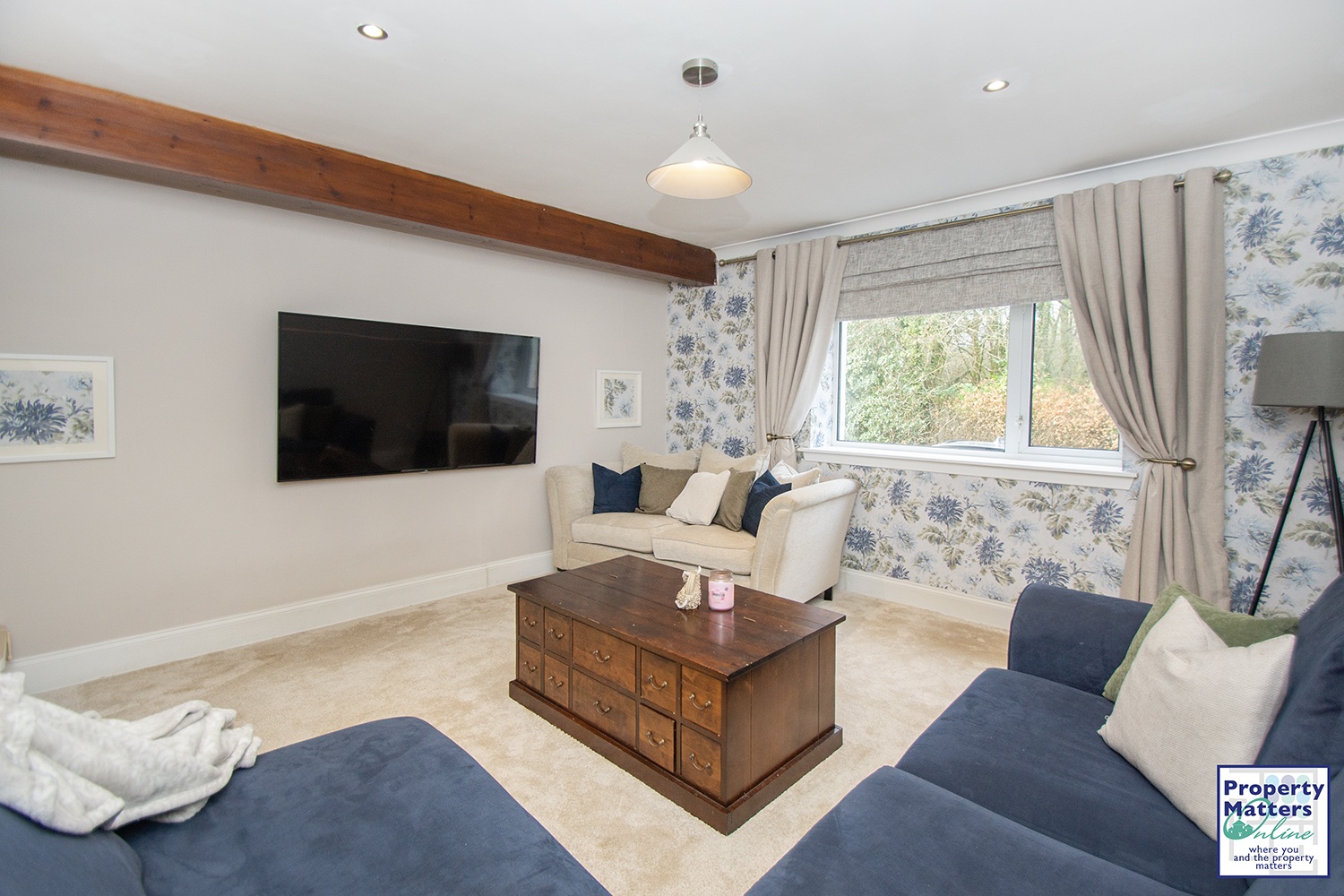 - Separate dining room and bright living room with exposed wooden beam