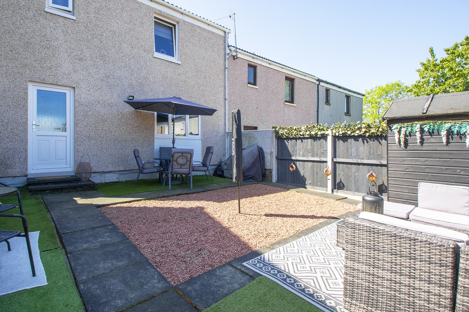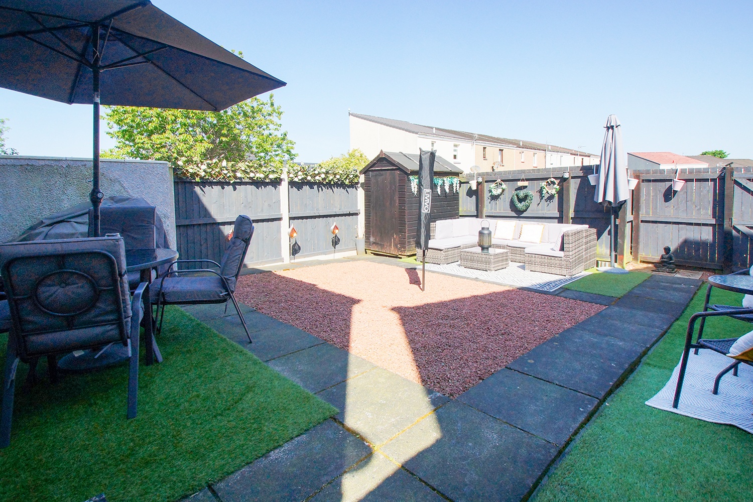 Fully enclosed private landscaped rear garden with artificial grass, chipped and paved areas. Wooden shed. The garden is a great space for relaxation and entertainment. There is also a rea gate which allows access to a common walking area.
