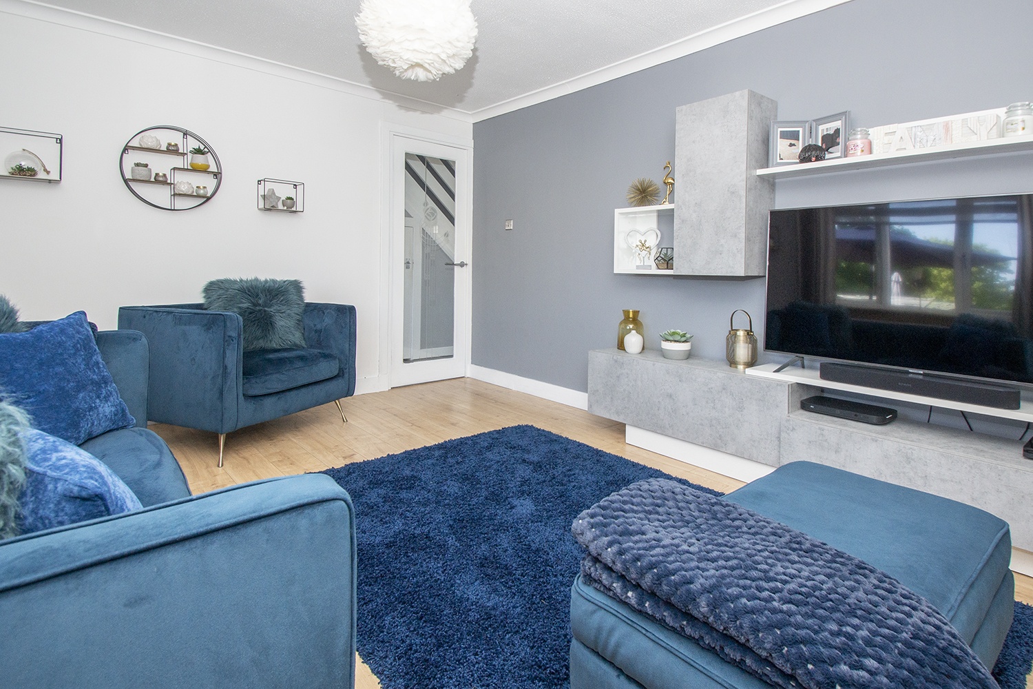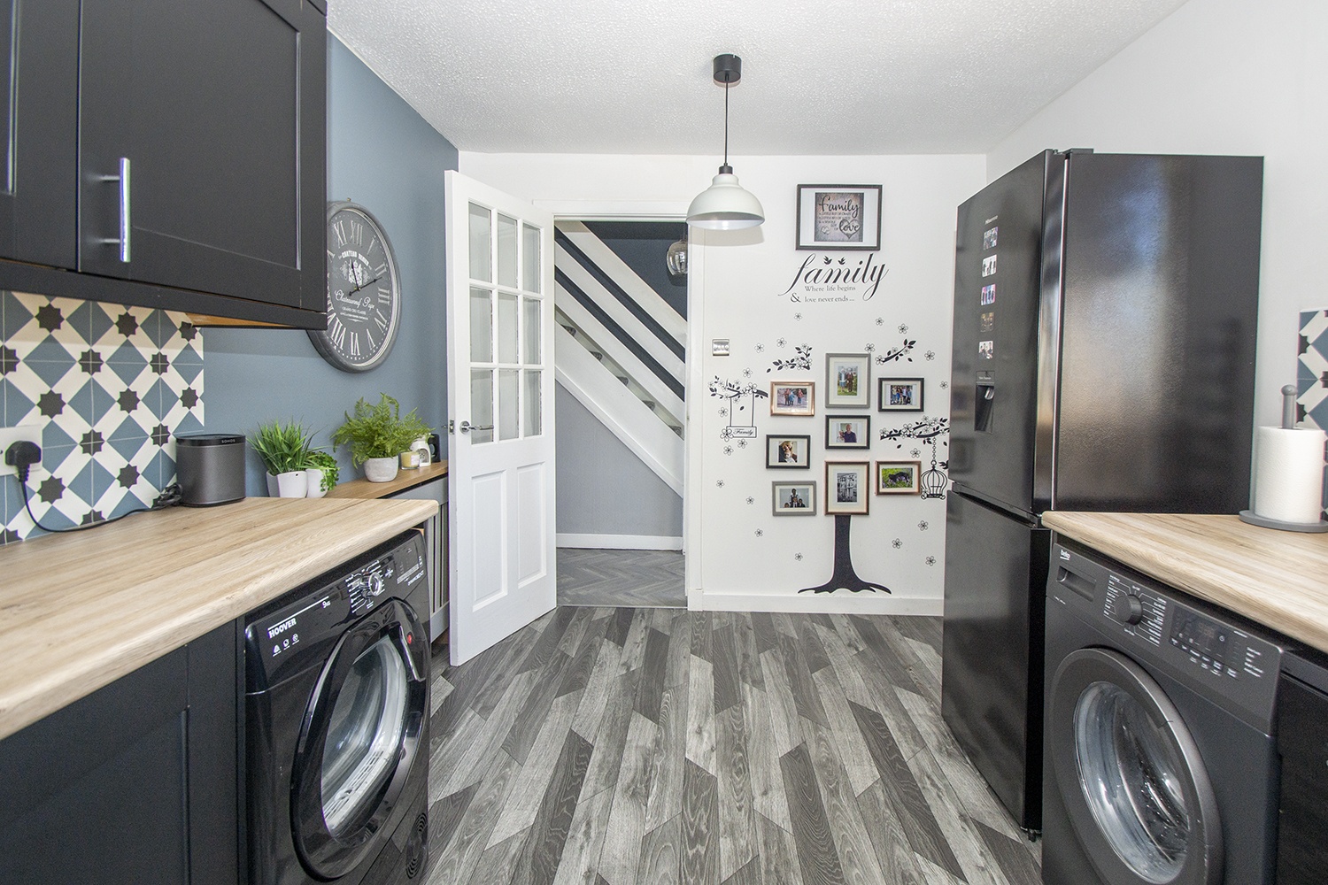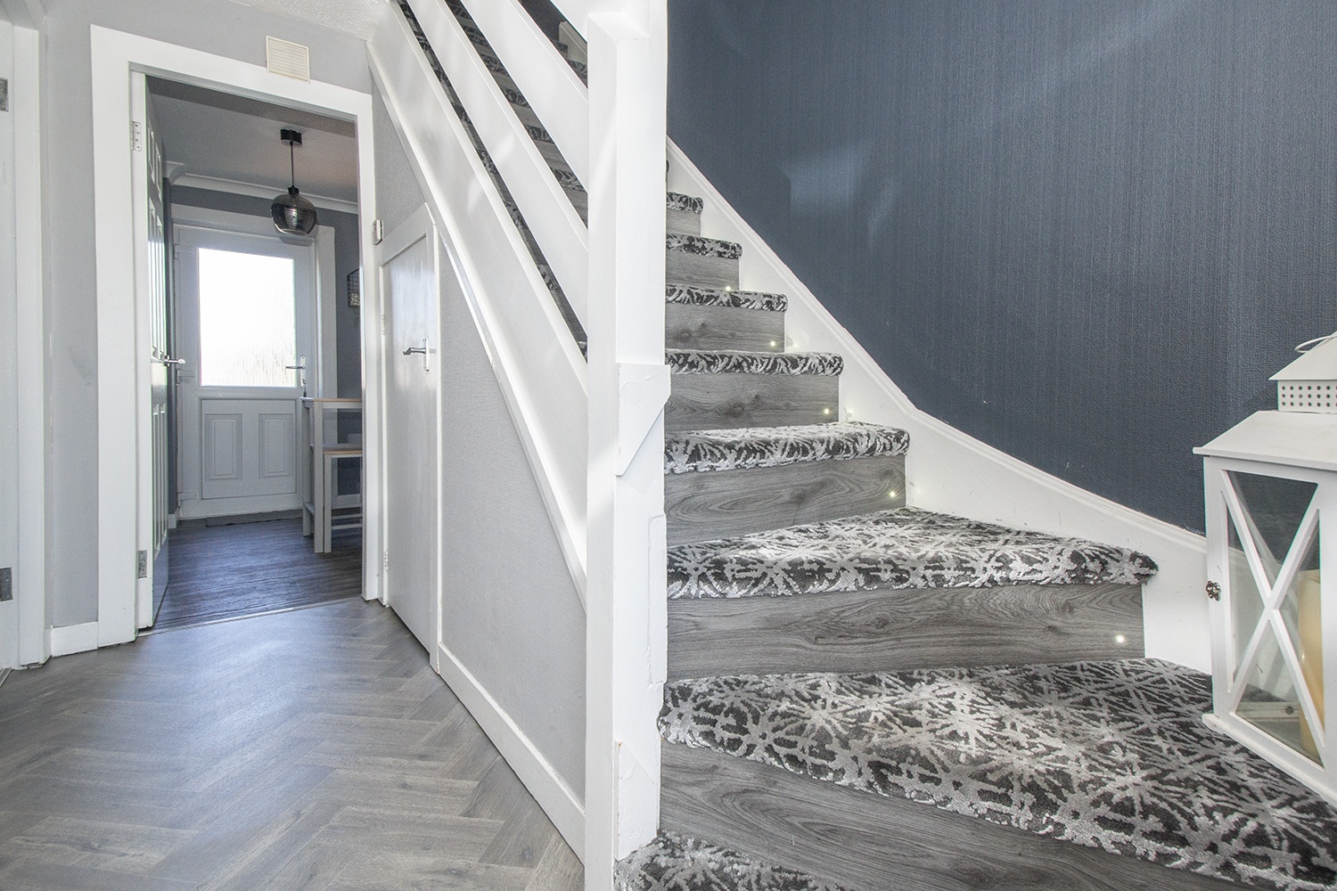 Entered via double door into spacious entrance hallway Quality flooring. Handy under stair storage cupboards. Carpeted staircase to upper level with led lighting.