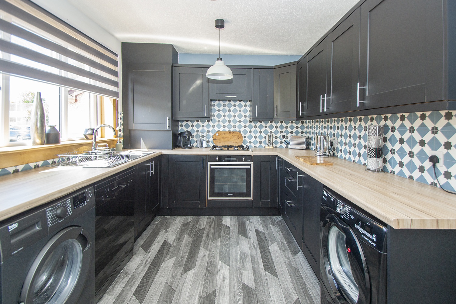 Modern kitchen with shaker units and complimentary worktops and tiled splashbacks. Integrated gas hob with extractor hood and electric oven. Inset sink with mono tap. Plumbing for washing machine and plumbing for dishwasher. Modern neutral décor. Ample power points.