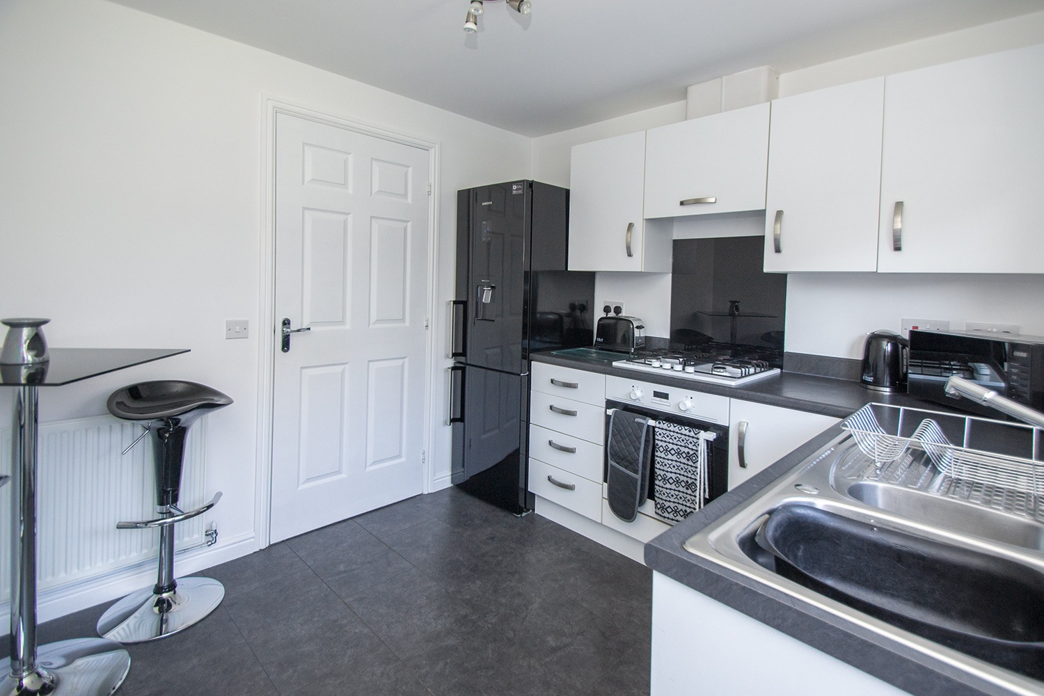 Well-fitted kitchen diner with a range of modern base and wall units with rear facing window formation. Complimentary worktops. Integrated electric oven and gas hob with extractor hood. Inset stainless steel sink with mono tap. Rear door gives access to garden. Ample power points.