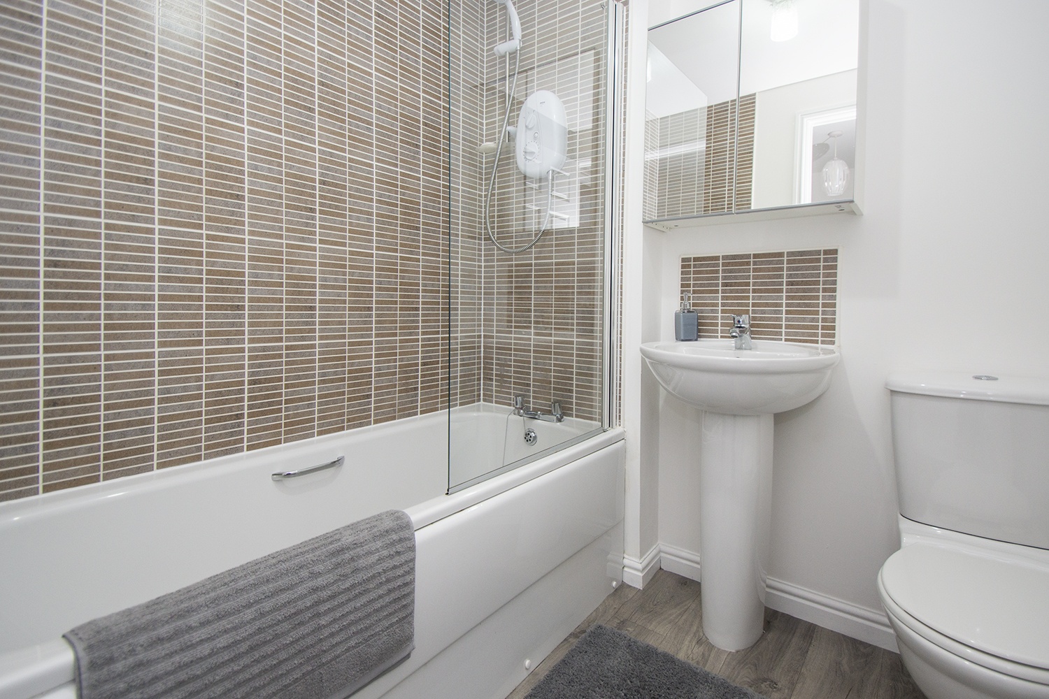 3 piece suite comprising white WC, wash hand basin and bath with overhead shower. Modern tiling surrounding bath and sink area. Extractor fan. Laminate flooring.