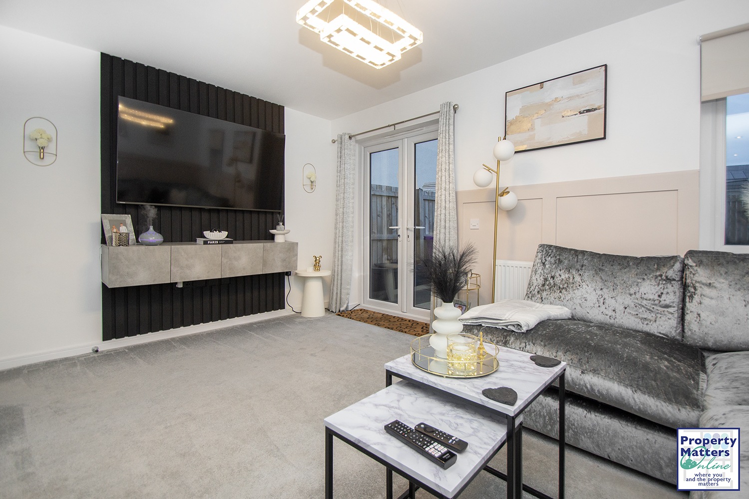 The open-plan kitchen and living area is perfect for modern family living. The kitchen is contemporary and well-equipped, offering a range of upper and lower cabinets and integrated appliances including a fridge freezer, oven, gas hob, extractor fan, washing machine, and dishwasher. There is also ample space for a dining table. The living area is bright and inviting, featuring patio doors and a window that fill the space with natural light, and a handy storage cupboard under the stairs.