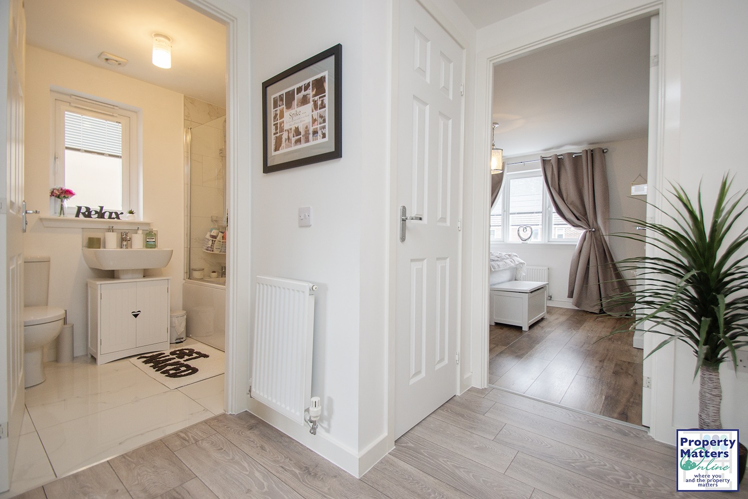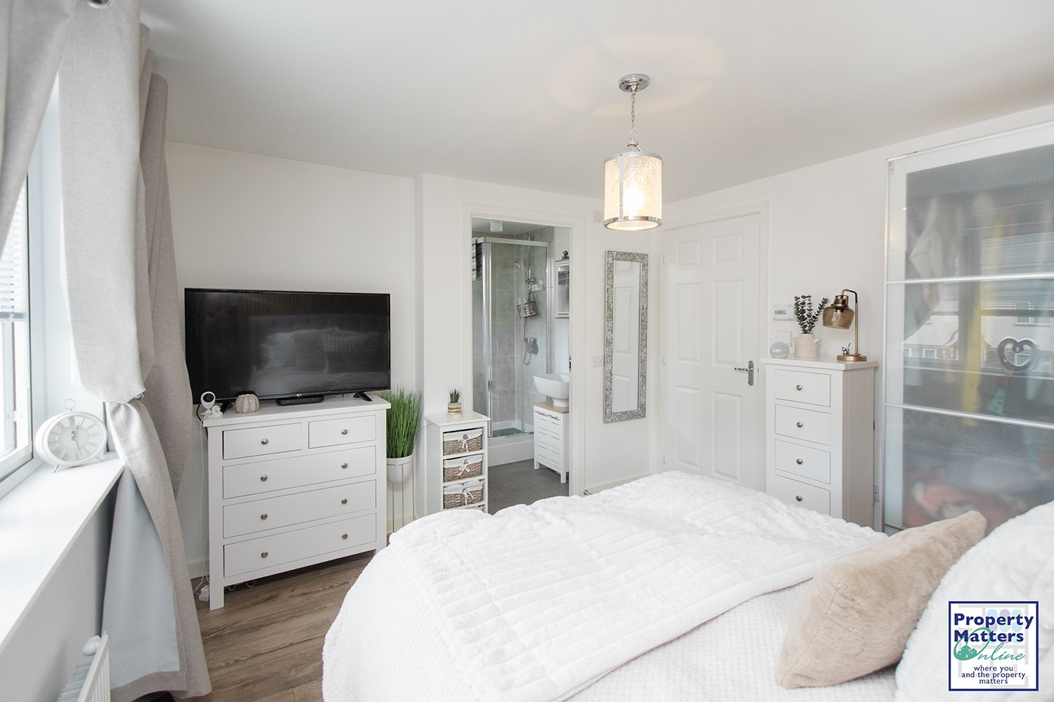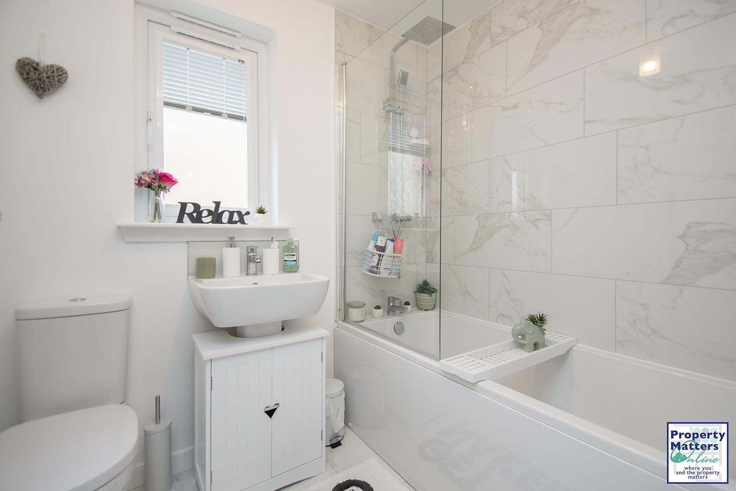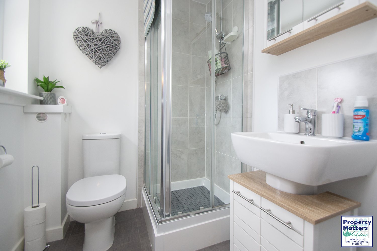 Upstairs, the primary bedroom is a generous front-facing room with large windows that allow an abundance of natural light. It benefits from an en-suite shower room, complete with a WC, wash hand basin, and a shower enclosure. There are two further well-proportioned bedrooms at the rear of the property. The family bathroom includes a three-piece suite, comprising a WC, wash hand basin, and a bath with an overhead shower.