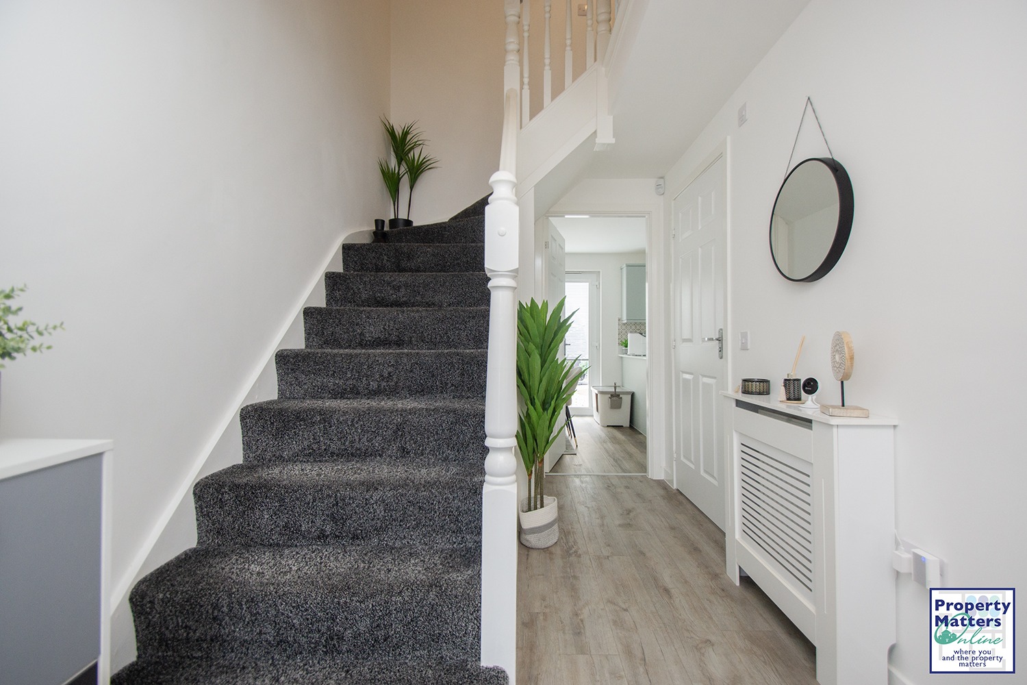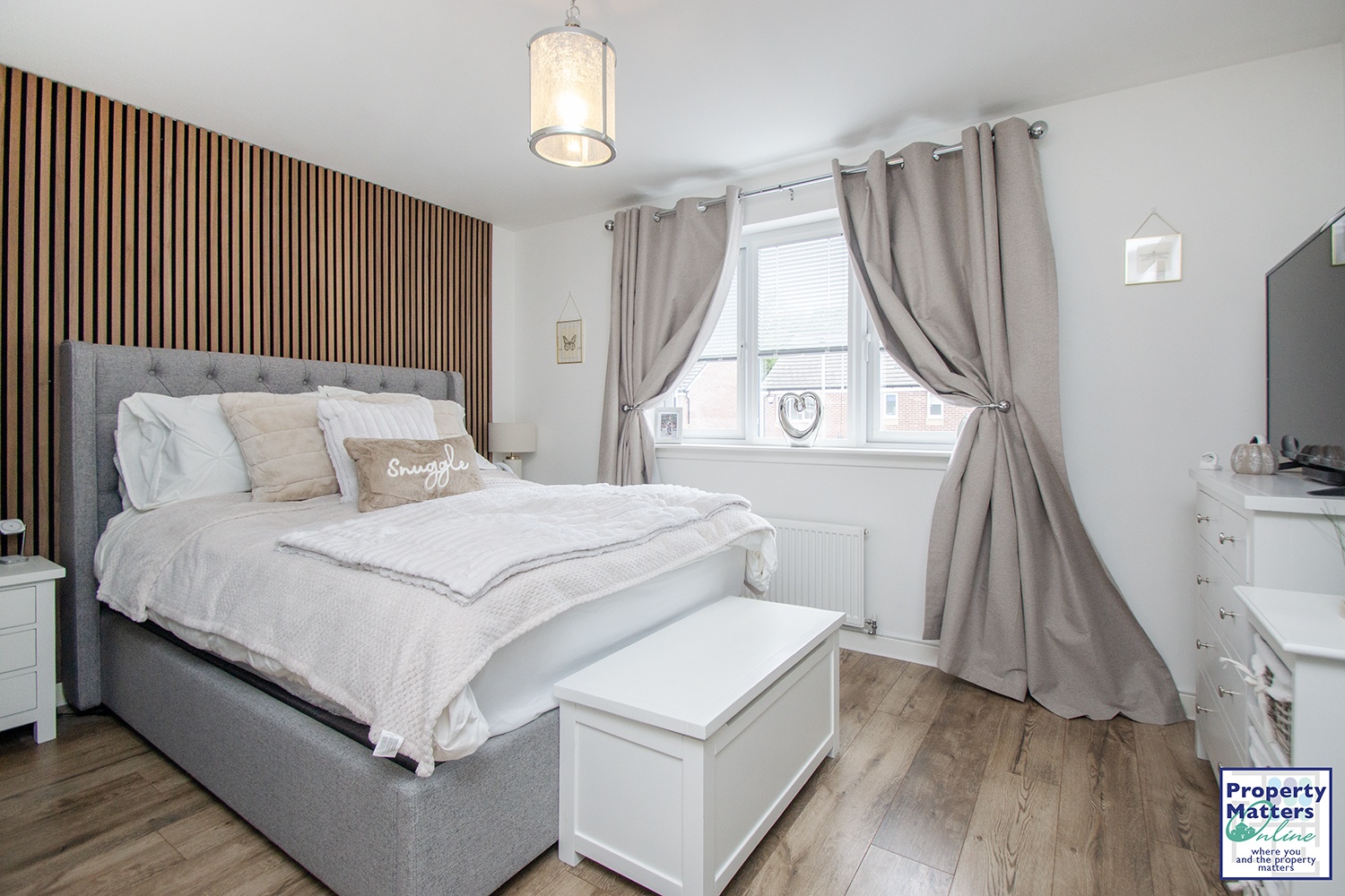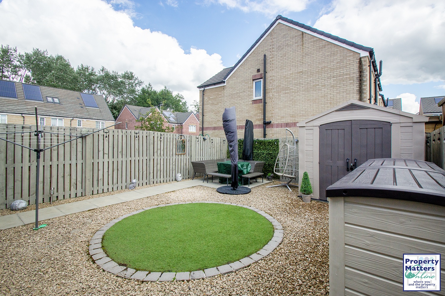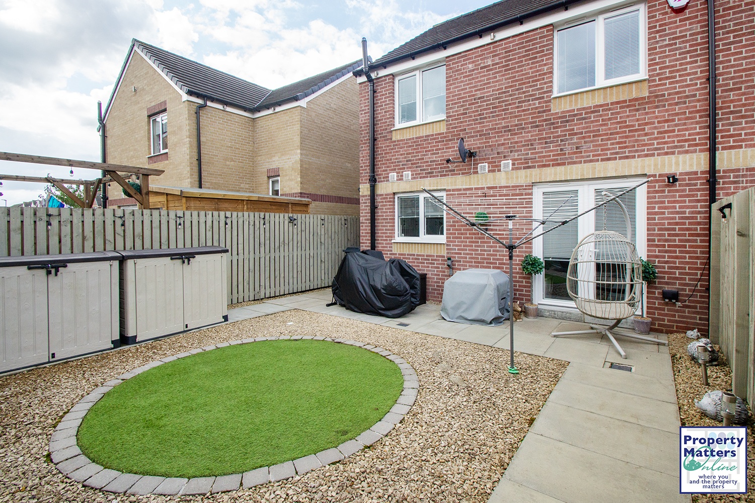 Externally, the front garden is low maintenance and features a large monoblock driveway, offering ample space for two cars. To the rear, the private garden is designed for easy upkeep, featuring a slabbed patio area, decorative chips, and artificial grass, a perfect space for relaxing or entertaining.