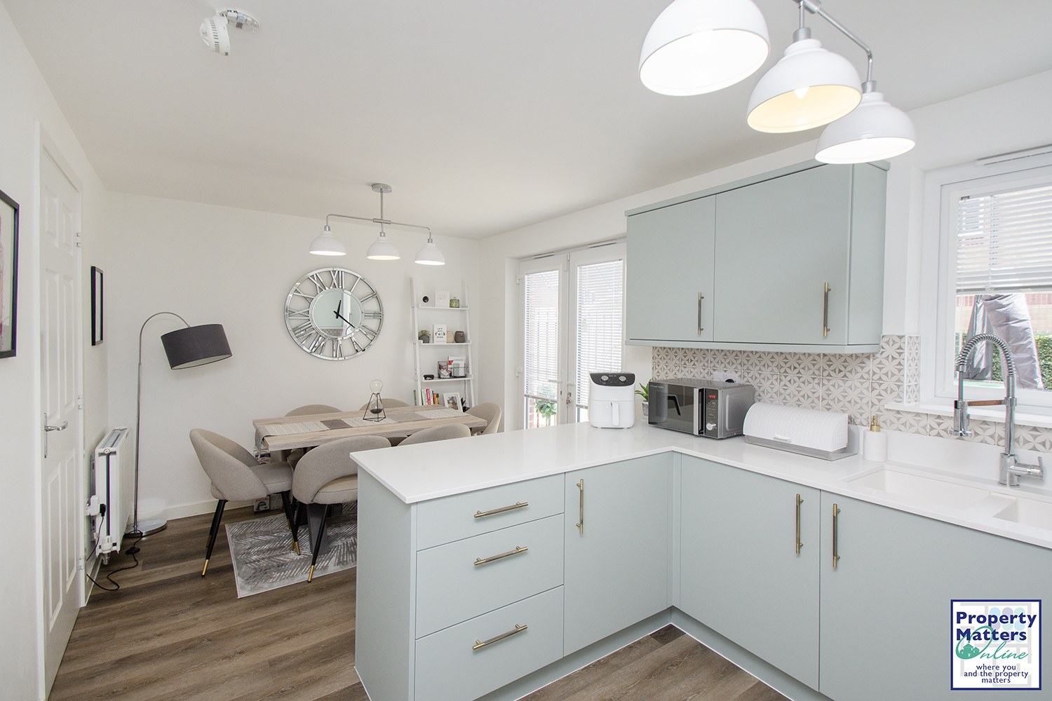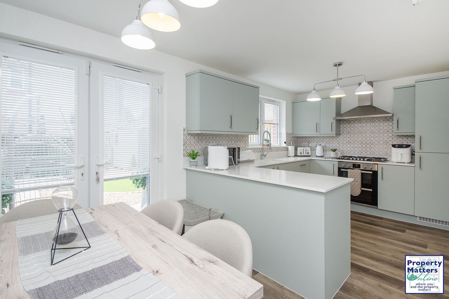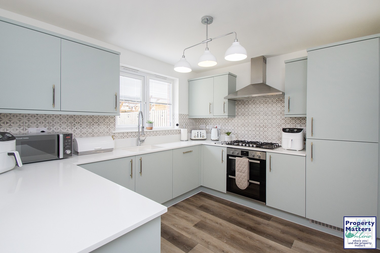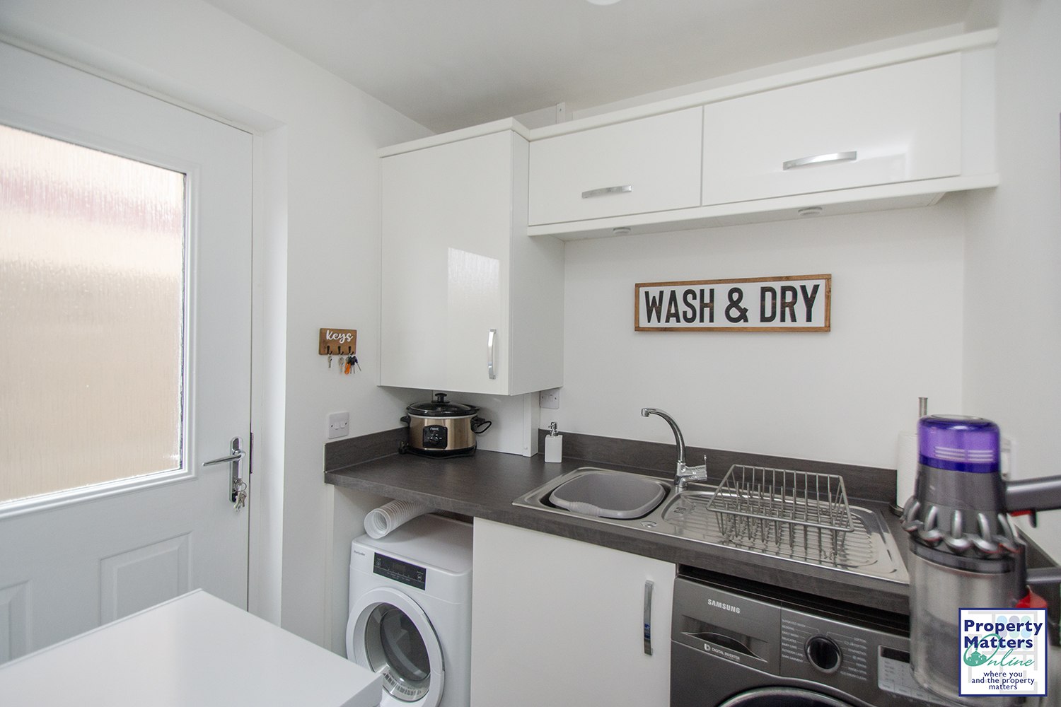 The modern kitchen/diner is fully equipped with an upgraded range of base and wall units, sleek worktops, and stylish tiled splashbacks. Integrated appliances include a five-burner gas hob, electric oven, and extractor fan. The utility room, accessible from the kitchen, provides additional storage and a sink area, with a door leading to the side of the property.