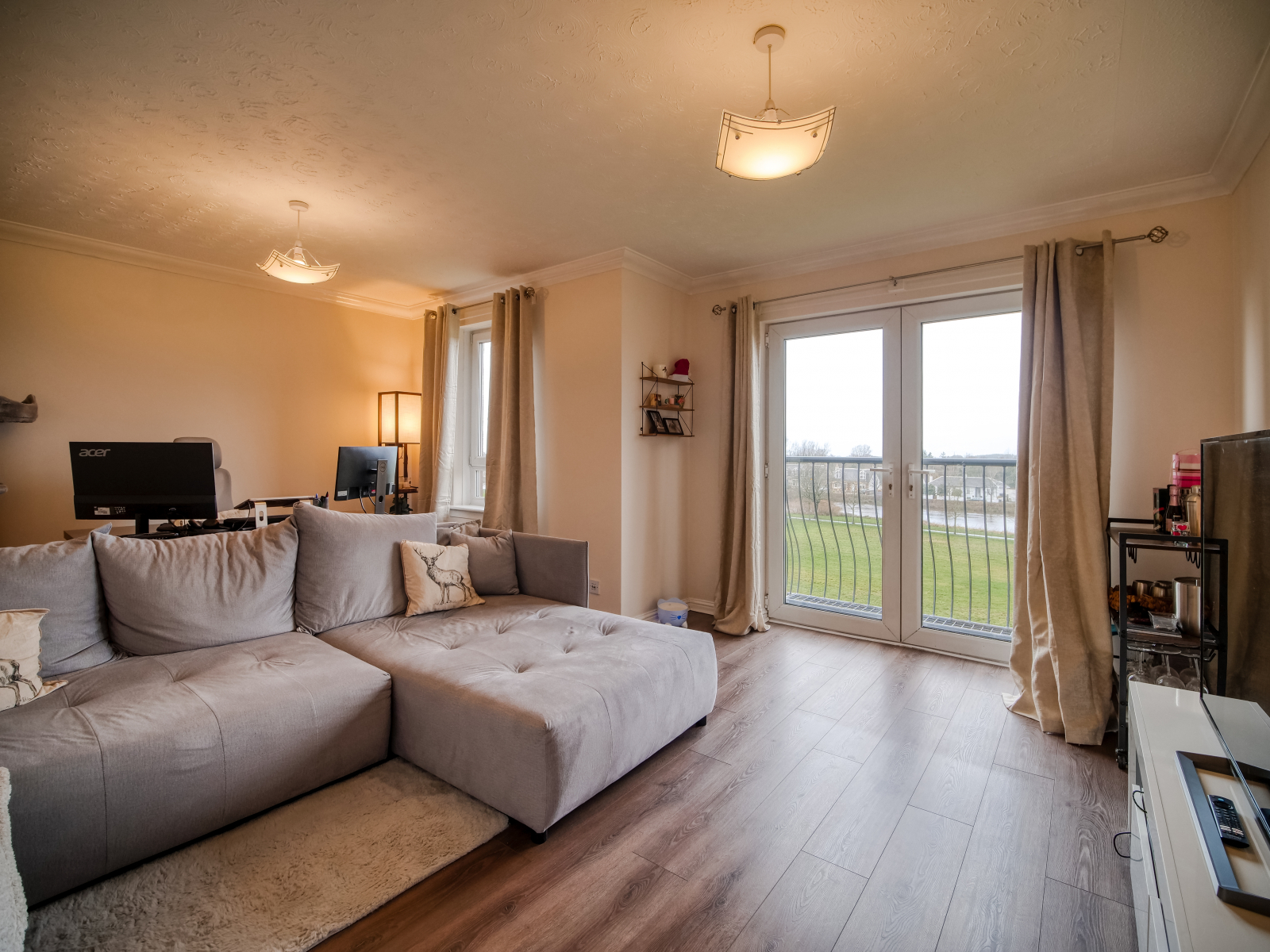 A standout feature is the generous lounge, complete with French doors that open to views across the Low Green and the River Irvine. The property also includes a fitted kitchen, two bedrooms with built in wardrobes and a contemporary shower room with a walk in enclosure.