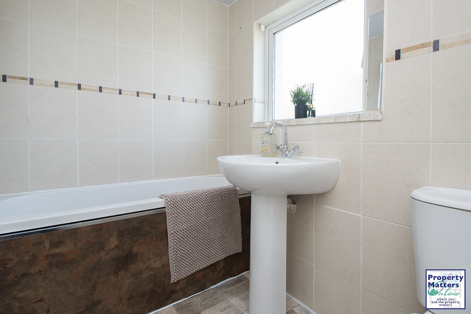 Upstairs, the property boasts a generous principal bedroom with twin front-facing windows, offering plenty of natural light. There are two further well-proportioned bedrooms, providing flexible space for children, guests, or home office use. Completing the upper level is a modern family bathroom fitted with a WC, wash hand basin, and bath with overhead shower.