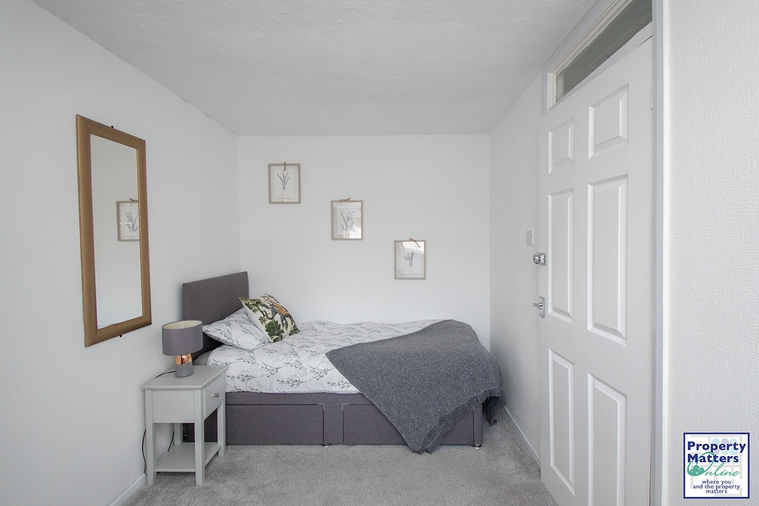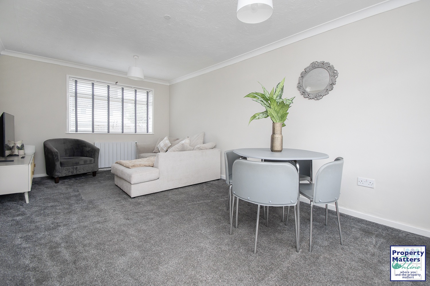 On the ground floor, the home opens with a welcoming entrance hallway that includes a convenient storage cupboard. The bright and spacious lounge/dining area benefits from dual aspect windows, creating a warm and inviting space perfect for both relaxing and entertaining. The adjacent kitchen is well-equipped with a range of upper and lower cabinets, space for freestanding appliances, and a large under-stairs storage cupboard. A rear door provides direct access to the garden, ideal for outdoor living and dining in the warmer months.