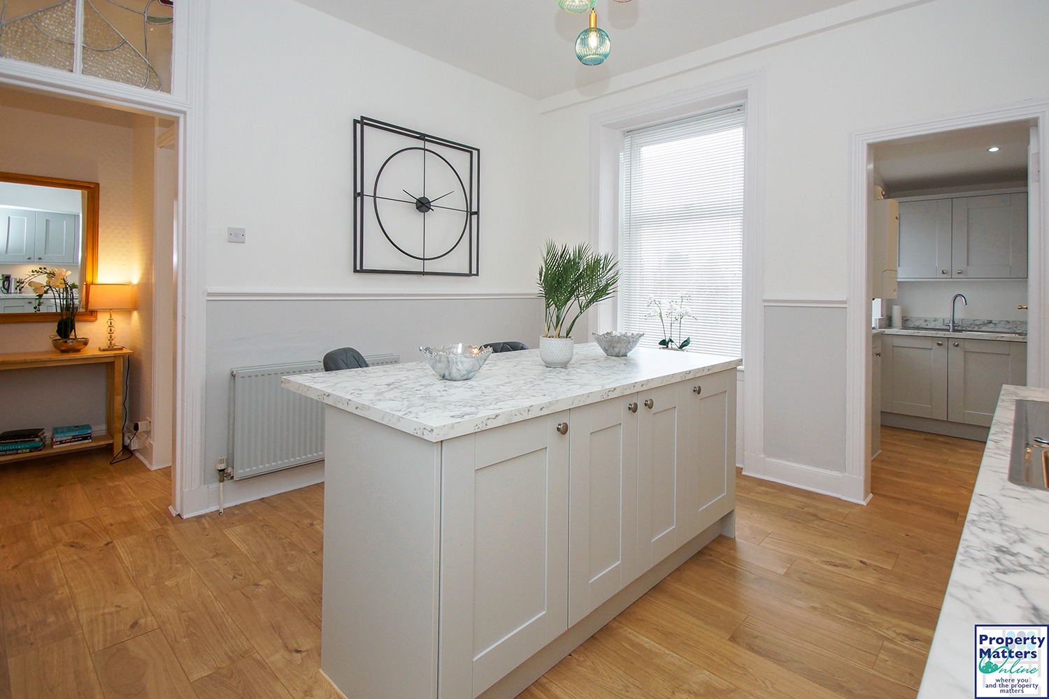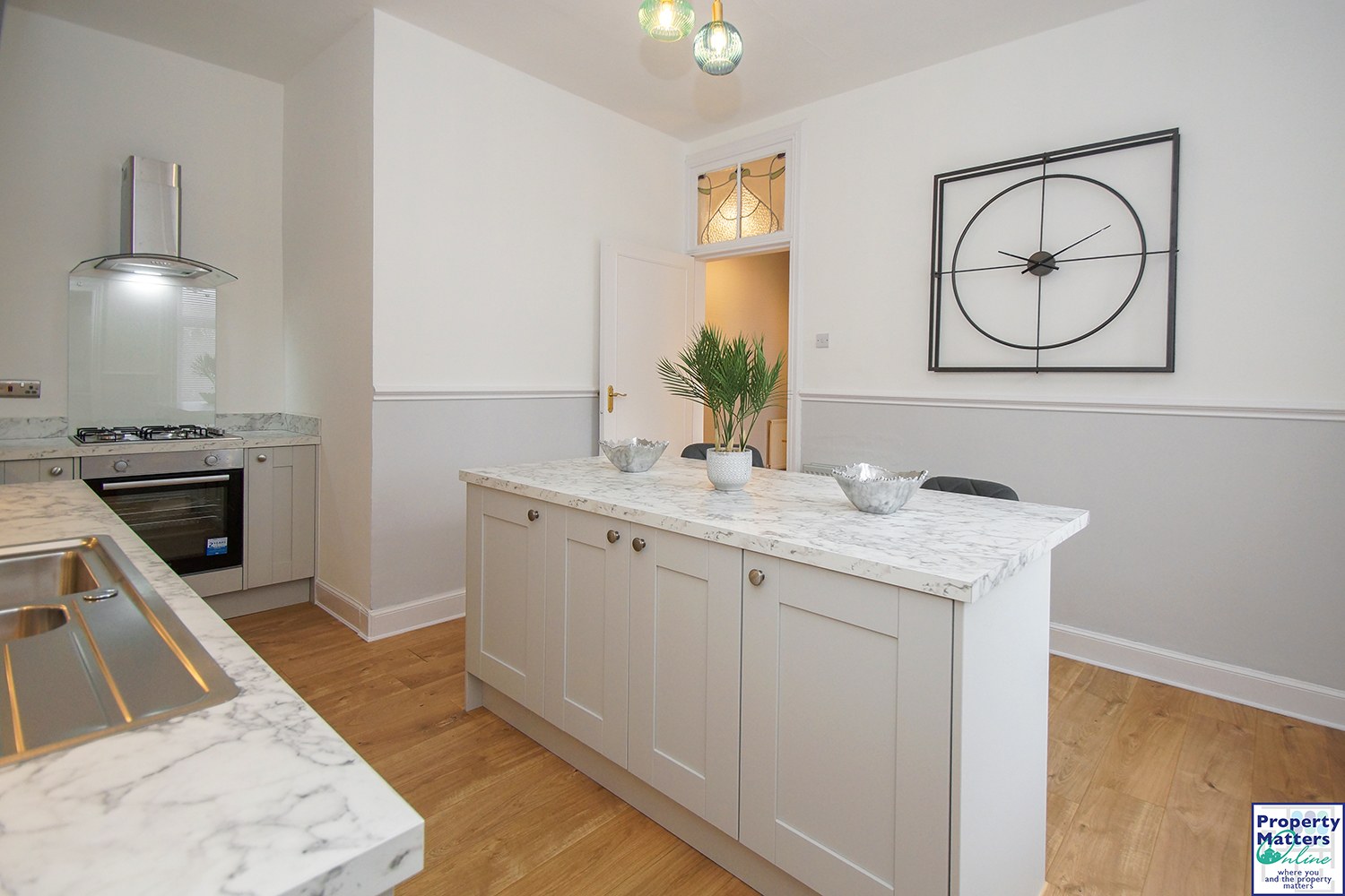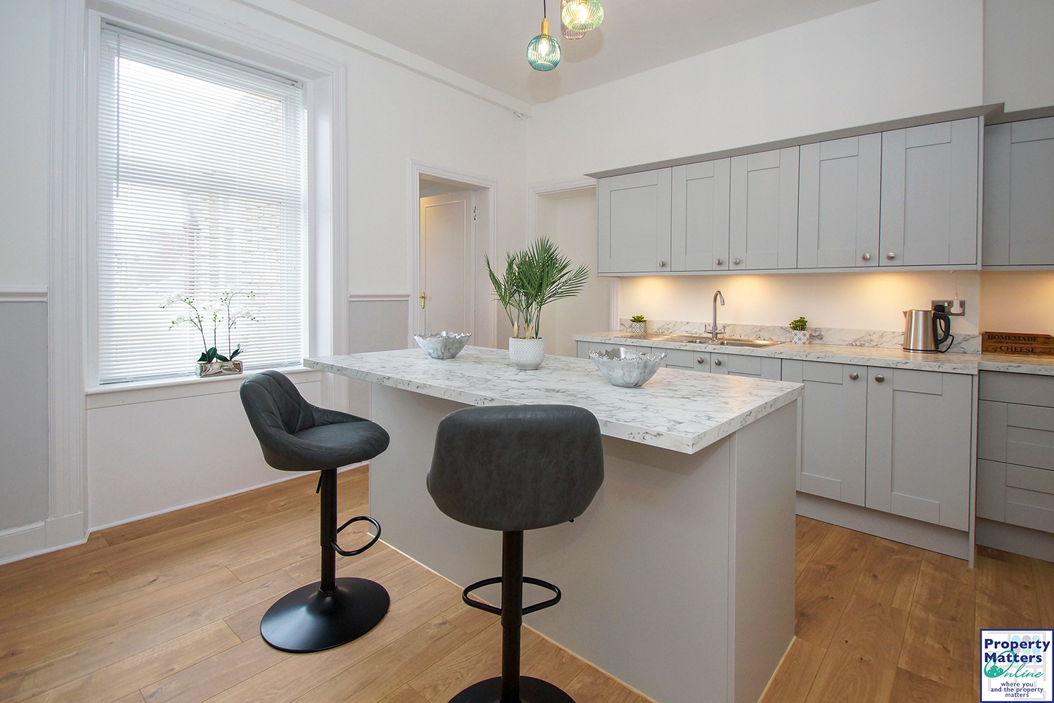 The accommodation comprises of an entrance vestibule leading to spacious hallway giving access to all compartments, large three-piece board; bright spacious front facing lounge with bespoke seated area, traditional fireplace, beautiful ceiling cornice, dado rail and soft wall lighting, access from the hallway into to the new fully fitted kitchen housing ample range of wall and base units with complementary worktops and matching upturns, feature contemporary island, integrated appliances including gas hob, electric oven and extractor; handy utility room with matching wall units, worktops, insert stainless steel sink and plumbing for automatic washing machine, there are two spacious bedrooms both with modern contemporary décor with traditional features, three piece family bathroom comprising of w.c, wash hand basin and bath with overhead shower. Full gas central heating and double glazing.