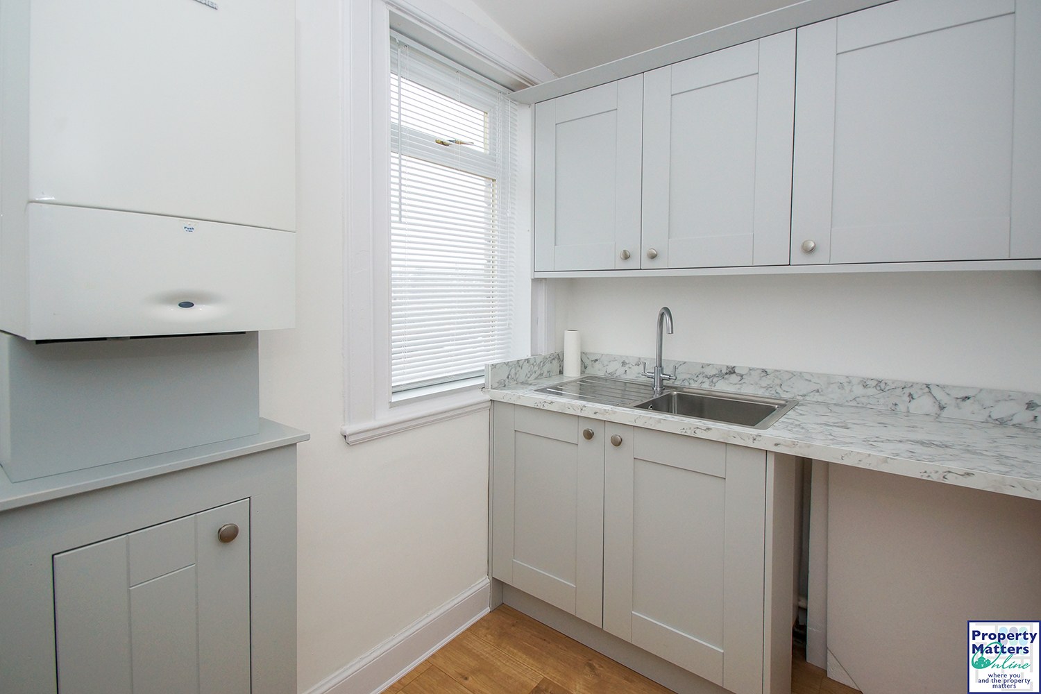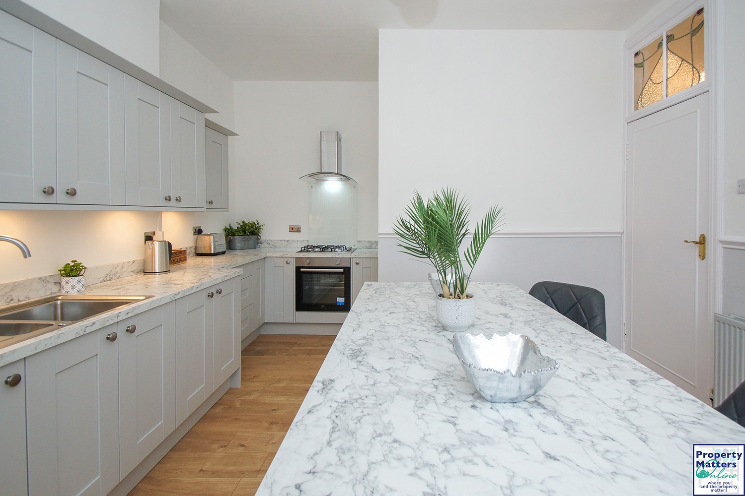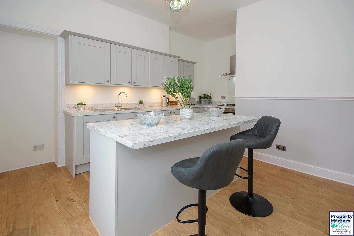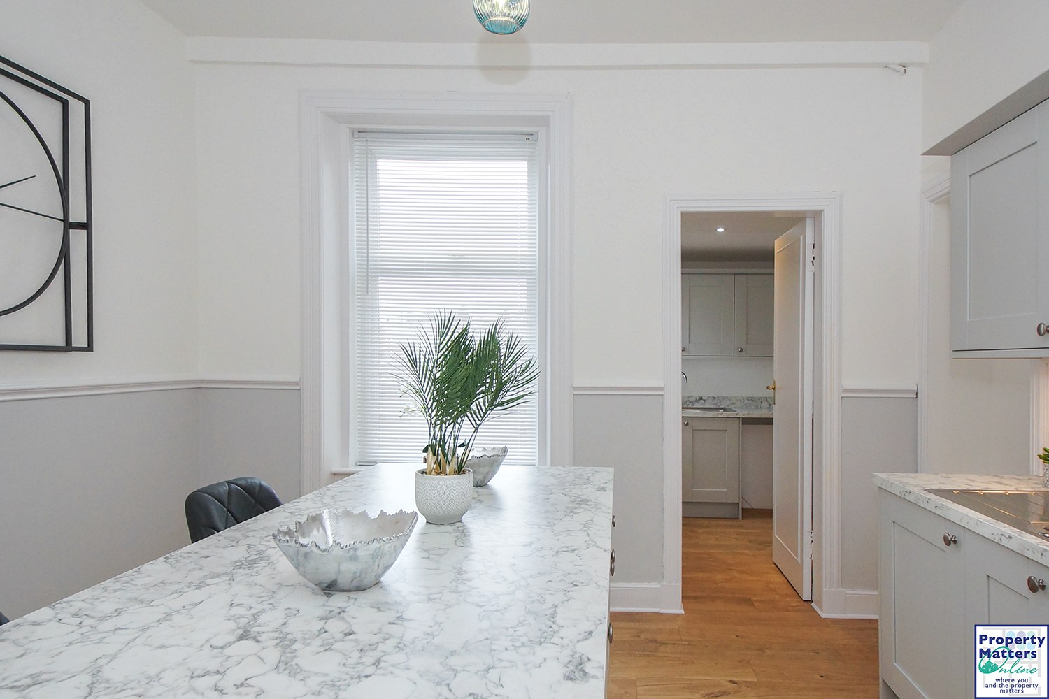 The accommodation comprises of an entrance vestibule leading to spacious hallway giving access to all compartments, large three-piece board; bright spacious front facing lounge with bespoke seated area, traditional fireplace, beautiful ceiling cornice, dado rail and soft wall lighting, access from the hallway into to the new fully fitted kitchen housing ample range of wall and base units with complementary worktops and matching upturns, feature contemporary island, integrated appliances including gas hob, electric oven and extractor; handy utility room with matching wall units, worktops, insert stainless steel sink and plumbing for automatic washing machine, there are two spacious bedrooms both with modern contemporary décor with traditional features, three piece family bathroom comprising of w.c, wash hand basin and bath with overhead shower. Full gas central heating and double glazing.