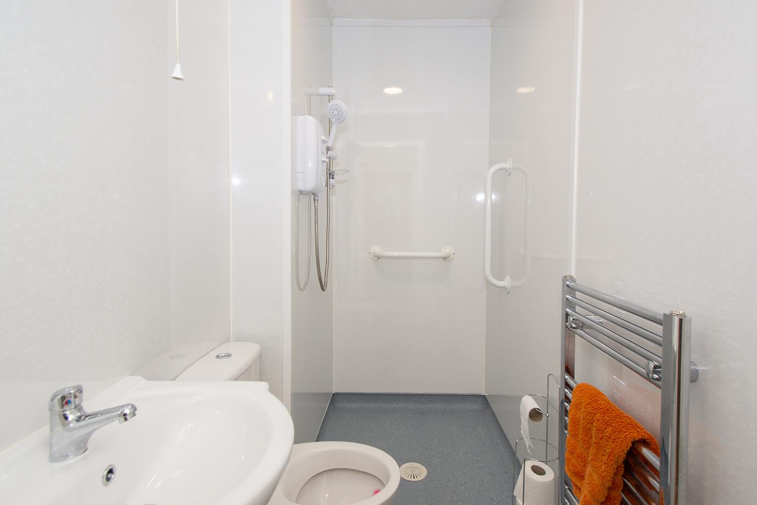 Modern fitted wet room comprises of wc, wash hand basin, electric shower, and cushioned vinyl flooring.