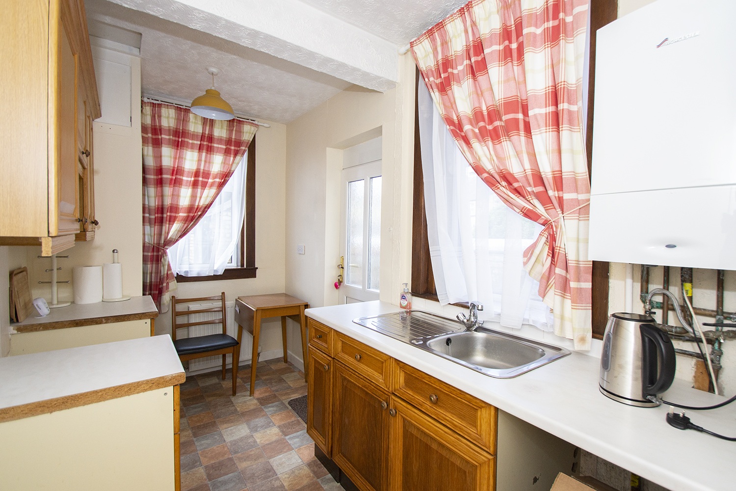 Fitted kitchen with a good range of base and wall units, complimentary worktops, and tiling to splashback areas. Side and rear facing windows allowing plenty of natural light in and modern UPVC door giving access to the rear. Ample power points.