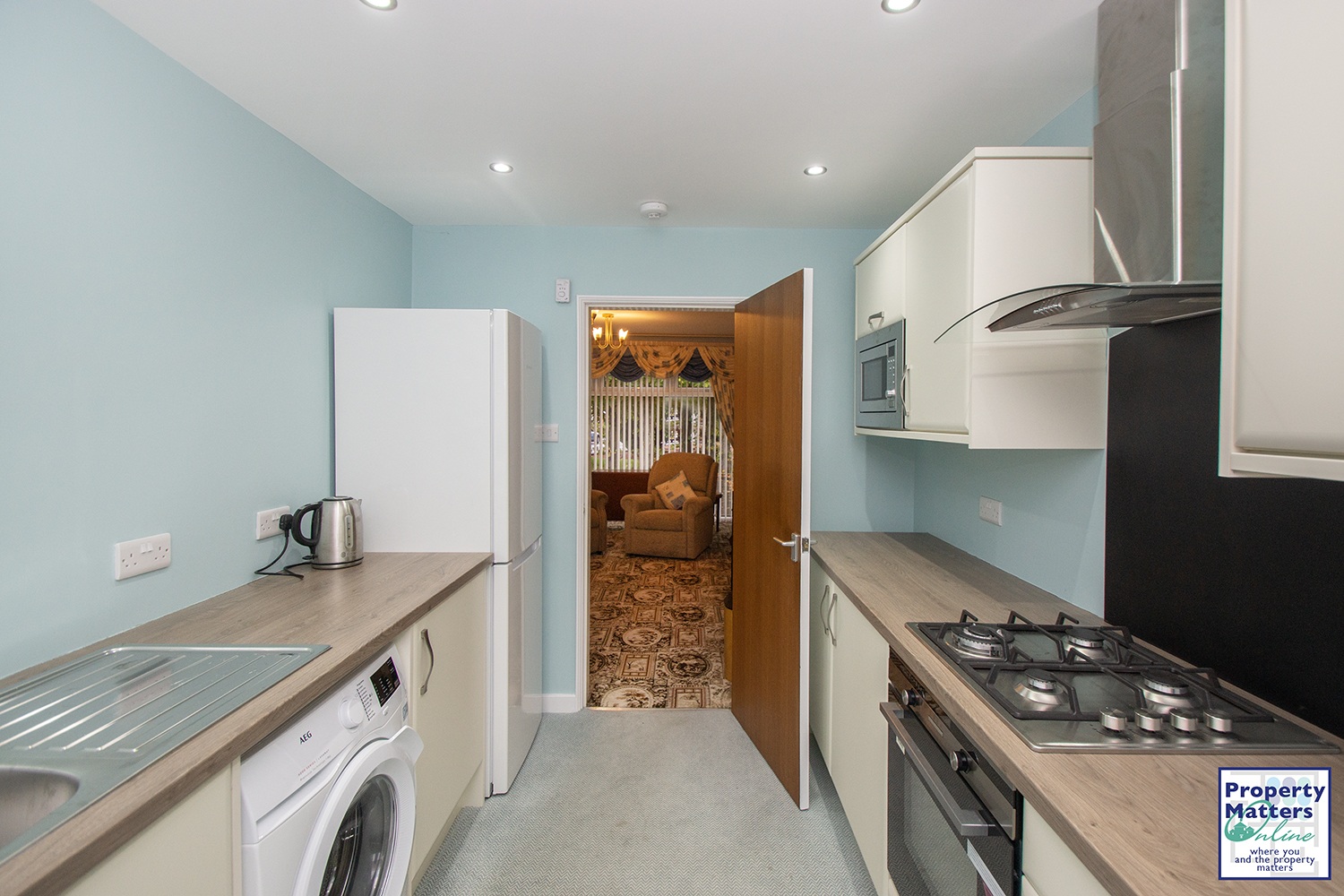 - Contemporary fitted kitchen with integrated hob, oven, and extractor hood