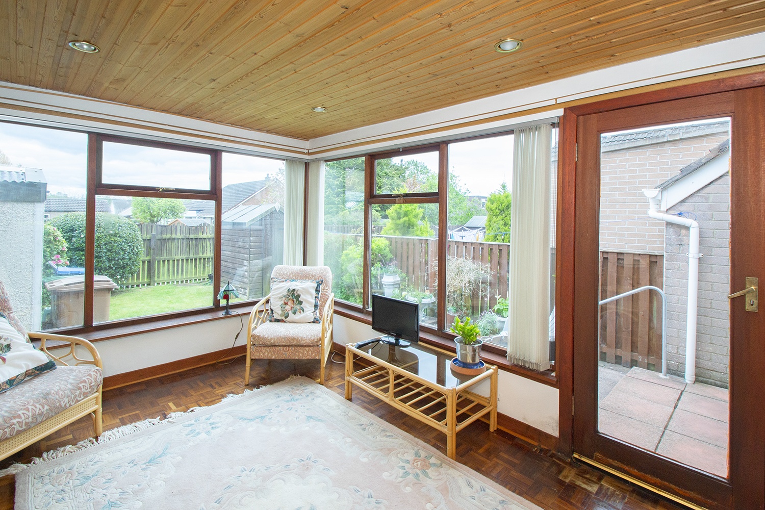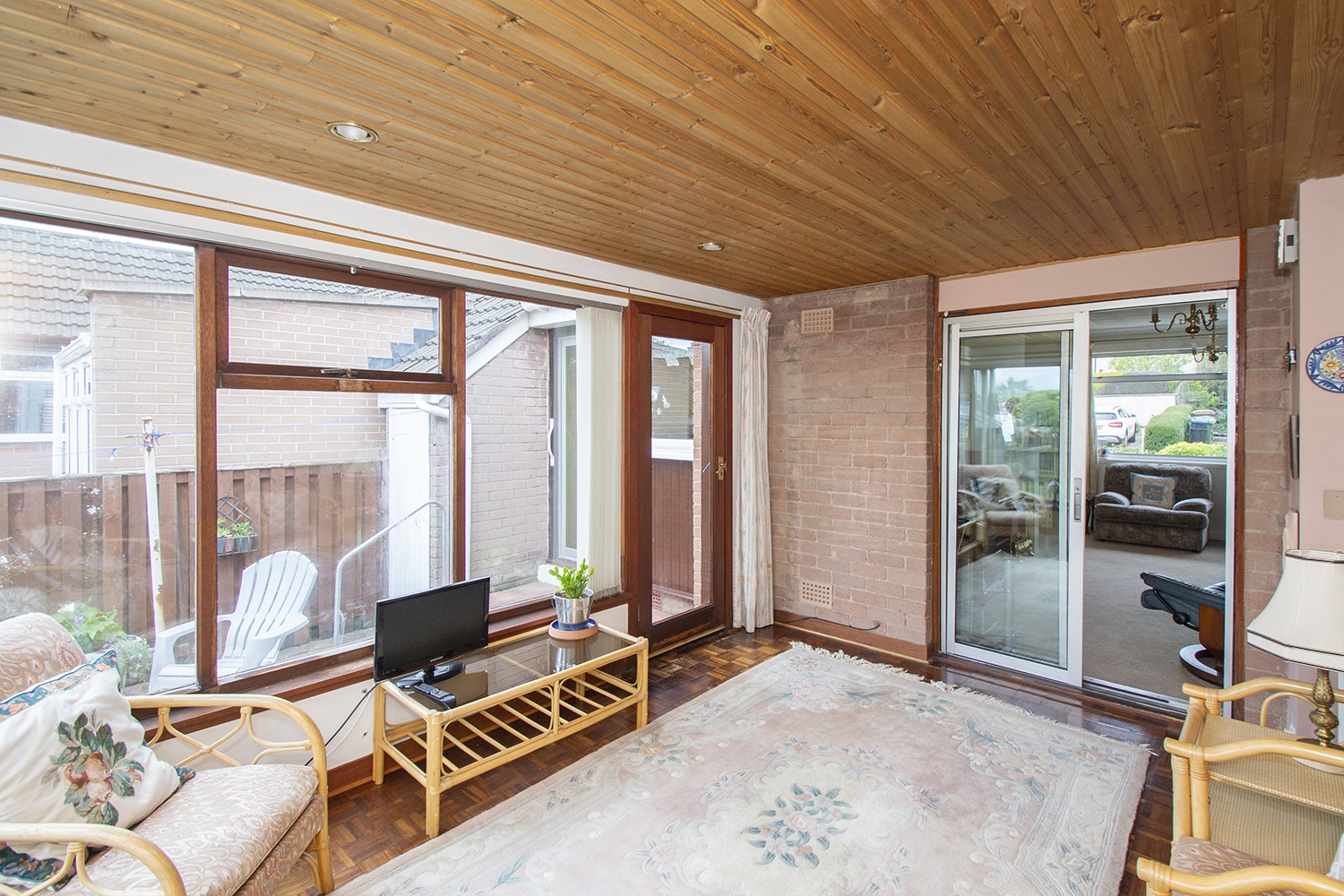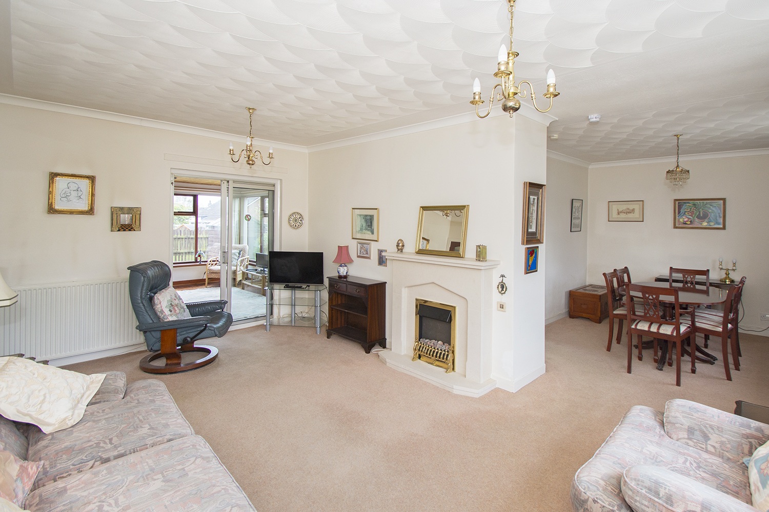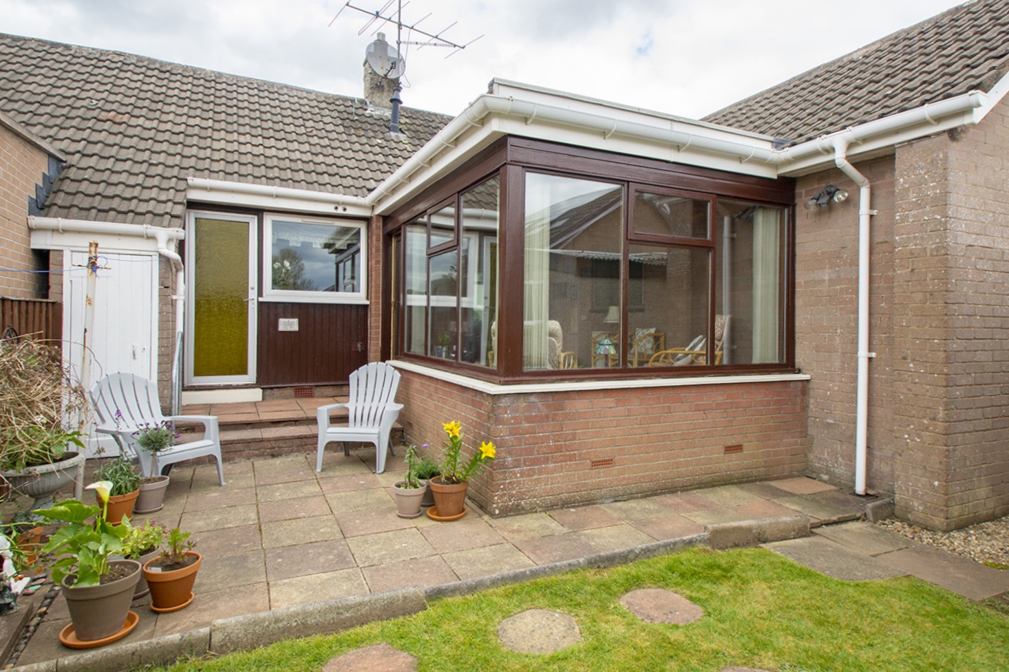 This spacious accommodation is laid out over one level comprising entrance hallway; side facing lounge with open plan dining room; patio doors from the lounge give access to the rear sunroom. Fitted kitchen housing an ample range of base and wall units with complementary tiled splash-back areas, integrated electric oven and hob. Two well-proportioned front facing double bedrooms with fitted wardrobes. Three piece family bathroom comprising vanity unit, which houses the wc,and wash hand basin, and bath.