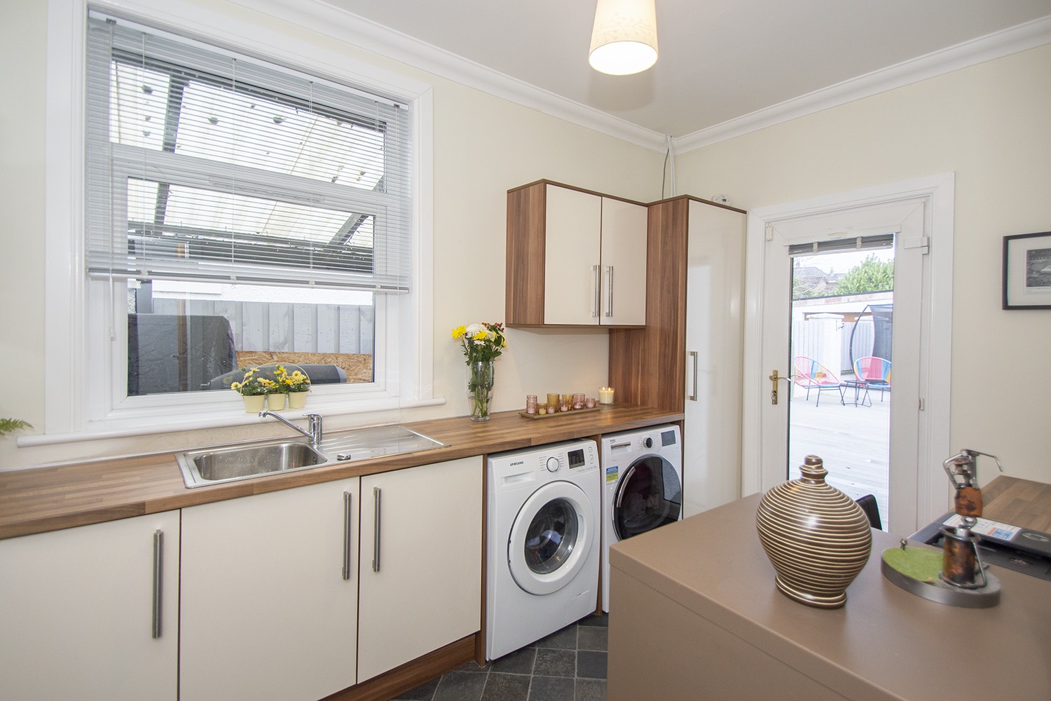 This spacious accommodation comprises of entrance vestibule leading to the entrance hallway with handy storage cupboard; well-proportioned rear facing lounge with feature alcoves; fitted kitchen/dining/family area housing an ample range of base and wall units with complementary worktops, integrated appliances including induction hob, oven, fridge freezer dishwasher and wine cooler this area also boasts electric Velux windows, large feature patio doors overlooking garden and built in sound system. There are two good sized bedrooms downstairs, utility/study room and contemporary fitted bathroom. On the upper level there are a further two good sized bedrooms with jack and jill ensuite. Large storage cupboard.