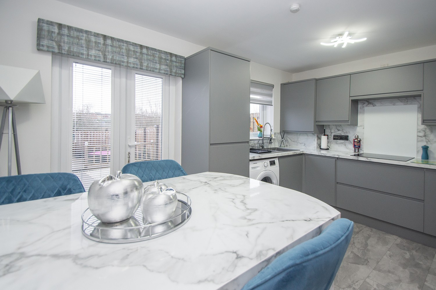 Contemporary dining kitchen housing and ample range of base and wall units with complementary worktops and up turns. The kitchen benefits from integrated electric oven, microwave, electric hob and extractor hood, washing machine, inset sink with mixer tap, integrated dishwasher and fridge freezer, quality flooring and lighting. Rear facing window and French doors to rear garden. Ample power points.