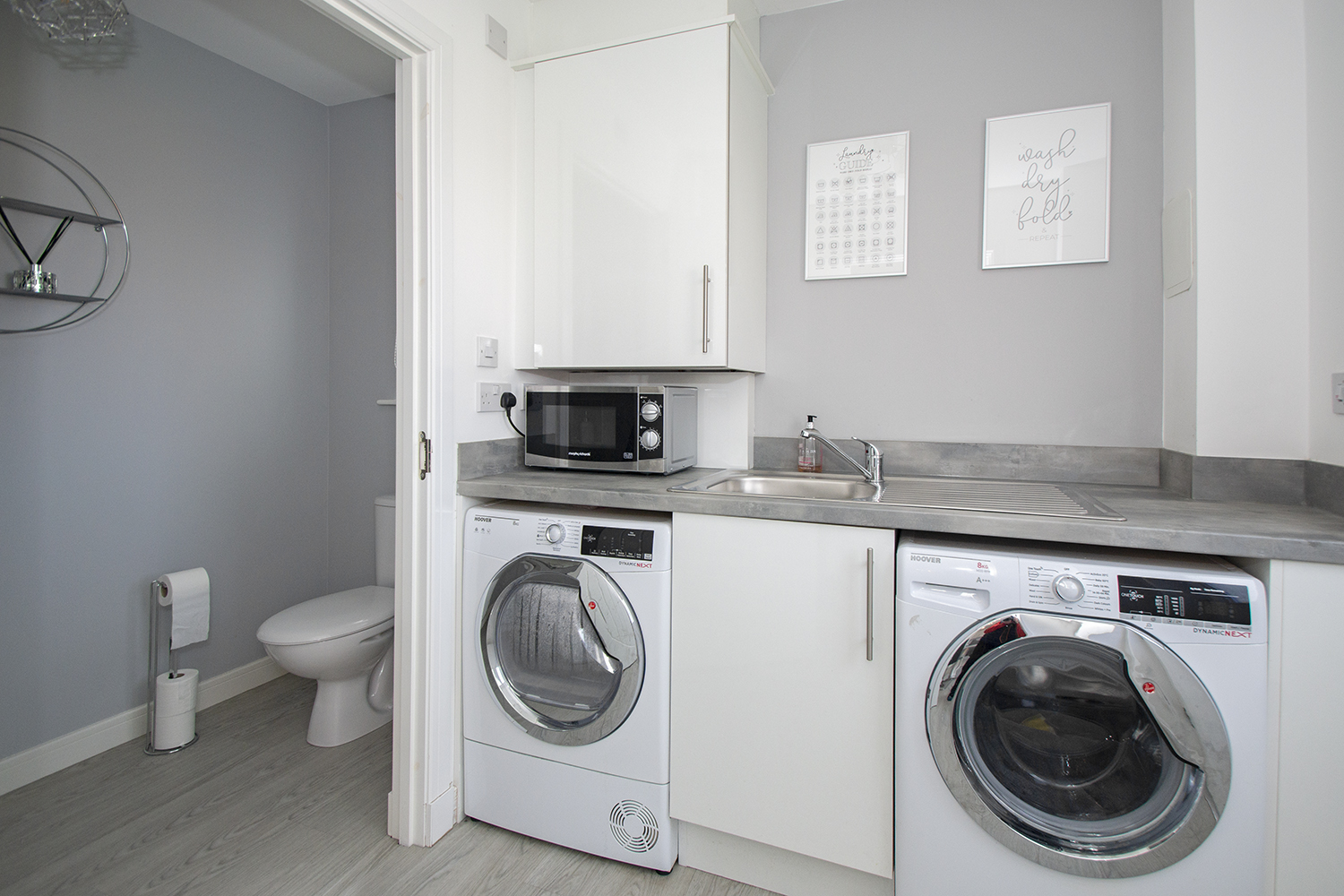 Handy utility room with plumbing for automatic washing machine. Space for dryer. Door to cloak room and also rear garden.