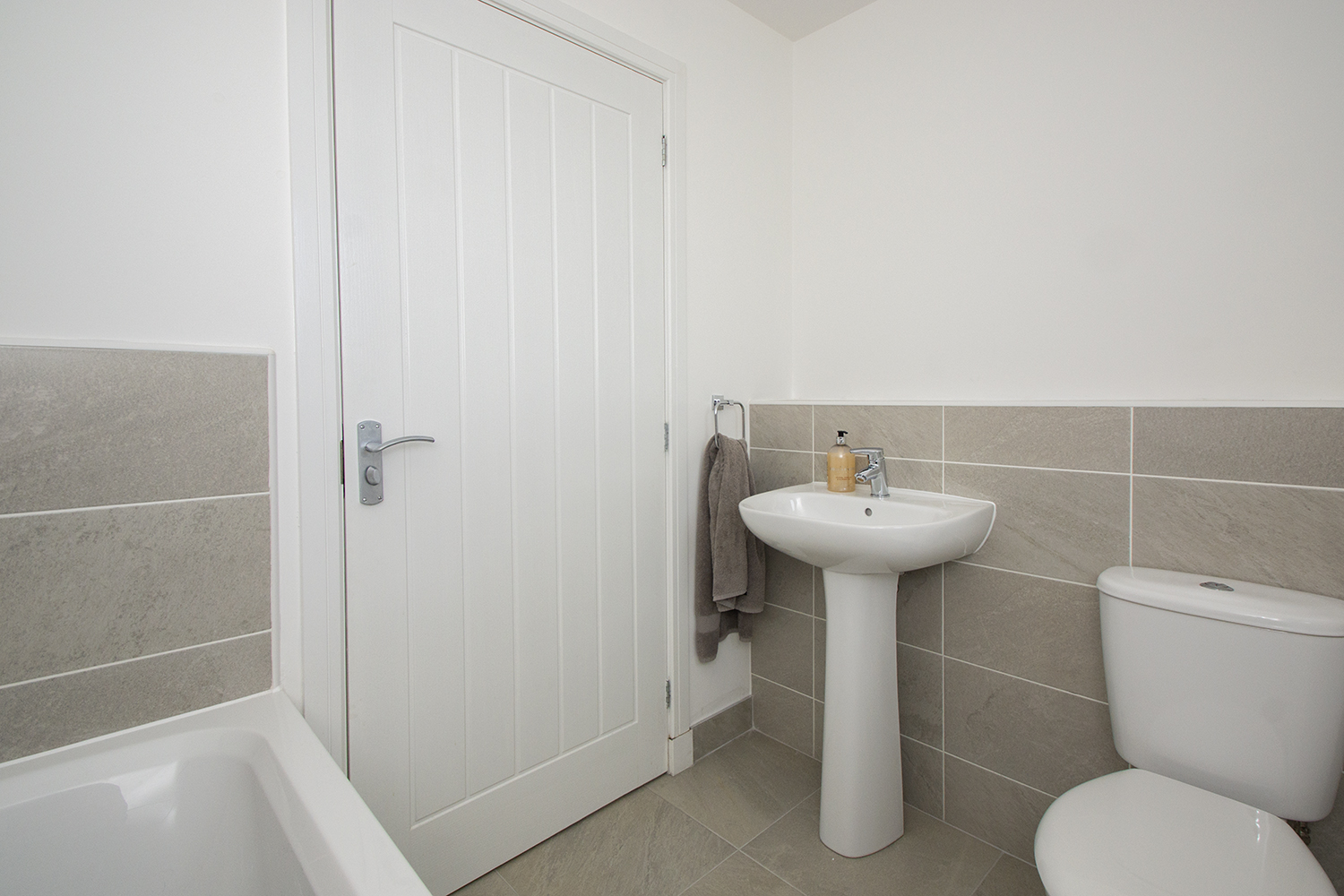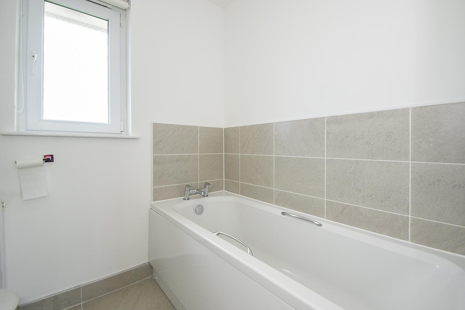 Quality family bathroom fitted with a white 3 piece suite comprising WHB and WC and bath. Modern tiling to dado level on walls. Carpeted flooring. Opaque window providing an abundance of natural light to the rear.