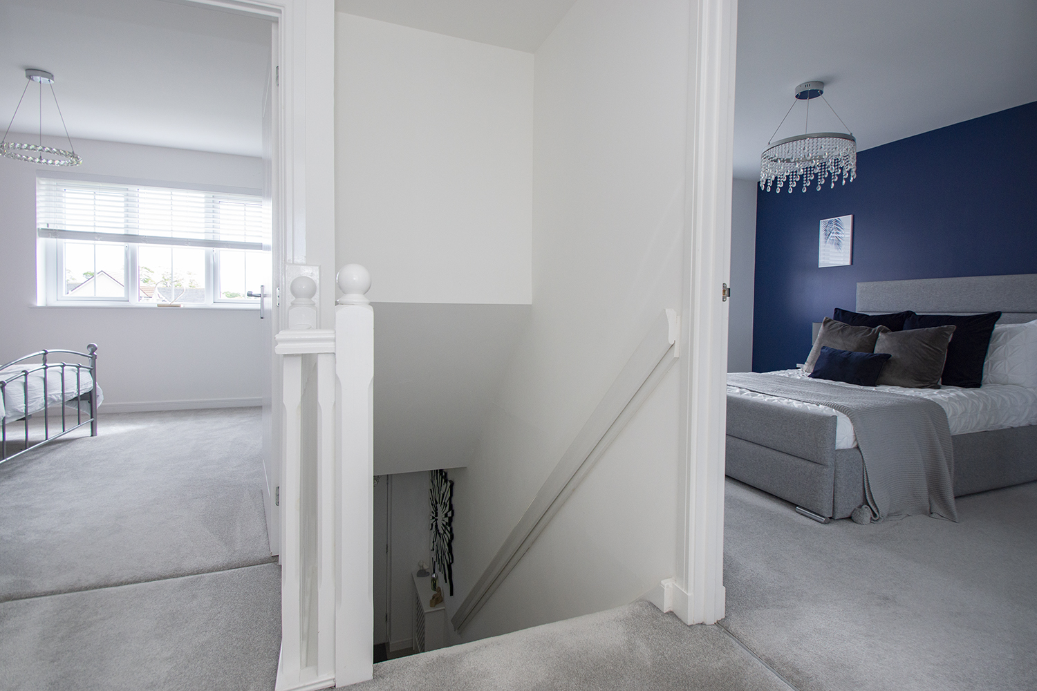 From lower level via carpeted staircase to upper landing with carpet flooring. Access hatch to loft. Handy storage cupboard.