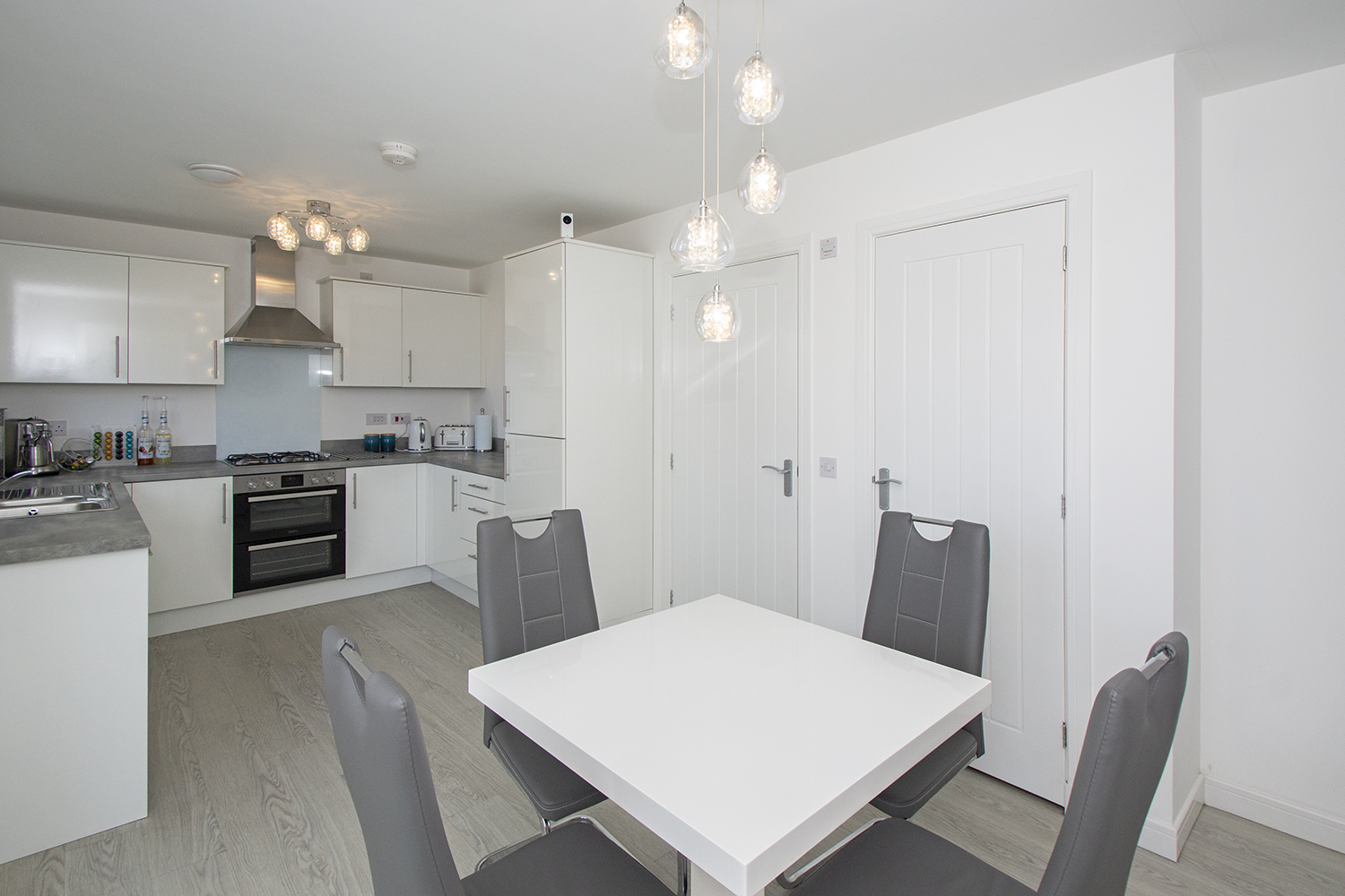 Well fitted kitchen diner with range of modern floor and wall mounted units. Complementary work tops. Integrated appliances include gas hob, electric oven and stainless steel extractor hood. Inset stainless steel sink with mono mixer tap. Integrated dishwasher and fridge freezer. Luxury quality LVT flooring throughout. Ample power points. Rear facing window. Dining area with French doors leading to garden. Handy under stair storage cupboard. Door giving access to utility room.