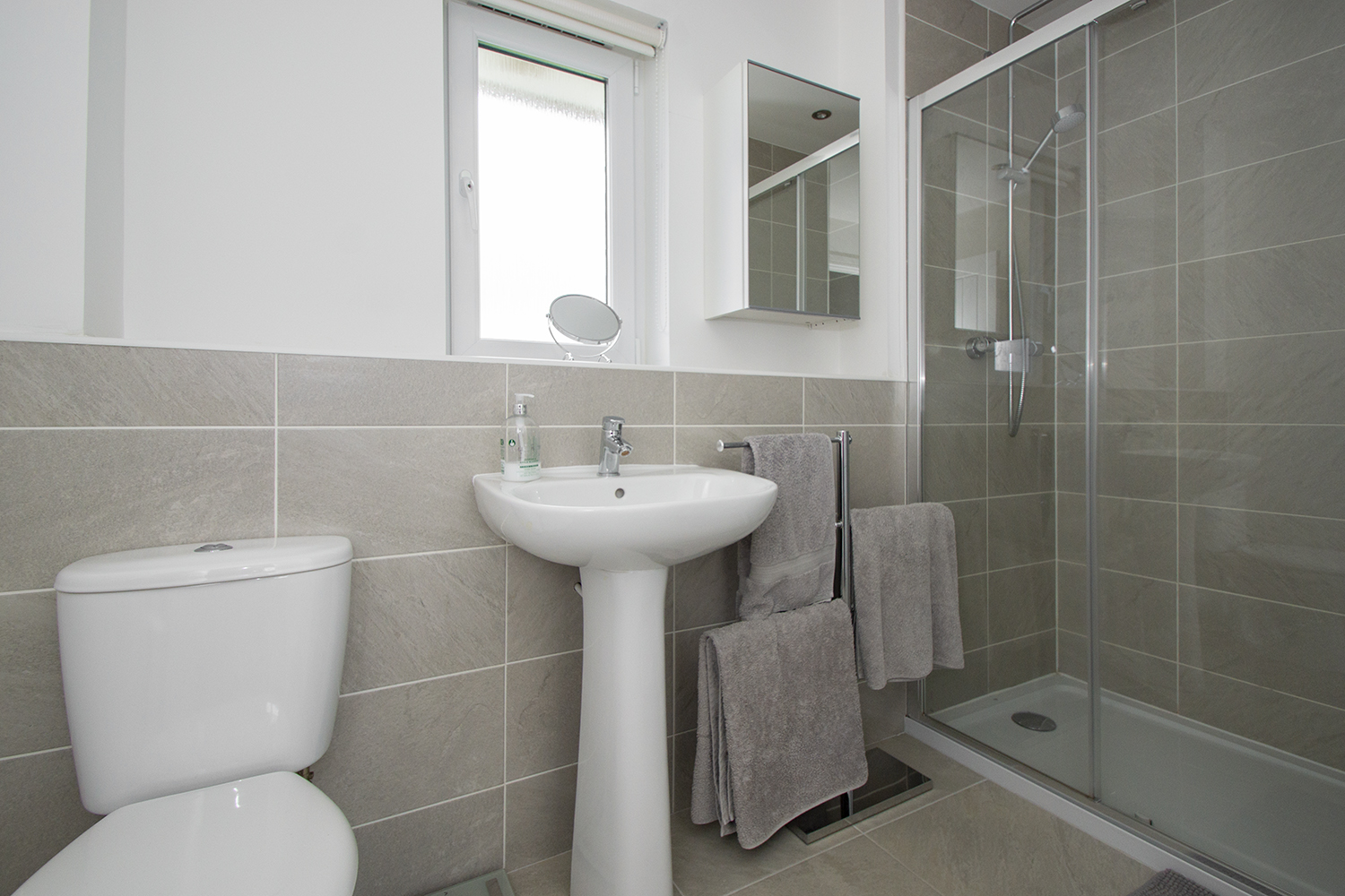 Modern contemporary en-suite shower room fitted with a three-piece suite comprising WC, WHB and shower enclosure. Contemporary tiling on walls and flooring. Natural light through the rear facing opaque window.