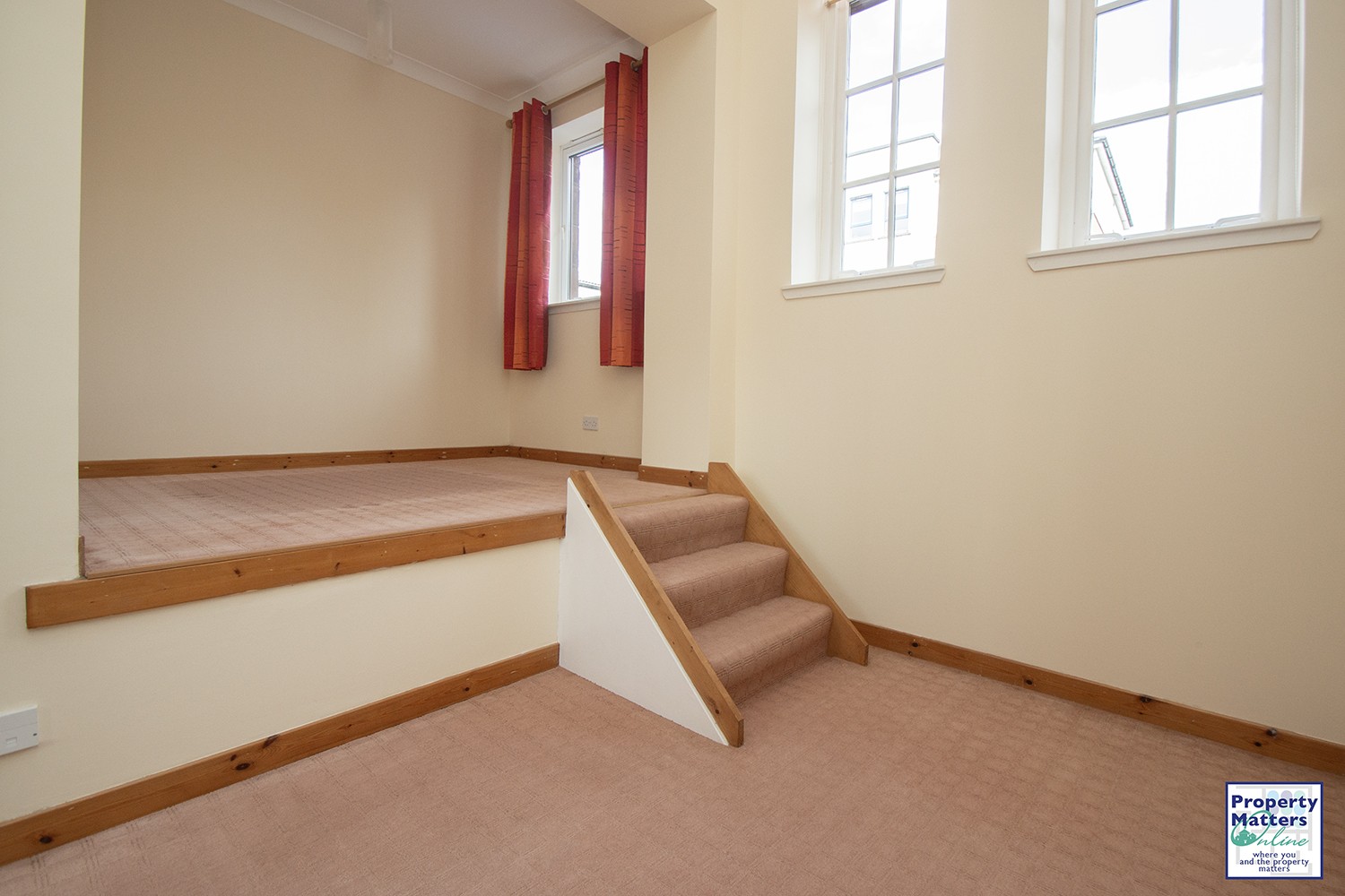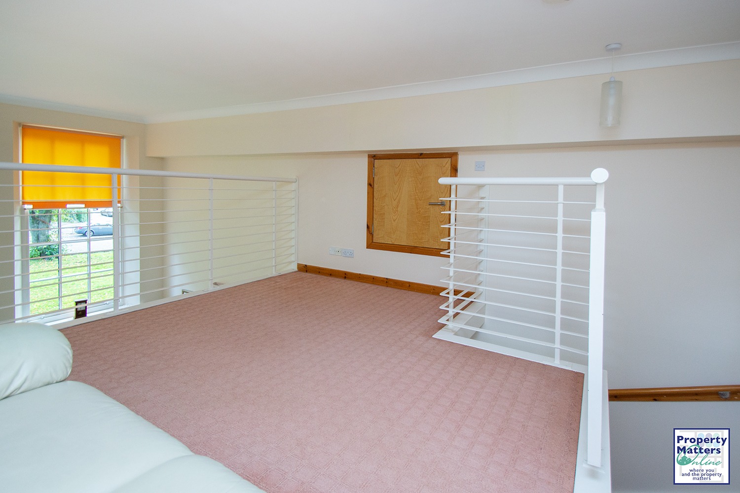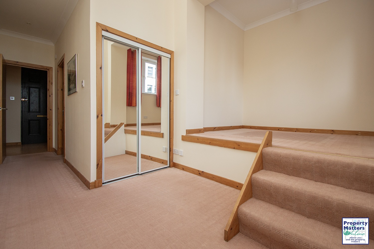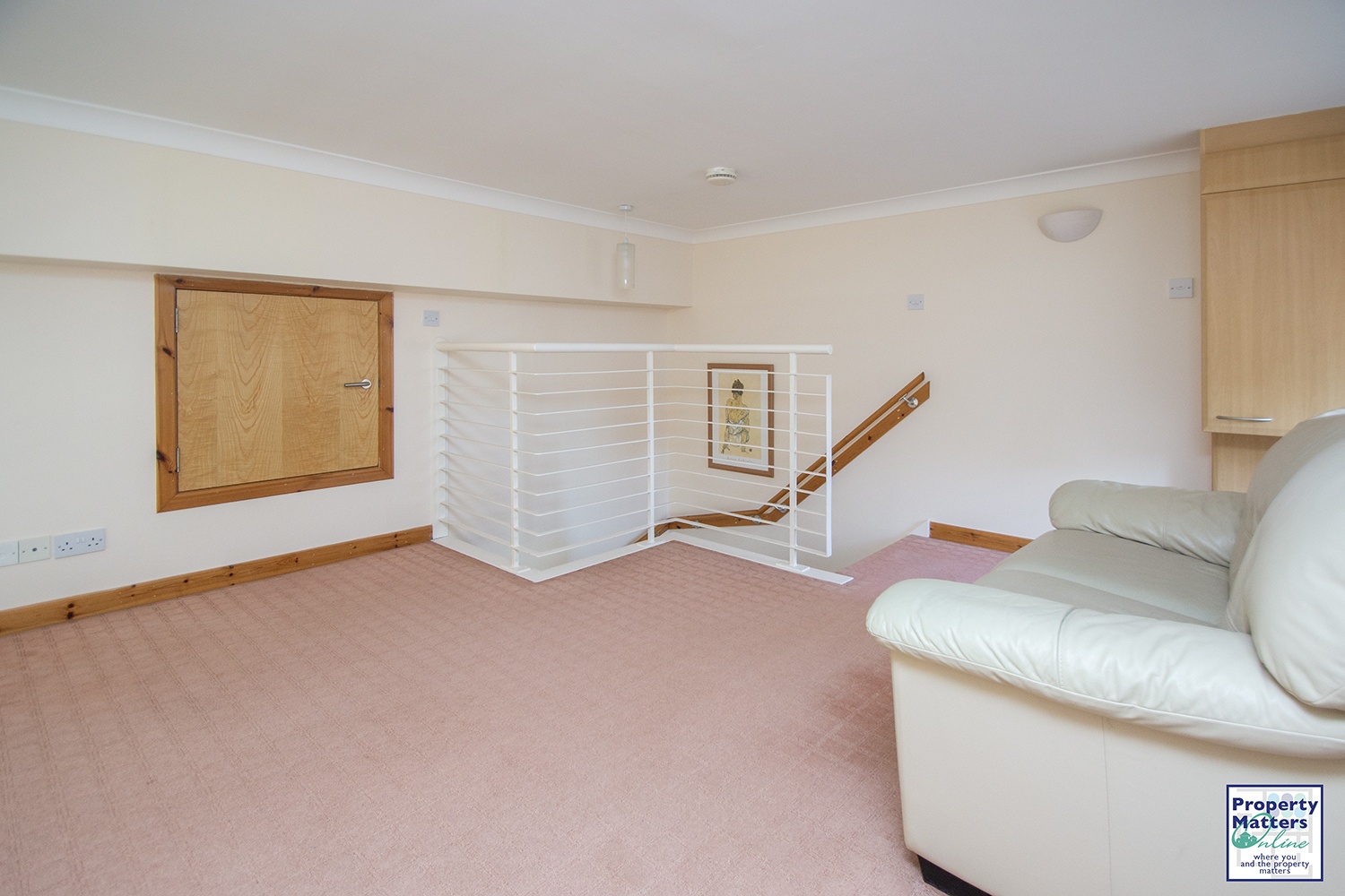 Accessed via staircase into spacious mezzanine area. Modern décor and carpeted flooring.