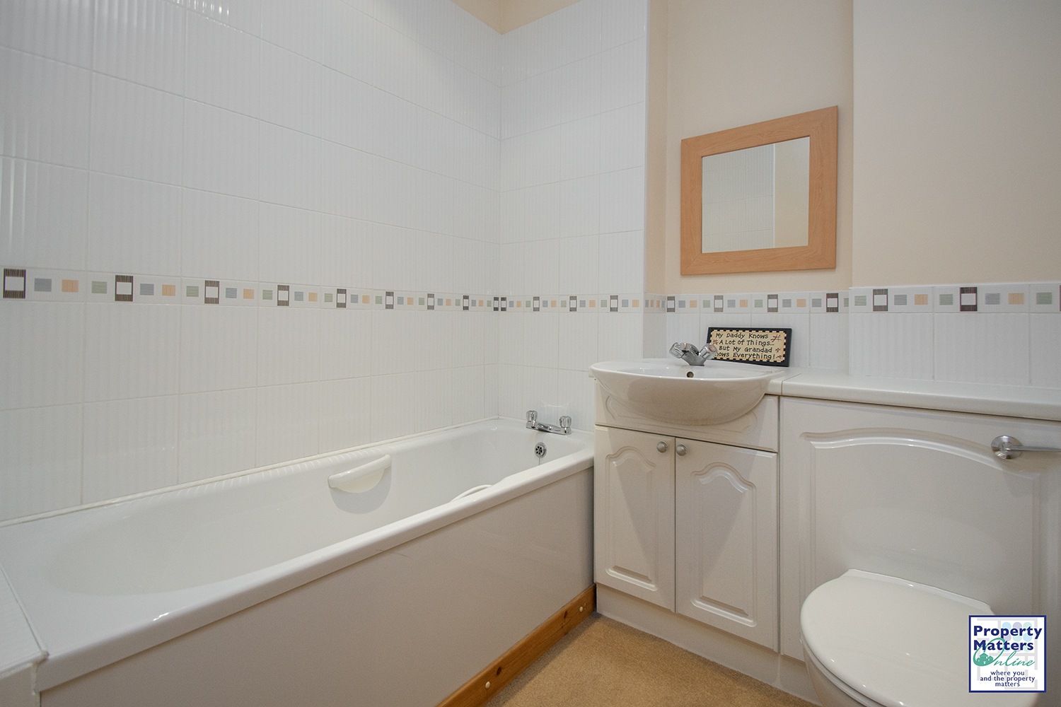 Three-piece bathroom suite with wash hand basin and vanity unit, wc, and bath. Modern tiling to walls and vinyl flooring.