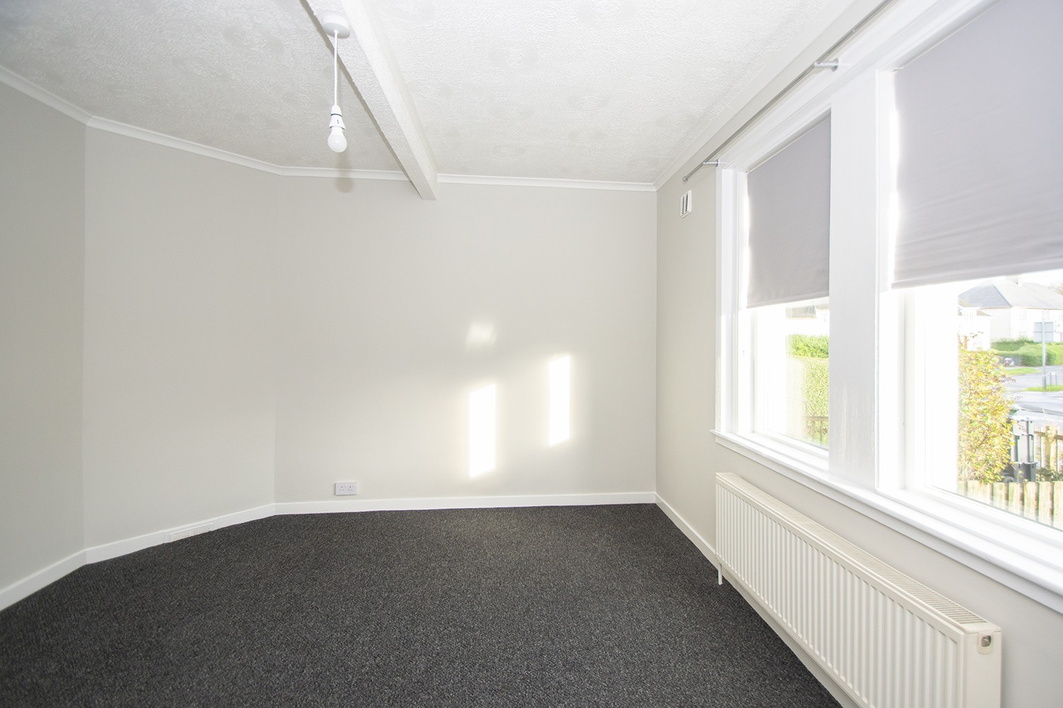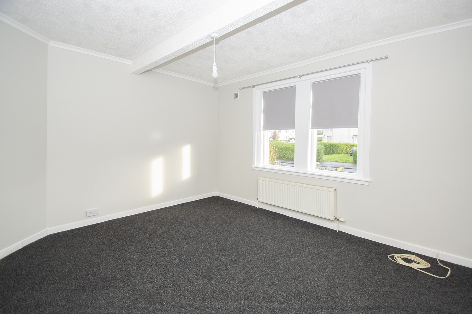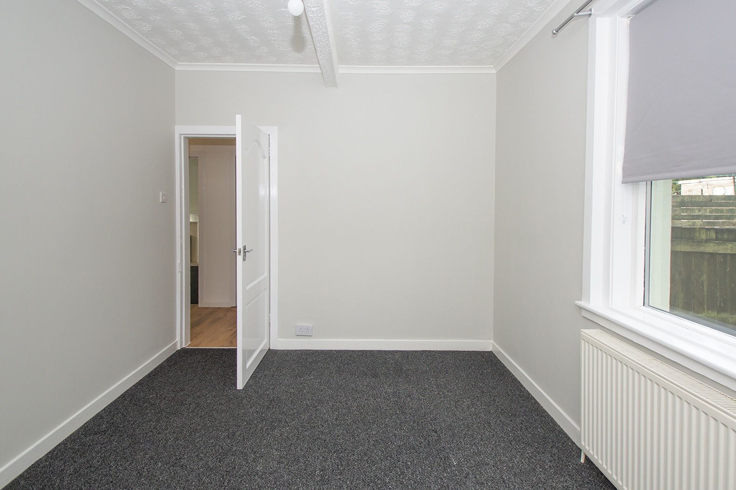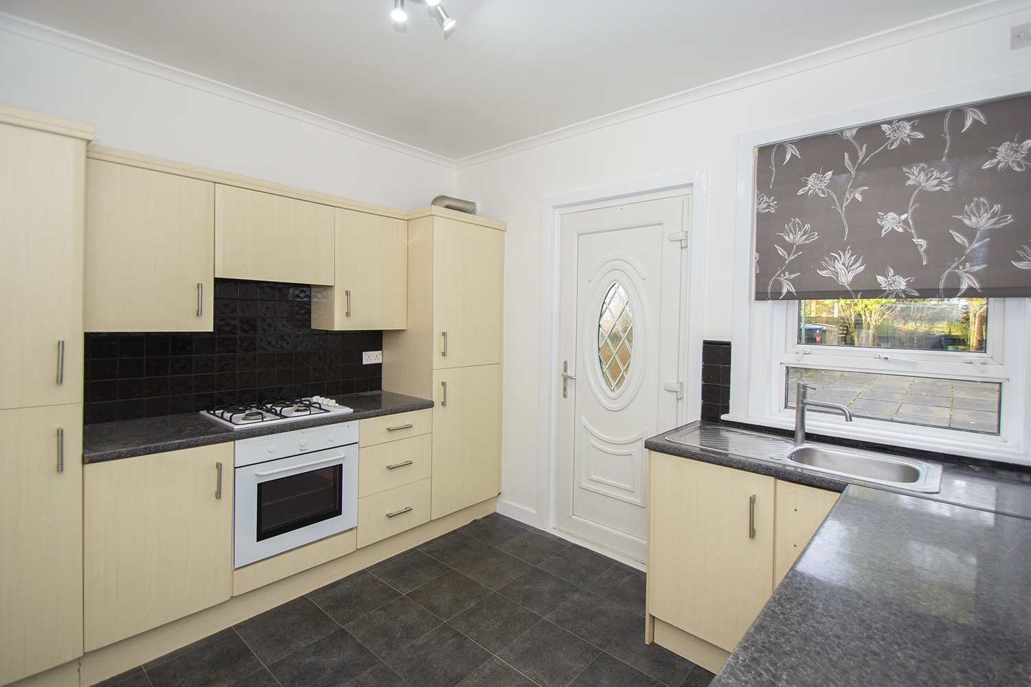The accommodation offers spacious living throughout and comprises welcoming entrance hallway, excellent sized lounge with feature inset electric fire with surround and twin front facing windows which allow an abundance of natural light to flow through. Rear facing fitted kitchen which houses an ample range of base and wall units with complementary worktops and tiles splash-back areas, integrated gas hob, electric oven and extractor hood and rear door which gives access to the garden area. Two well-proportioned double bedrooms. Three-piece bathroom comprising wc, wash hand basin and bath with overhead electric shower, tiled splash-back areas.