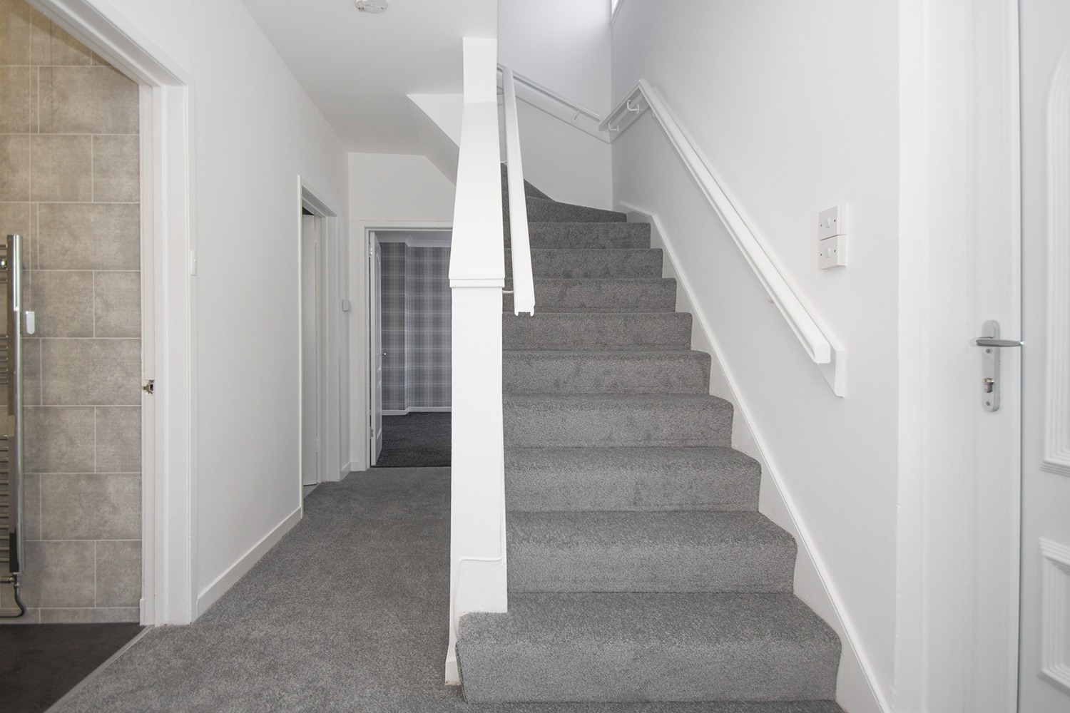 The property is set out over two levels with the lower level comprising of entrance hallway leading to front facing lounge, fully fitted kitchen housing an ample range of base and wall units with complementary worktops and tiled splash-back areas, integrated oven and hob, family bathroom comprising of w.c, wash hand basin and bath with overhead shower. Upper level comprising of 3 good sized bedrooms all with handy storage cupboards.
