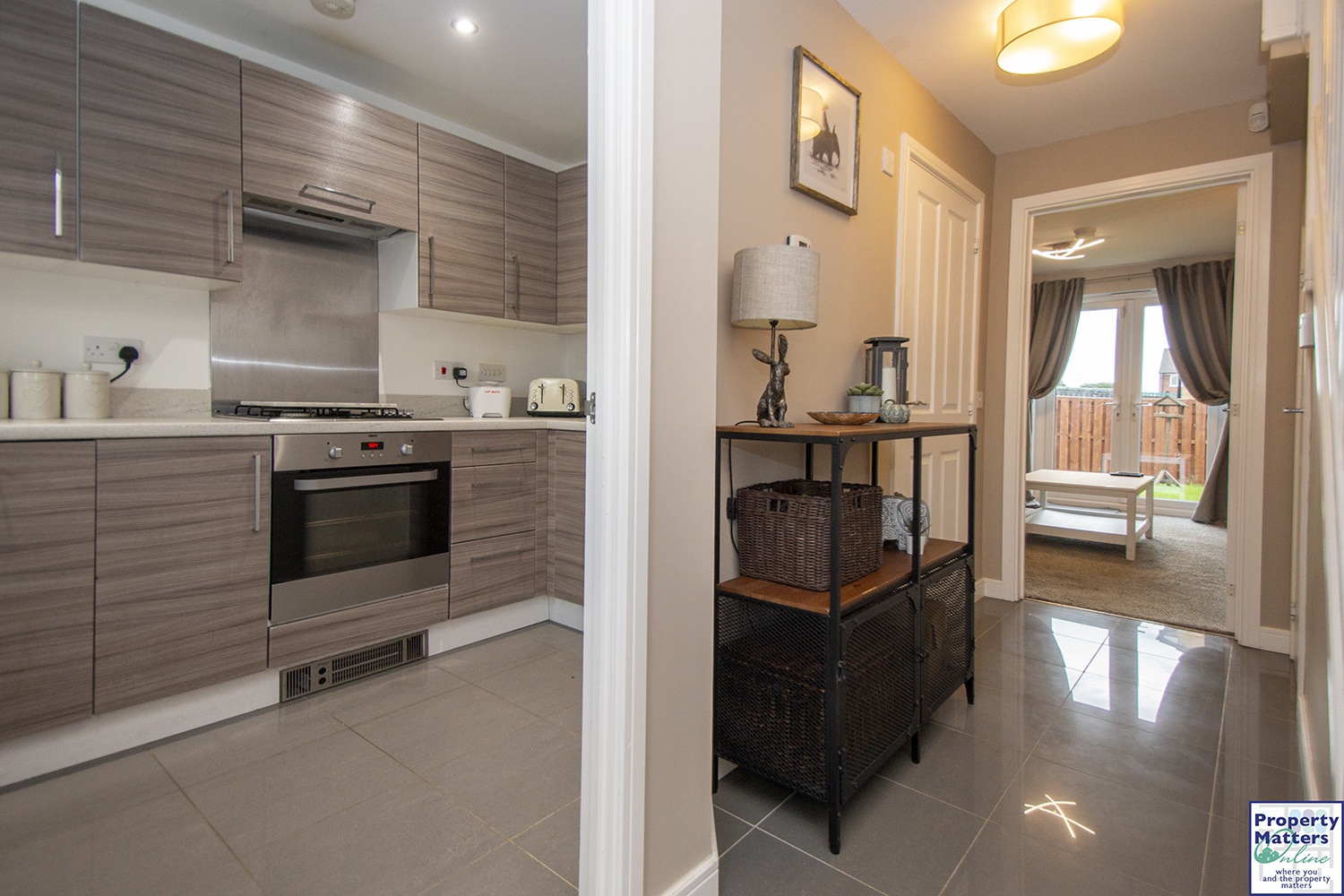 The accommodation consists of entrance hall with quality tiling giving access to all lower compartments, handy under stair storage, front facing quality kitchen with integrated appliances including oven, hob, dishwasher, washing machine and fridge freezer, handy downstairs wc, rear facing lounge with modern crisp décor and French doors giving access to rear garden.