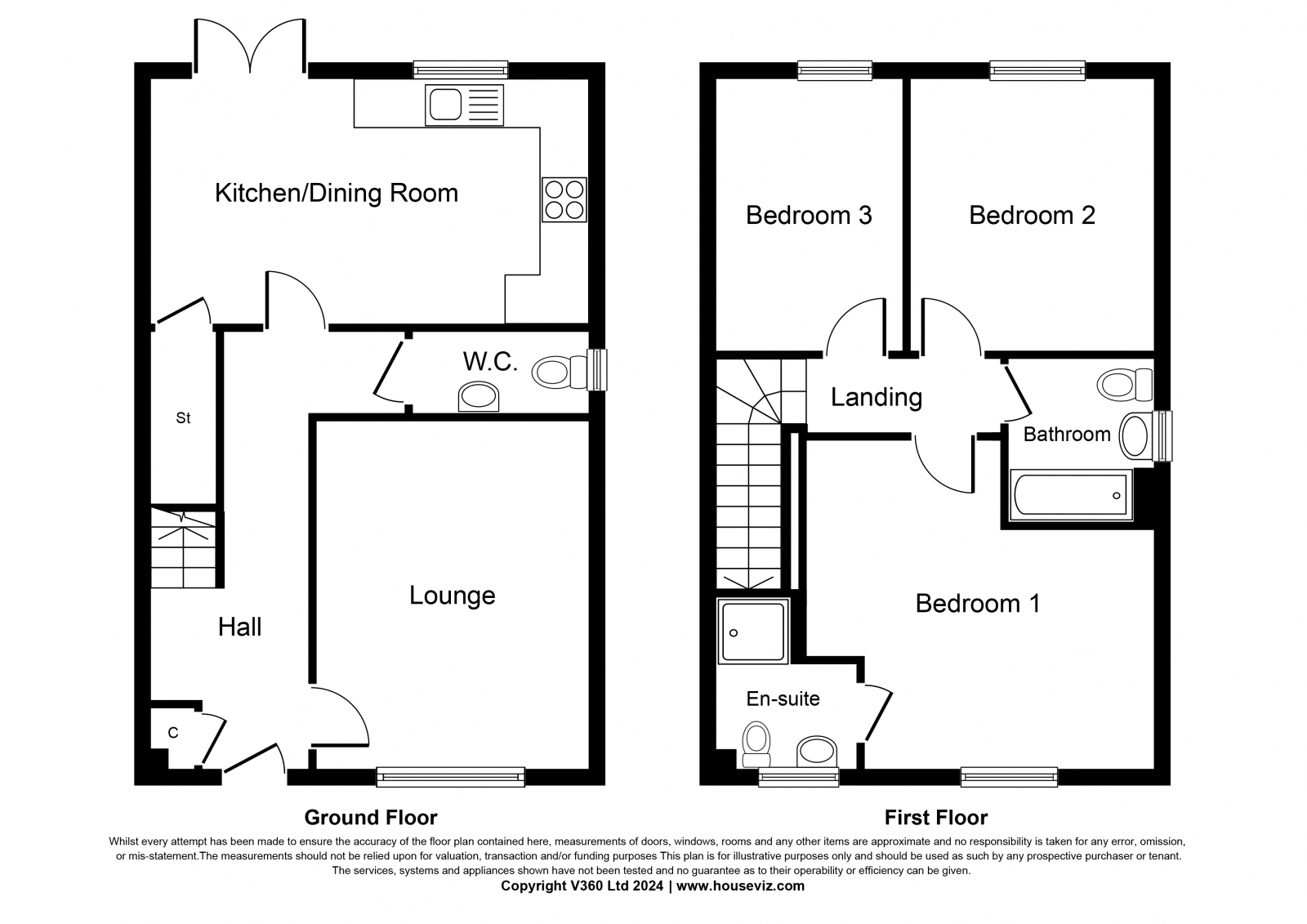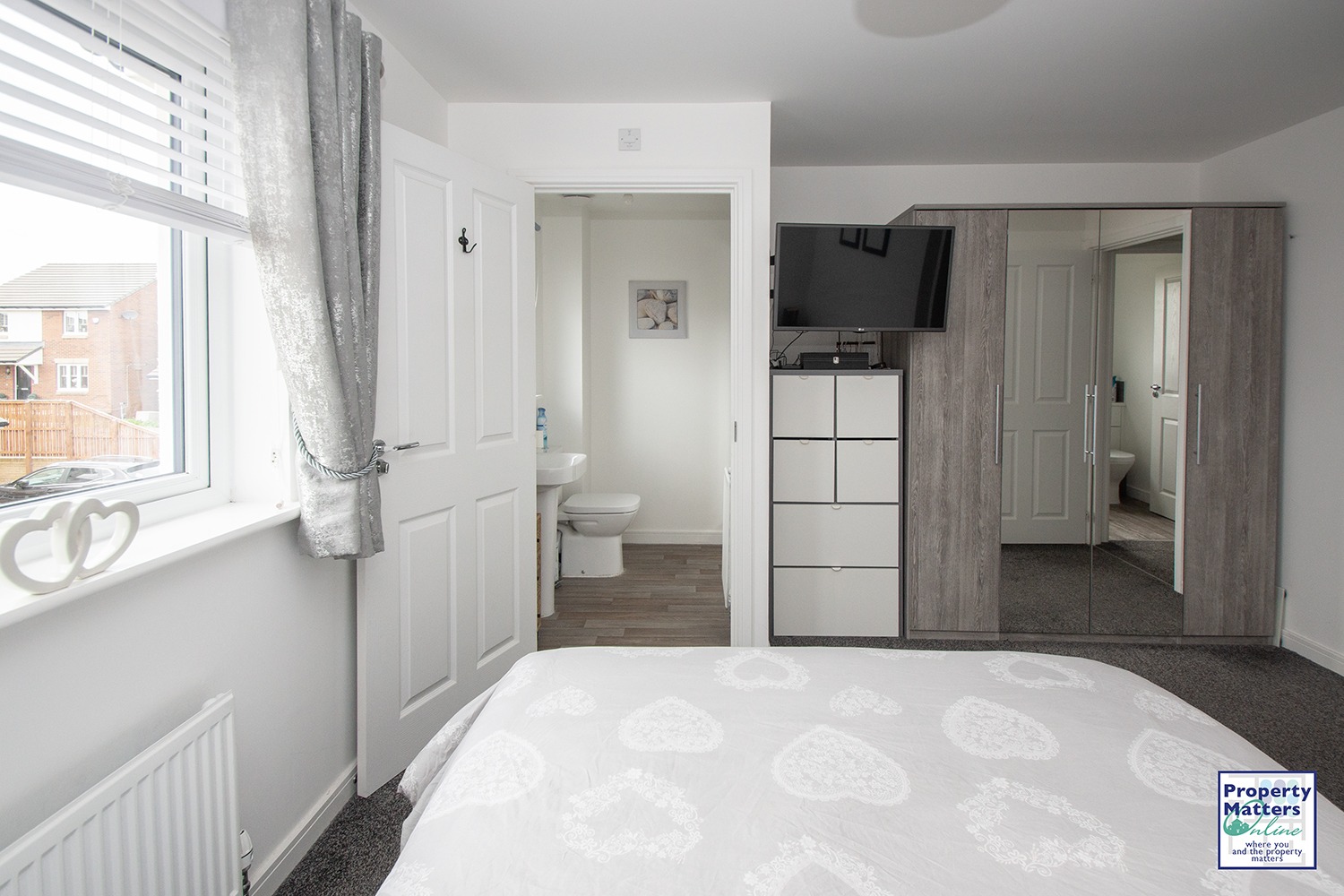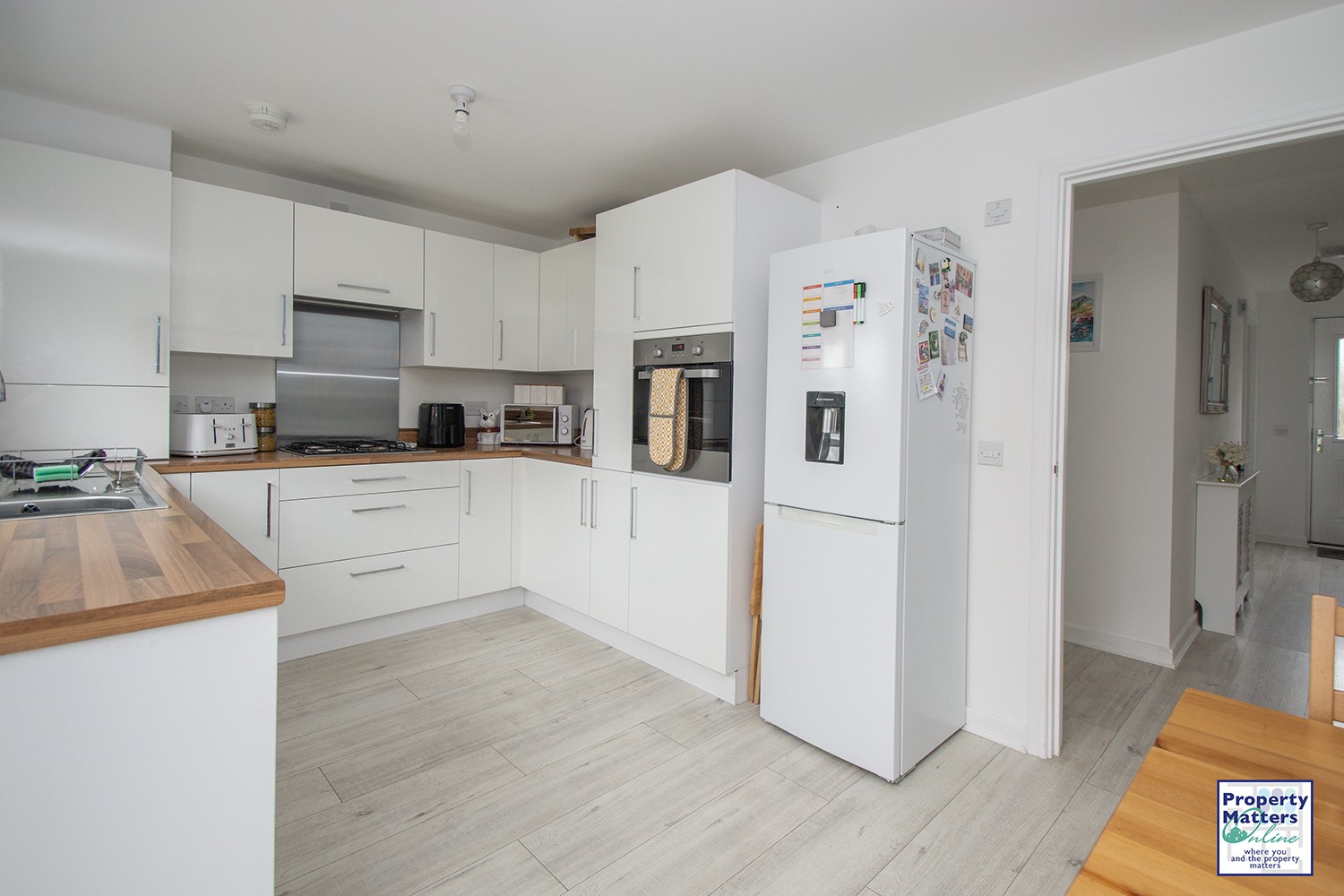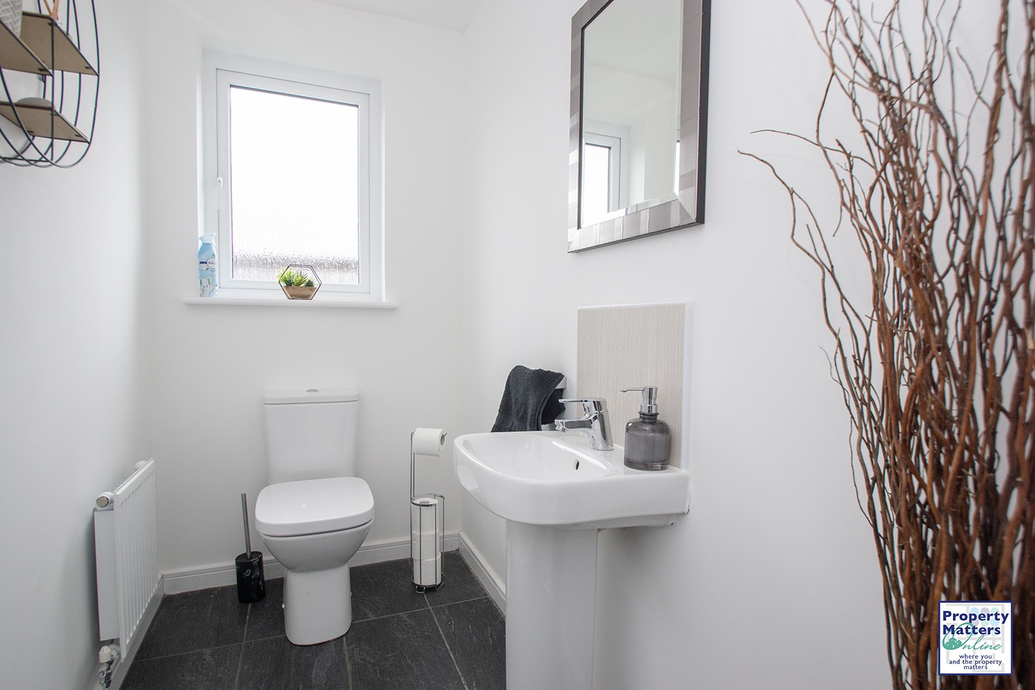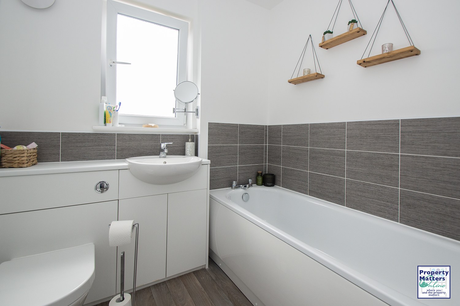 The property consists of an entrance hallway which gives access to a good-sized front facing lounge with open outlook. Rear facing dining kitchen which houses a range of wall and base units with complementary worktops and upstands, integrated gas hob, electric oven and extractor fan, and plumbing for dishwasher and washing machine. Handy downstairs cloak room with two-piece suite comprising of wash hand basin and w.c. The first floor consists of main bedroom with ensuite shower room, and a further two good sized bedrooms. Modern family bathroom comprising w.c, wash hand basin and bath with modern tiling