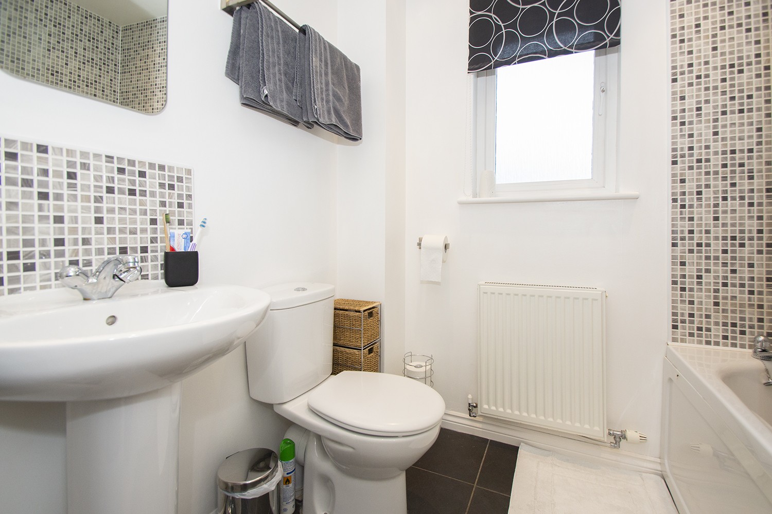 Modern 3-piece bathroom suite comprising WC, wash hand basin with and bath with shower.tiled flooring and splashback. Chrome towel rail. Rear facing opaque window.