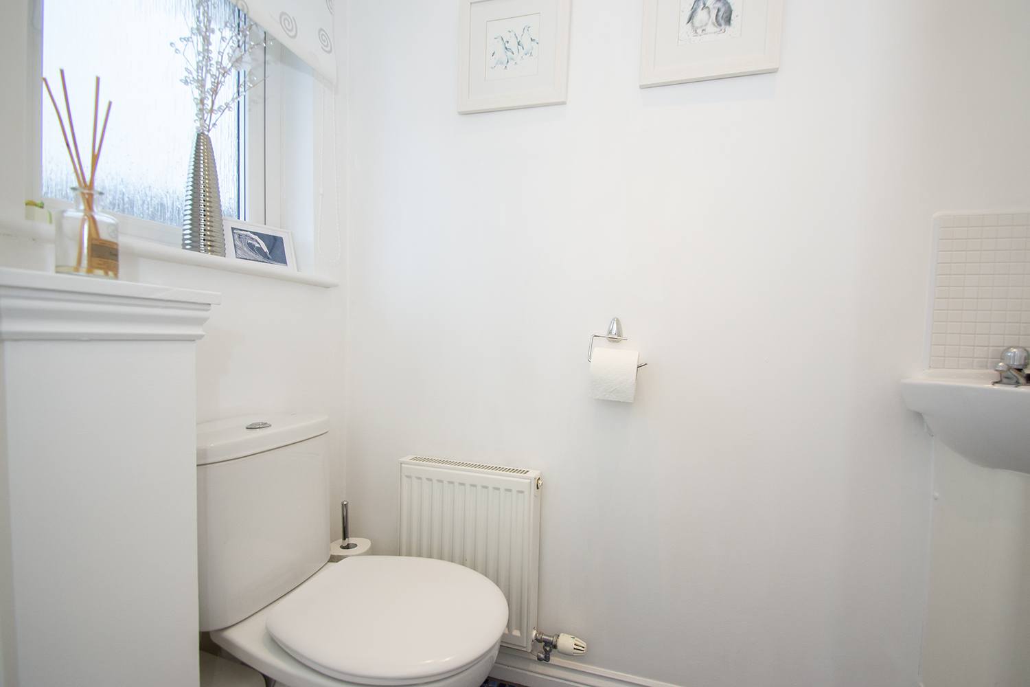 Modern 2 piece suite comprising WC and wash hand basin with modern décor. Tiled flooring. Front facing opaque window.
