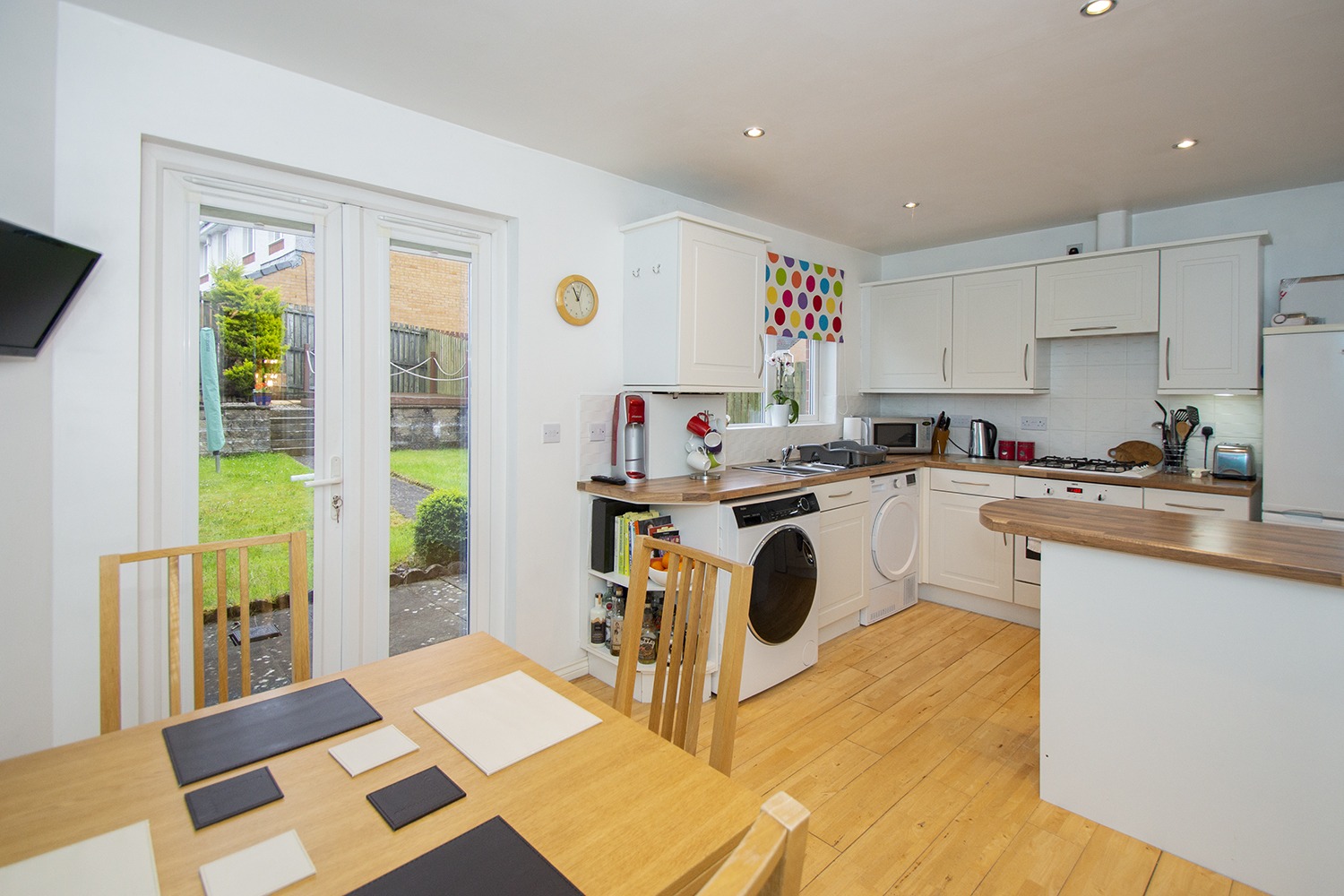 Entered from the lounge, there is a well-proportioned kitchen and dining area with a good range of base and wall units, with complementary worktops and splash-back areas. Breakfast bar area with units. The property benefits from integrated appliances including electric oven and gas hob with extractor, plumbing for automatic washing machine. Inset stainless steel sink with mono tap. Solid wood flooring. Handy large under stair storage cupboard. French doors leading to the rear garden; rear facing window and ample power points.