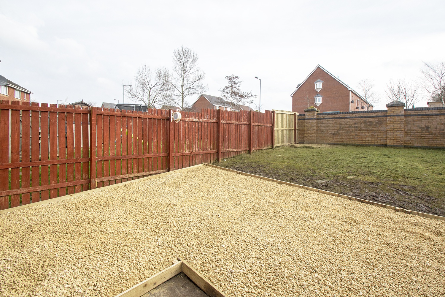 Lawn area to the front and tarmacadam driveway to the side. Fully enclosed rear garden with lawn and chipped areas.