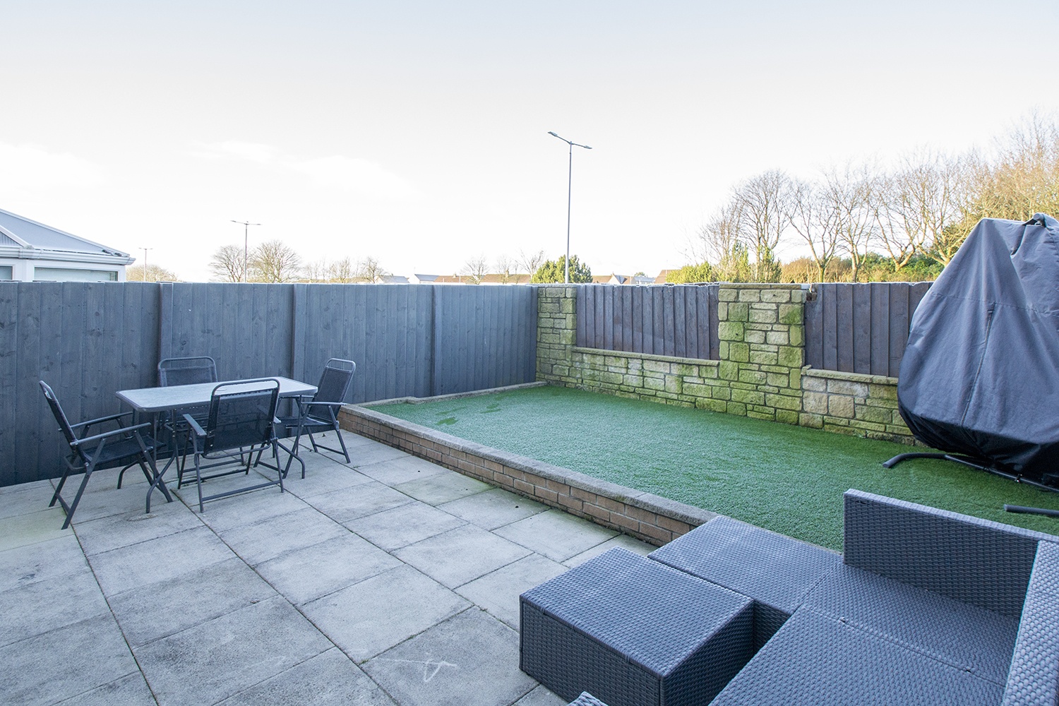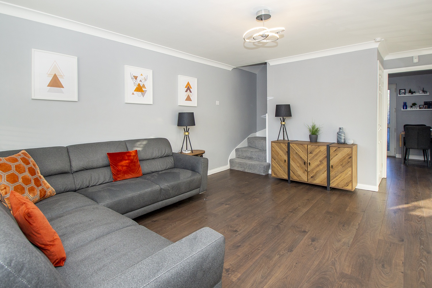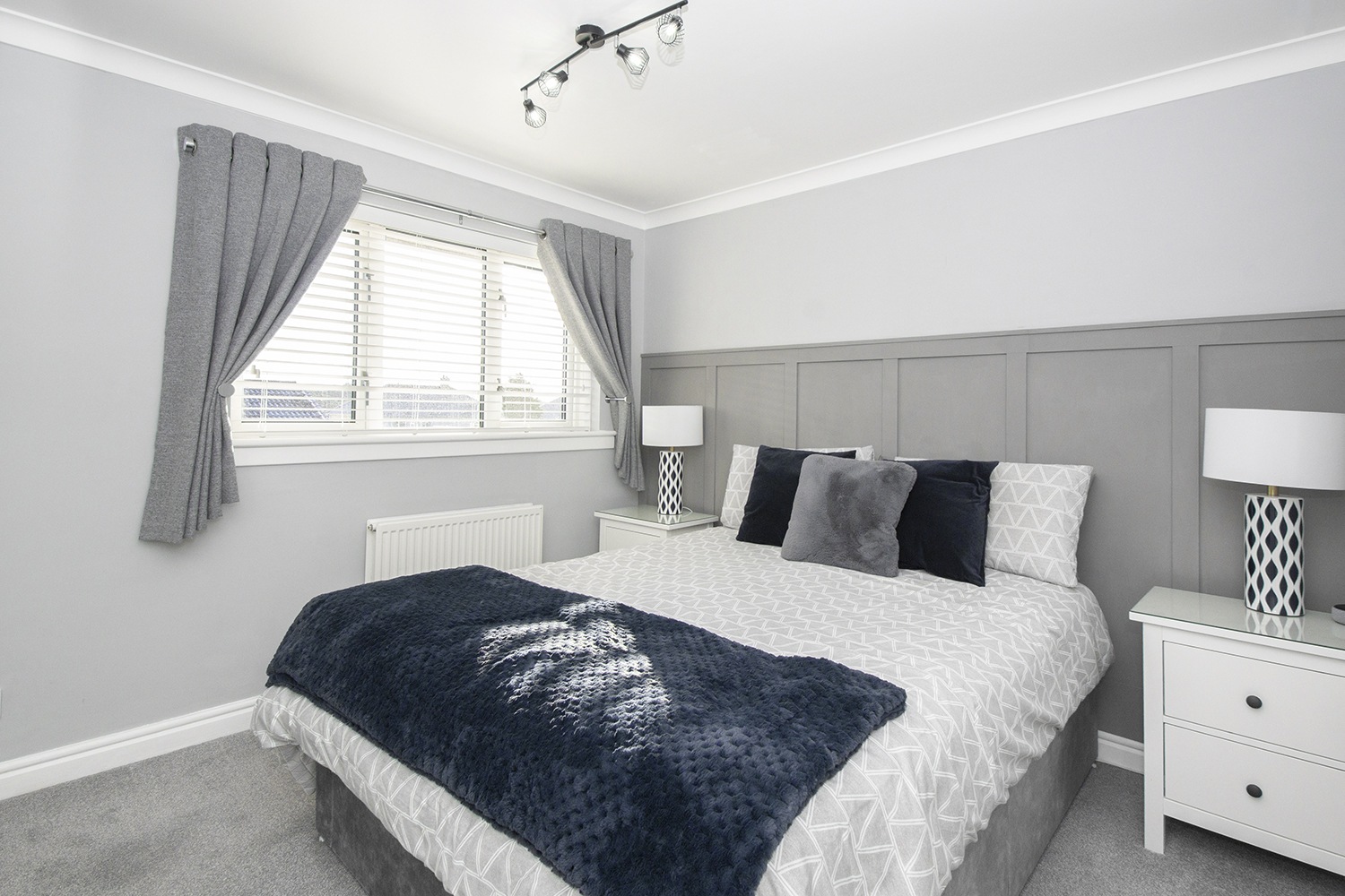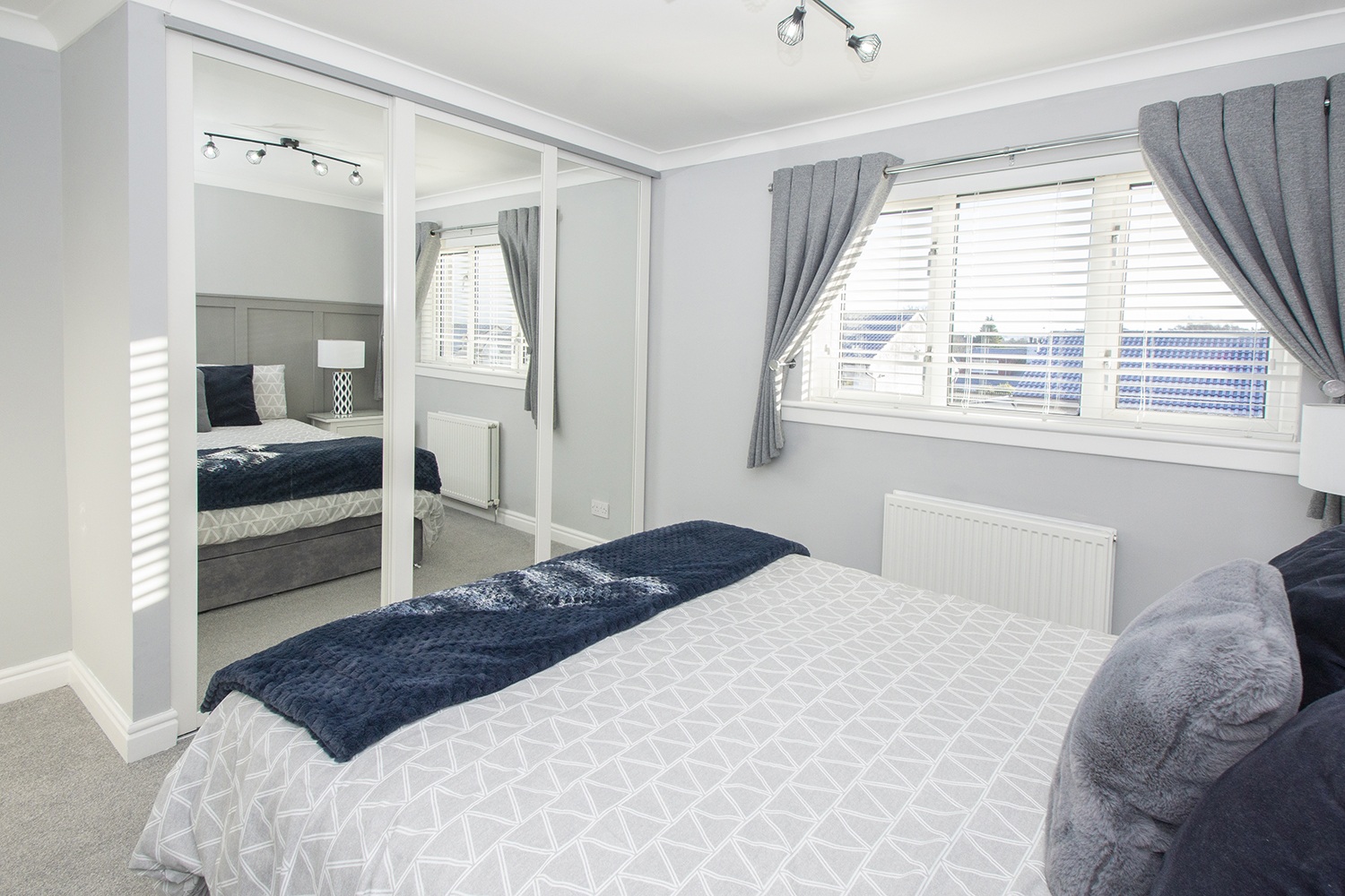 This modern home is ideally laid out over two levels comprising porch; well-proportioned front facing lounge; fitted kitchen housing an ample range of base and wall units with complementary worktops and tiled splash-back areas, integrated oven and gas hob. The upper level accommodation houses the front facing master bedroom with fitted wardrobes and rear facing 2nd bedroom also with fitted wardrobes. Three-piece family bathroom comprising of w.c, wash hand basin and bath with overhead rainfall effect shower.