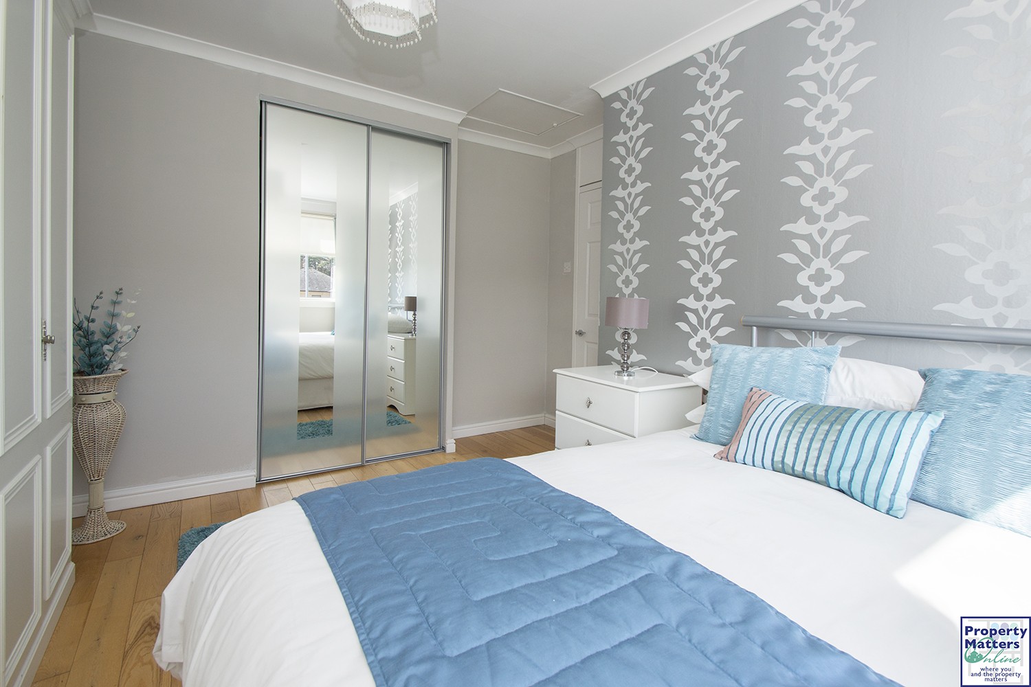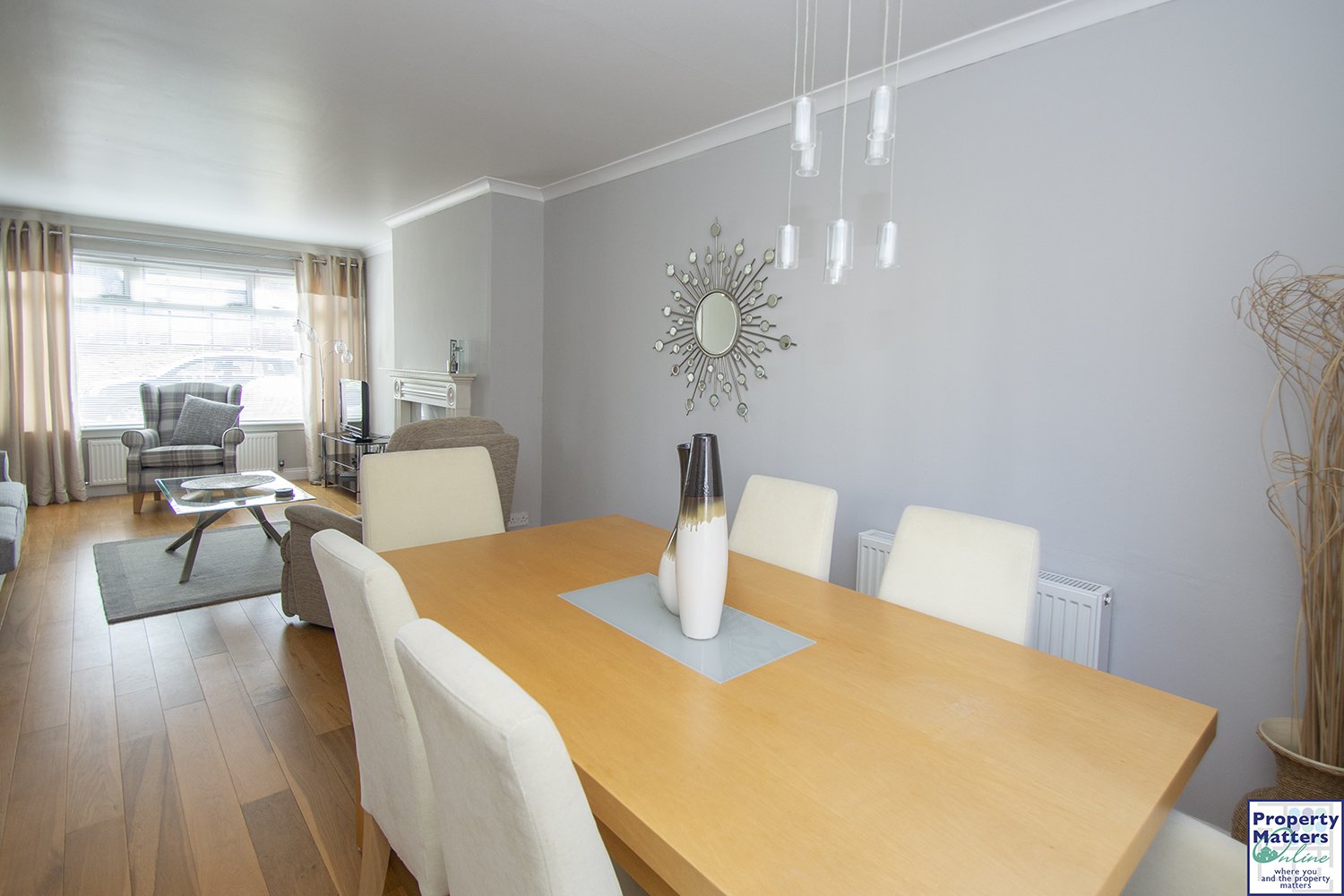 This lovely family home is presented in excellent condition throughout and is formed over two levels with the lower level comprising welcoming entrance hallway, twin aspect lounge diner with patio doors leading to the rear garden, quality fitted kitchen which houses an ample range of base and wall units with complementary worktops and tiled splash-back areas, integrated gas hob and twin ovens, integrated fridge freezer and washing machine. The upper-level accommodation houses the three good sized bedrooms two with fitted wardrobes, and three-piece contemporary shower room.
