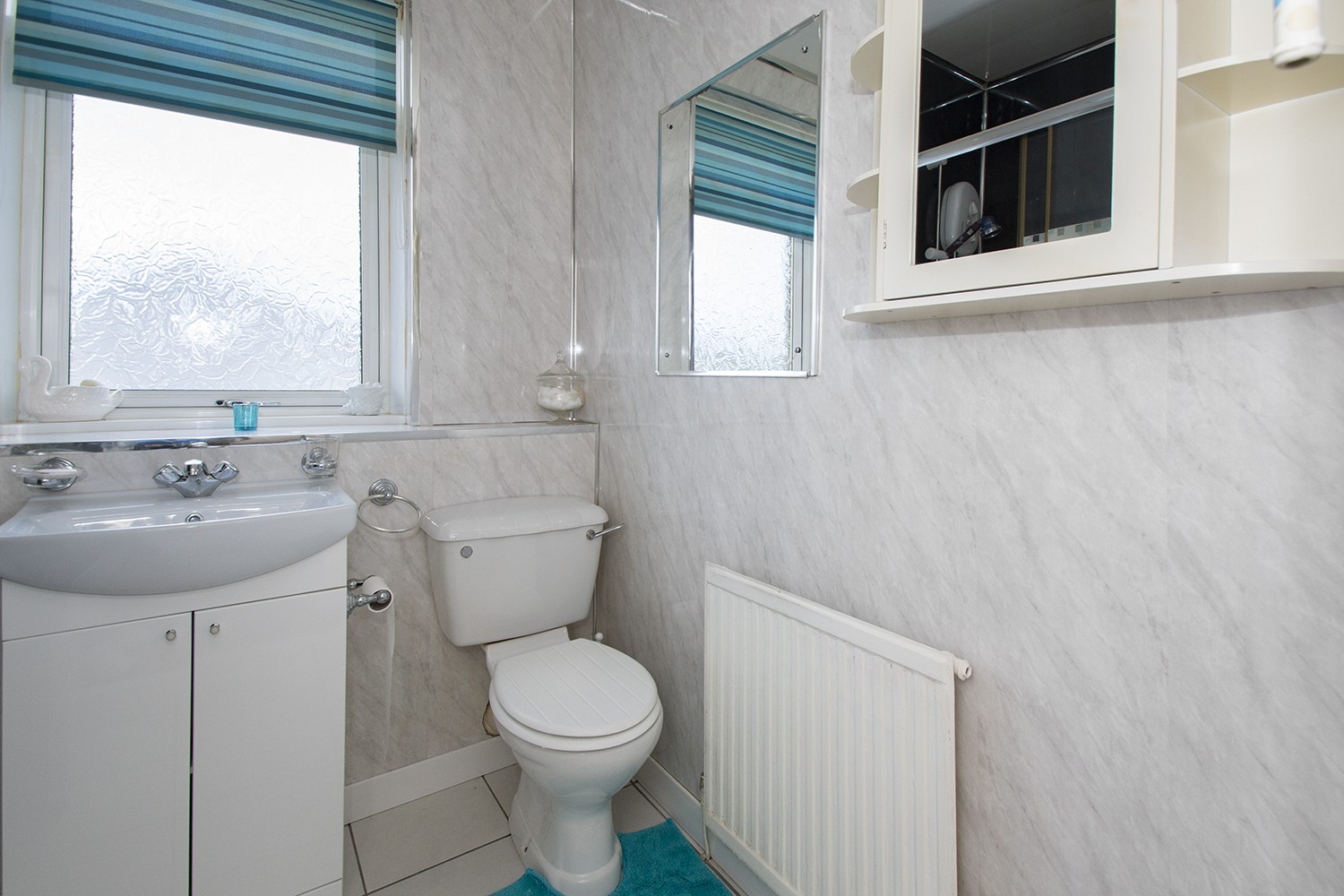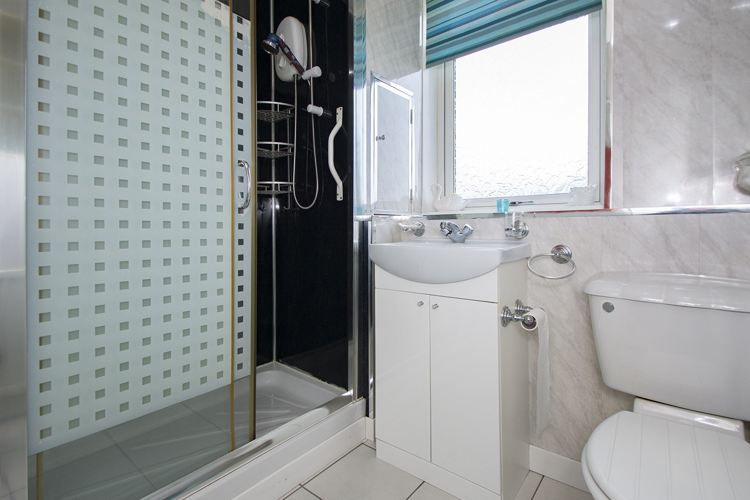 Contemporary shower room comprises 3-piece suite comprising wc and wash hand basin with vanity units, and shower enclosure. Rear facing window formation.