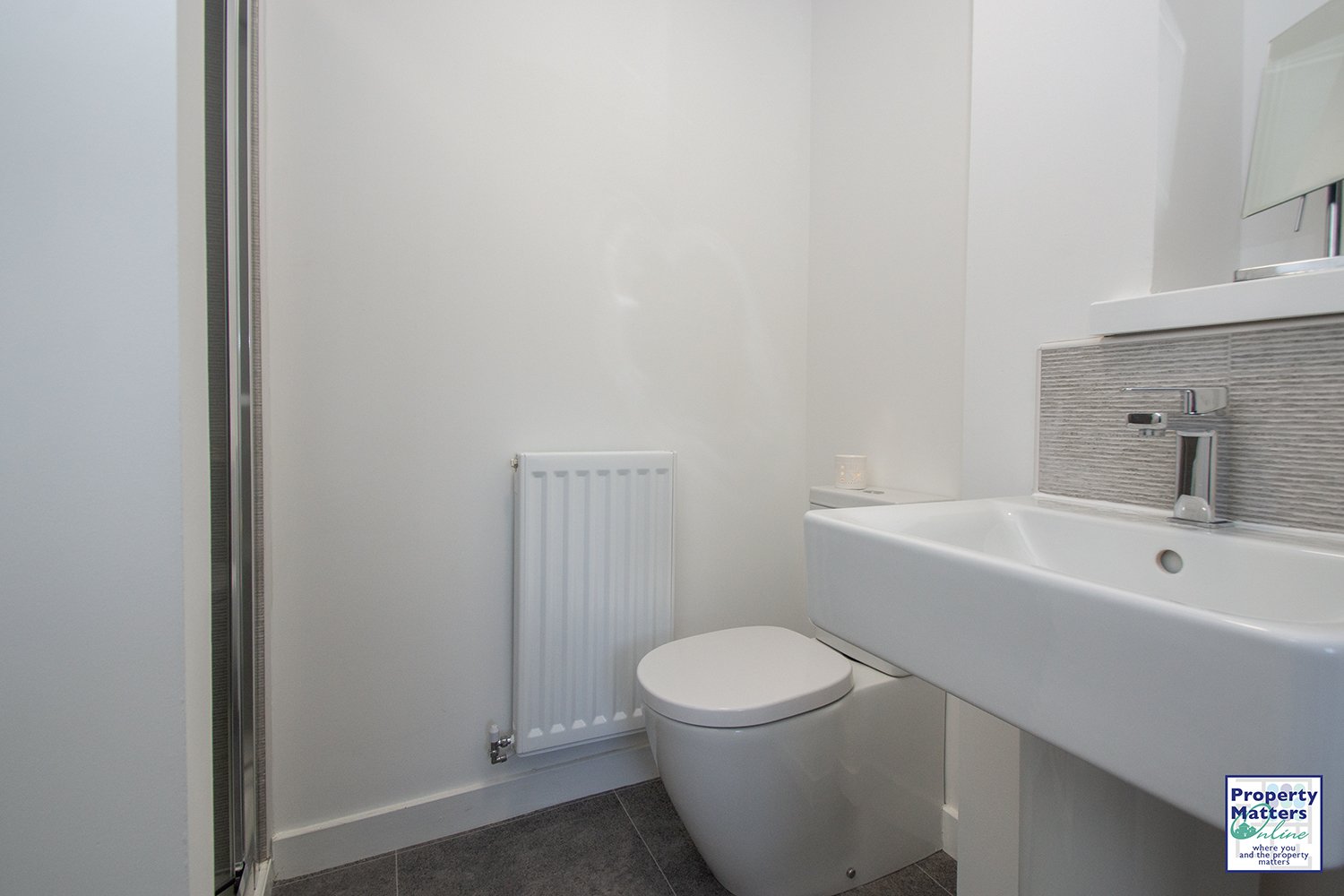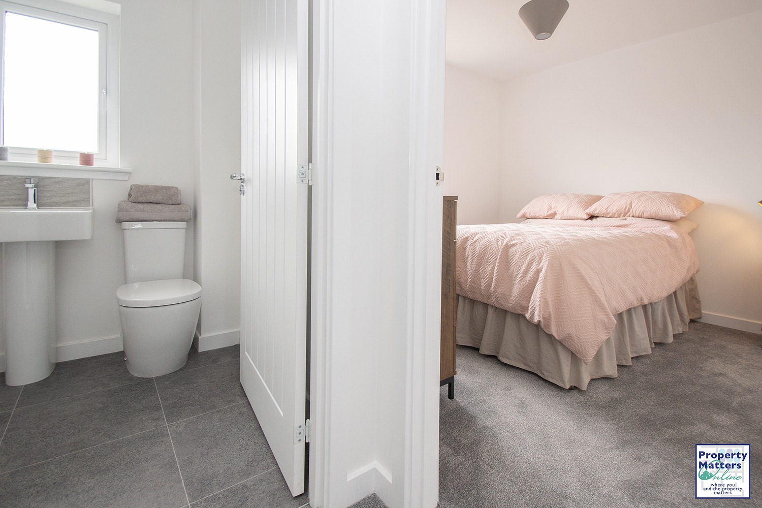 On the upper level is the hallway with storage cupboard, main bedroom with double build-in wardrobe and ensuite, as well as a further two bedrooms. Contemporary three-piece bathroom comprising wc, wash hand basin and bath.