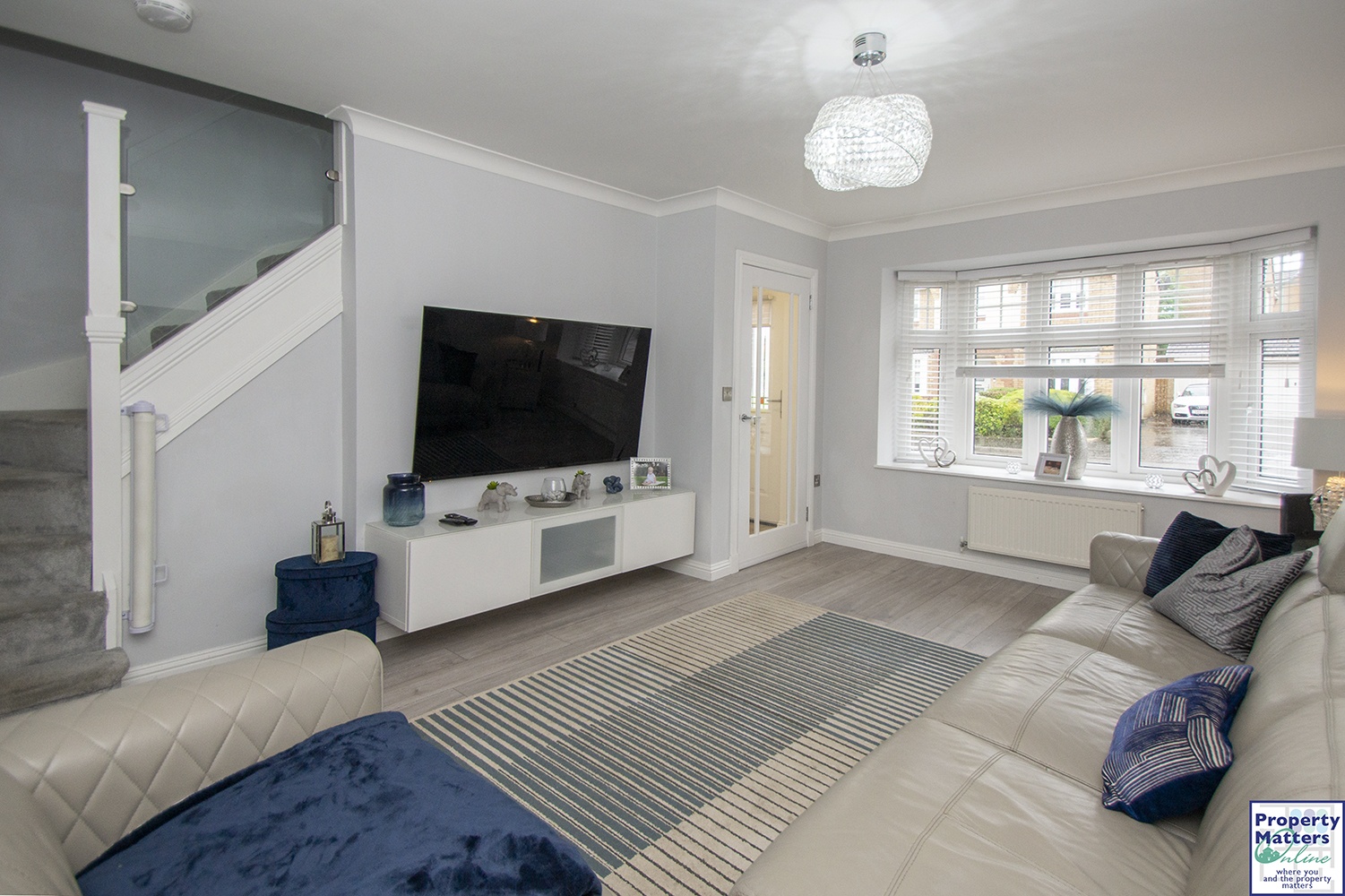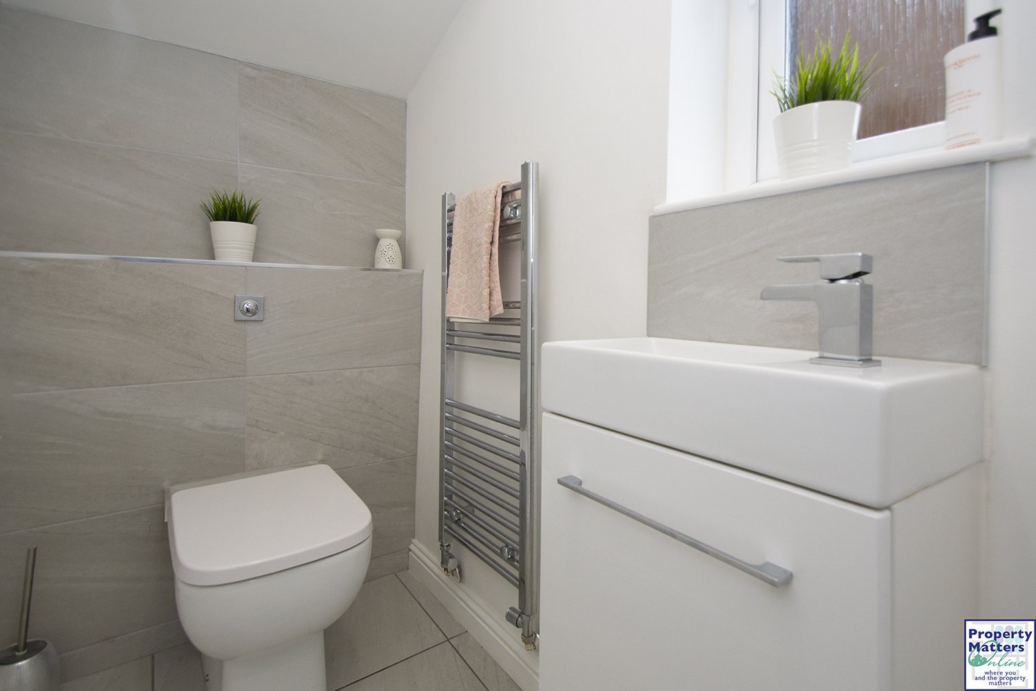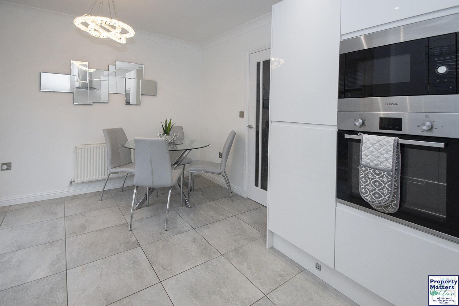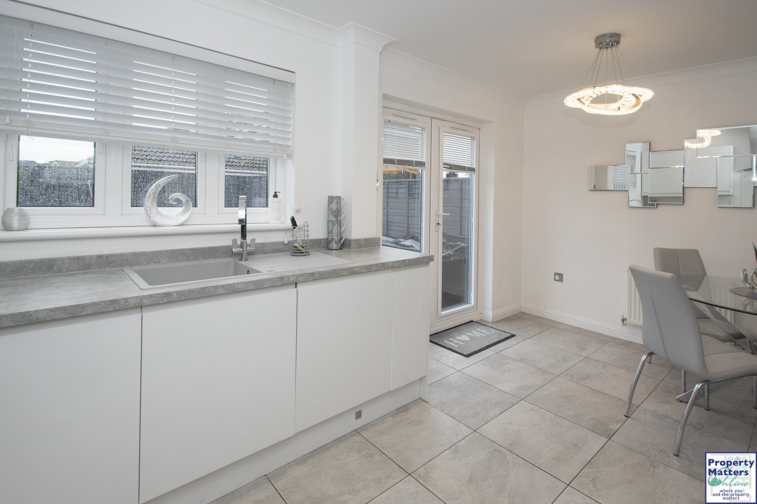 The accommodation is laid out over two levels with the lower level comprising welcoming entrance hallway; well-proportioned front facing lounge with modern decor; contemporary dining kitchen housing an ample range of base and wall units with complementary worktops. The kitchen benefits from integrated appliances including oven, hob, microwave, dishwasher, fridge freezer and washing machine. Handy downstairs w.c. The upper-level accommodation houses the main bedroom with large walk-in dressing cupboard (previously an en suite) as well as two further bedrooms and modern family bathroom. Driveway leading to garage at front and fully enclosed landscaped rear gardens which is an ideal spot for relaxation and entertainment.