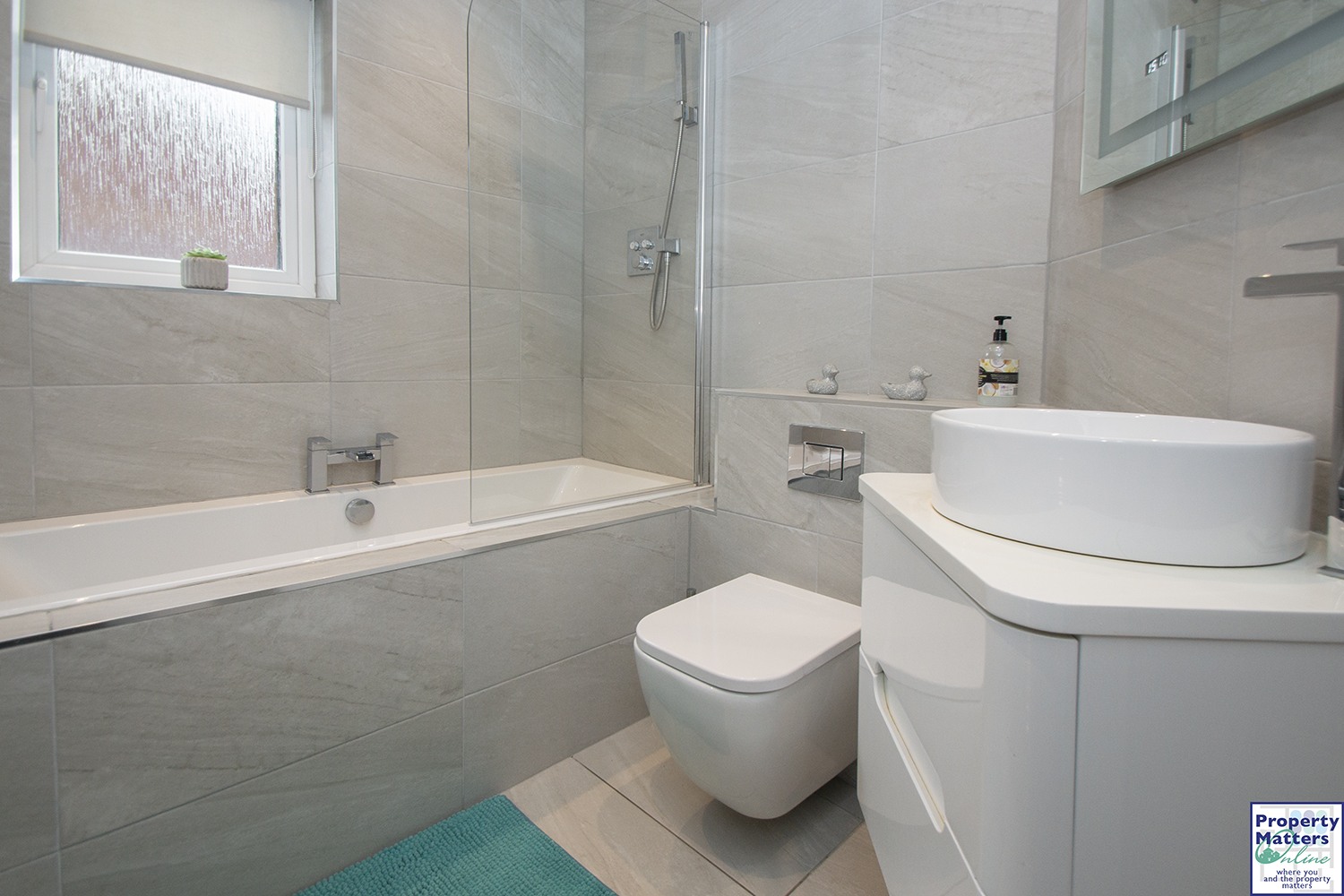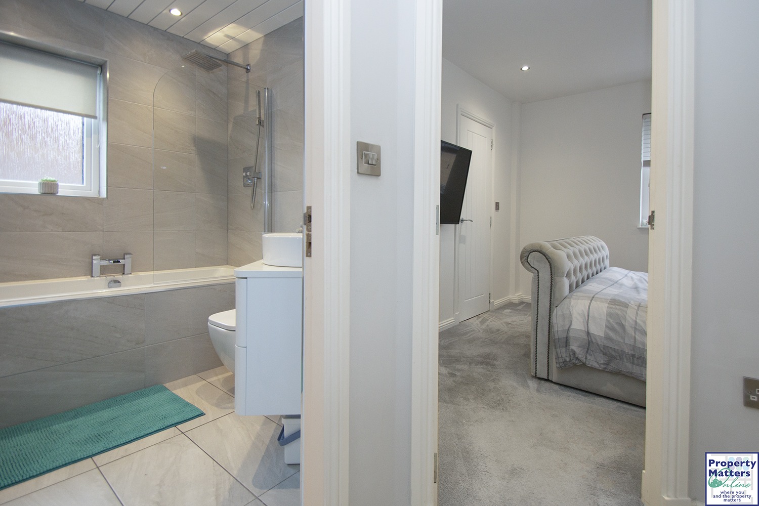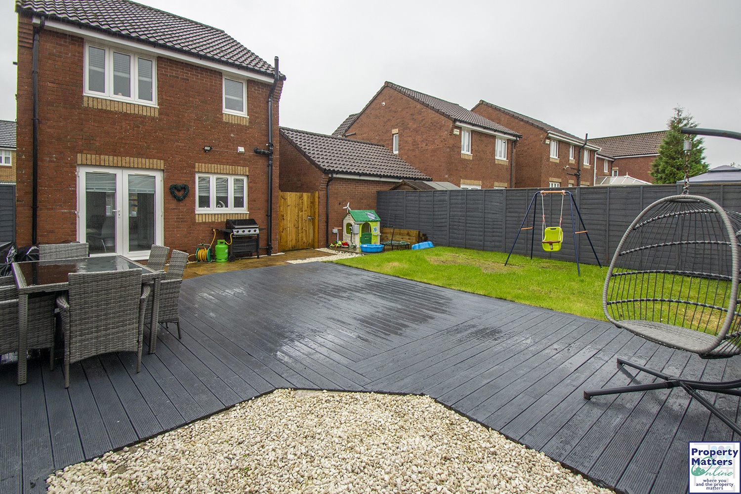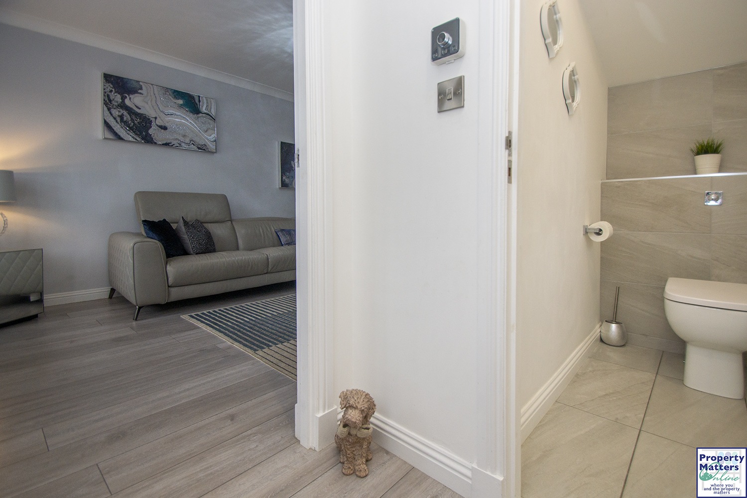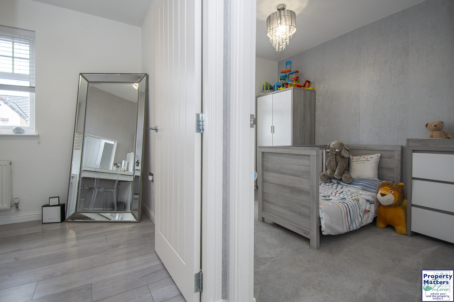 The accommodation is laid out over two levels with the lower level comprising welcoming entrance hallway; well-proportioned front facing lounge with modern decor; contemporary dining kitchen housing an ample range of base and wall units with complementary worktops. The kitchen benefits from integrated appliances including oven, hob, microwave, dishwasher, fridge freezer and washing machine. Handy downstairs w.c. The upper-level accommodation houses the main bedroom with large walk-in dressing cupboard (previously an en suite) as well as two further bedrooms and modern family bathroom. Driveway leading to garage at front and fully enclosed landscaped rear gardens which is an ideal spot for relaxation and entertainment.